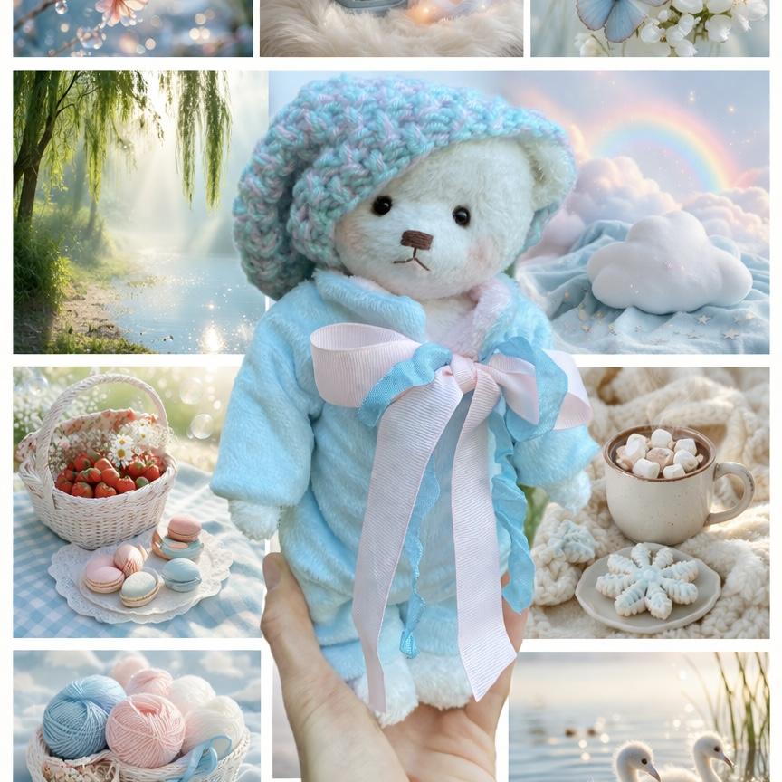 Очень нежный и трогательный медвежонок-гномик, словно пришедший из доброй детской сказки. В его мягком взгляде и уютном костюмчике есть что-то очень тёплое и спокойное — как воспоминание о беззаботном детстве.