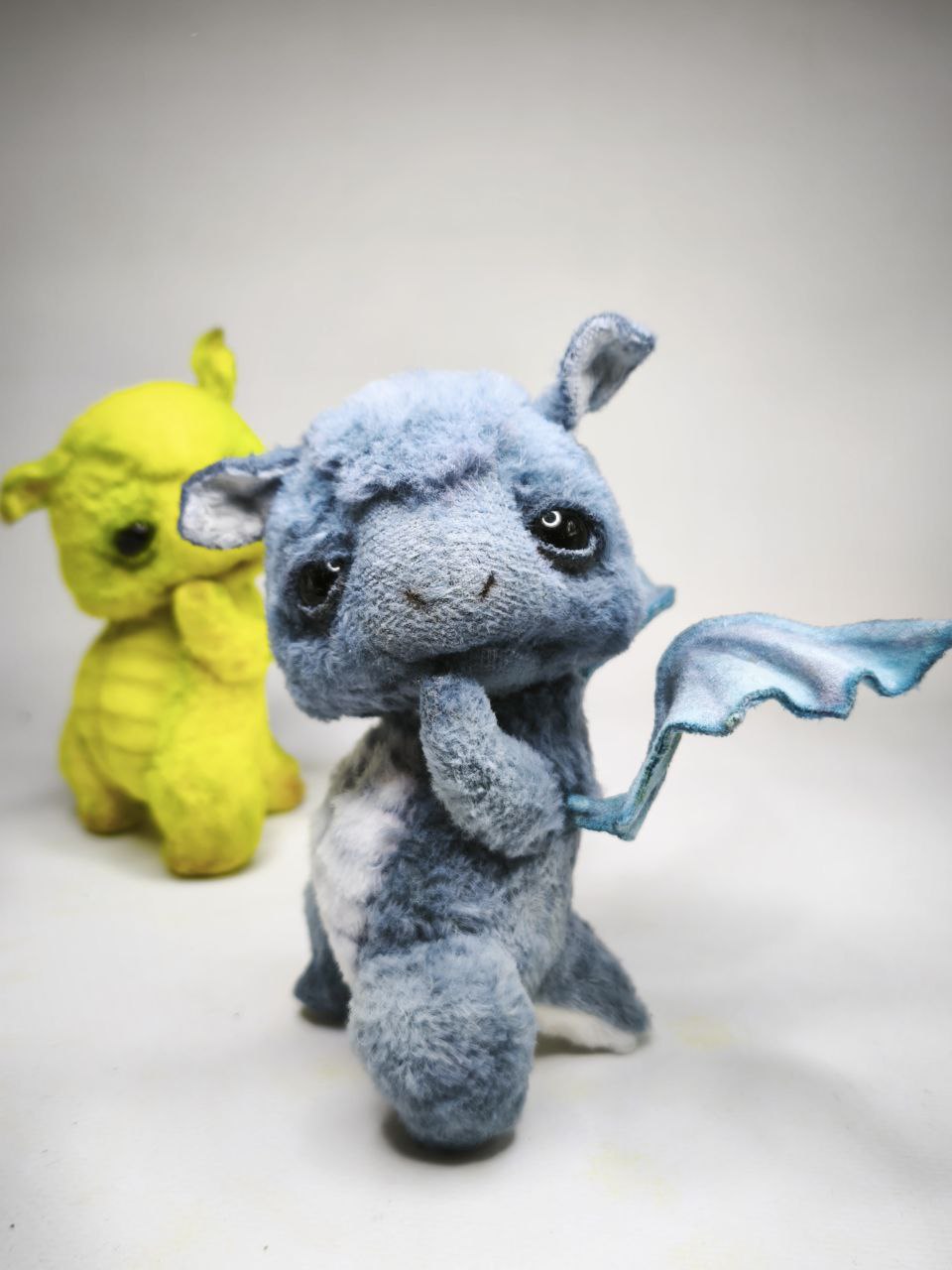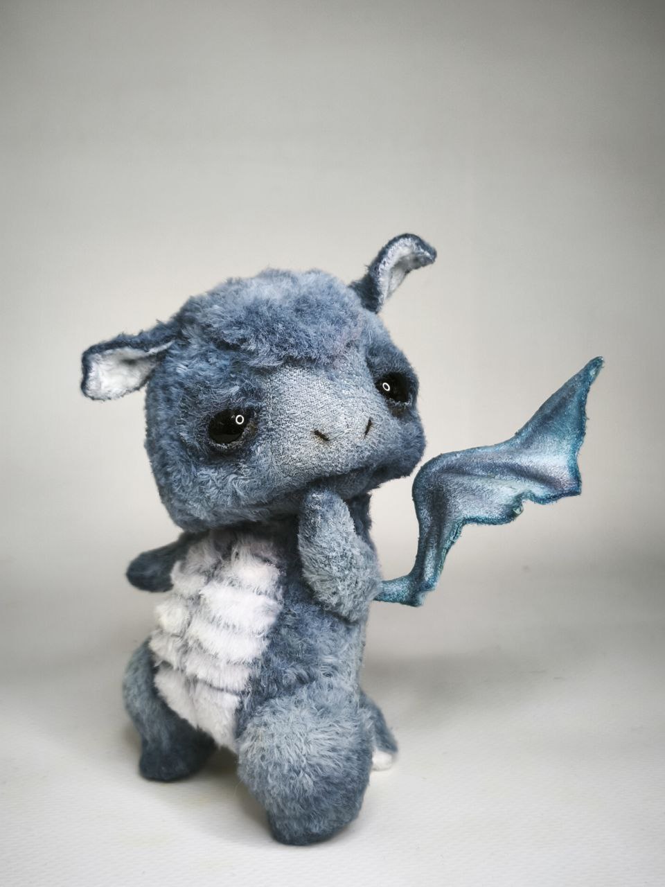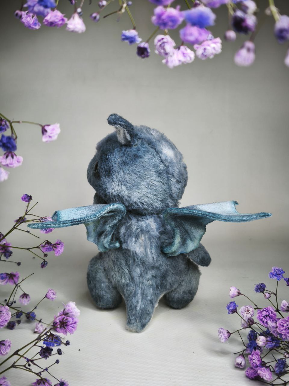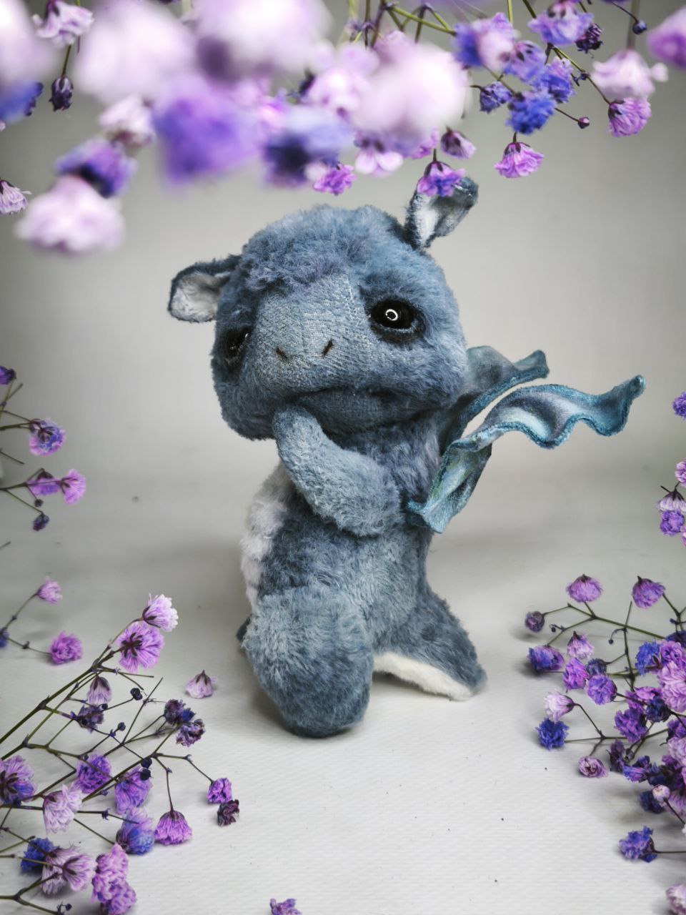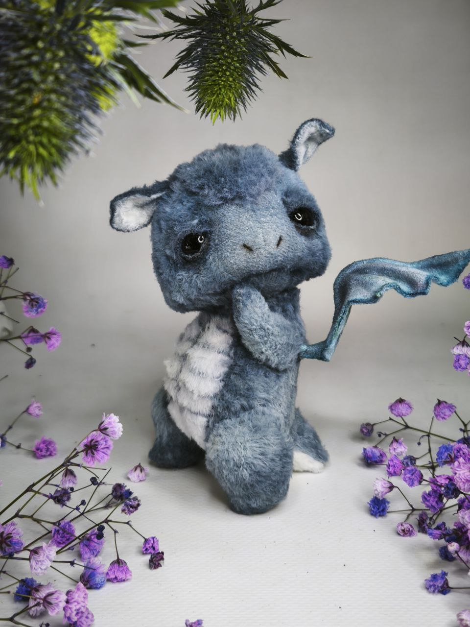 Коллекционные интерьерные игрушки. Черничный Дракоша, ягодная серия, рост 11,5 см выполнен из вискозы Италия ручной окраски, наполнитель древесные опилки, гранулят стекло. Глазки стекло, веки подвижные. Шплинтовое крепление, ручки, ножки, голова подвижные.