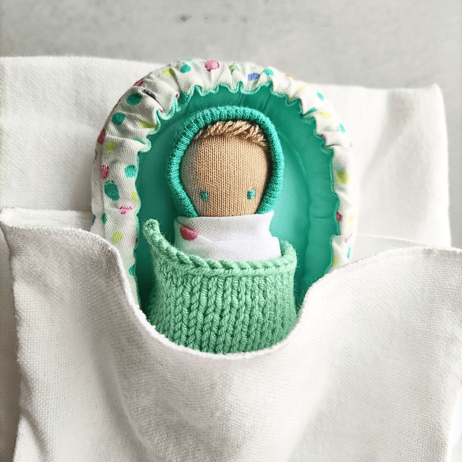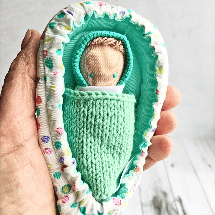 Крошка в ладошке сшита в стиле Вальдорфской игрушки, кокон двухсторонний, набит холлофайбером, одеяльце связано из х/б ниток, пеленка и шапочка у крошки пришиты к телу, не снимаются. В комплект входит фланелевый мешочек.