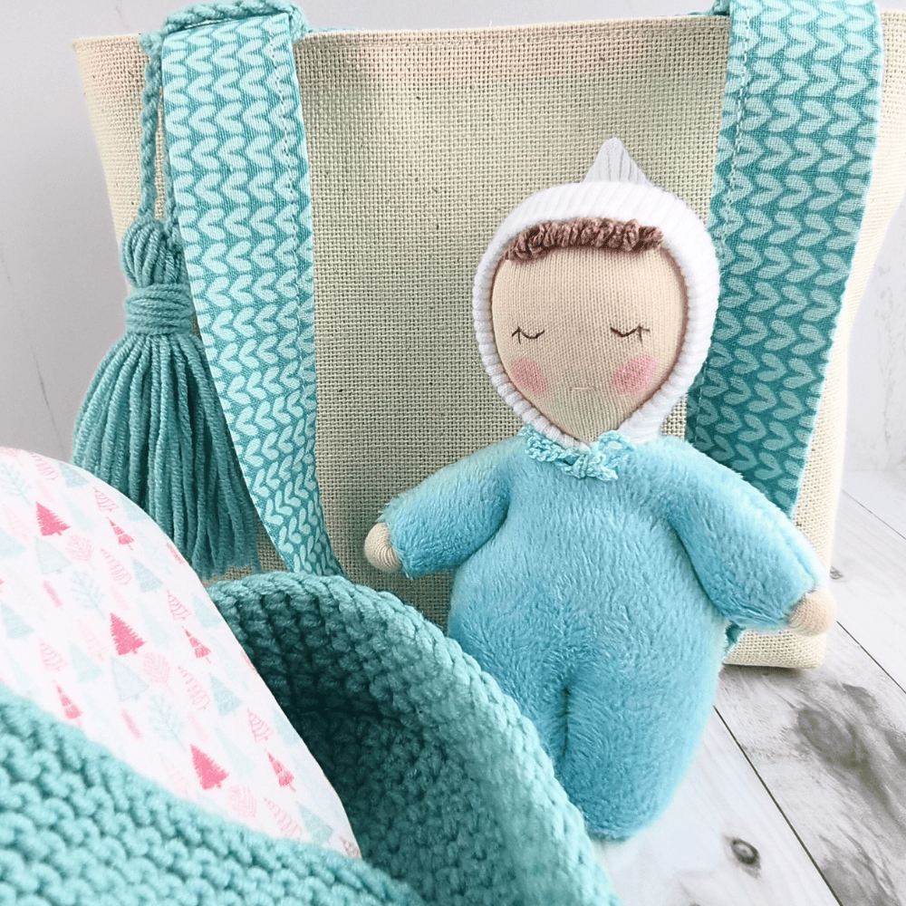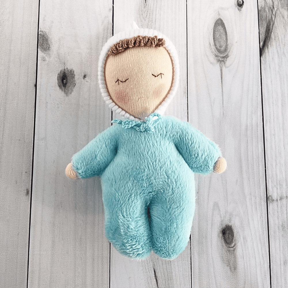 Ляля в колыбельке выполнена в бирюзовом цвете, приятная на ощупь, пластична, сшита по мотивам вальдорфской куклы