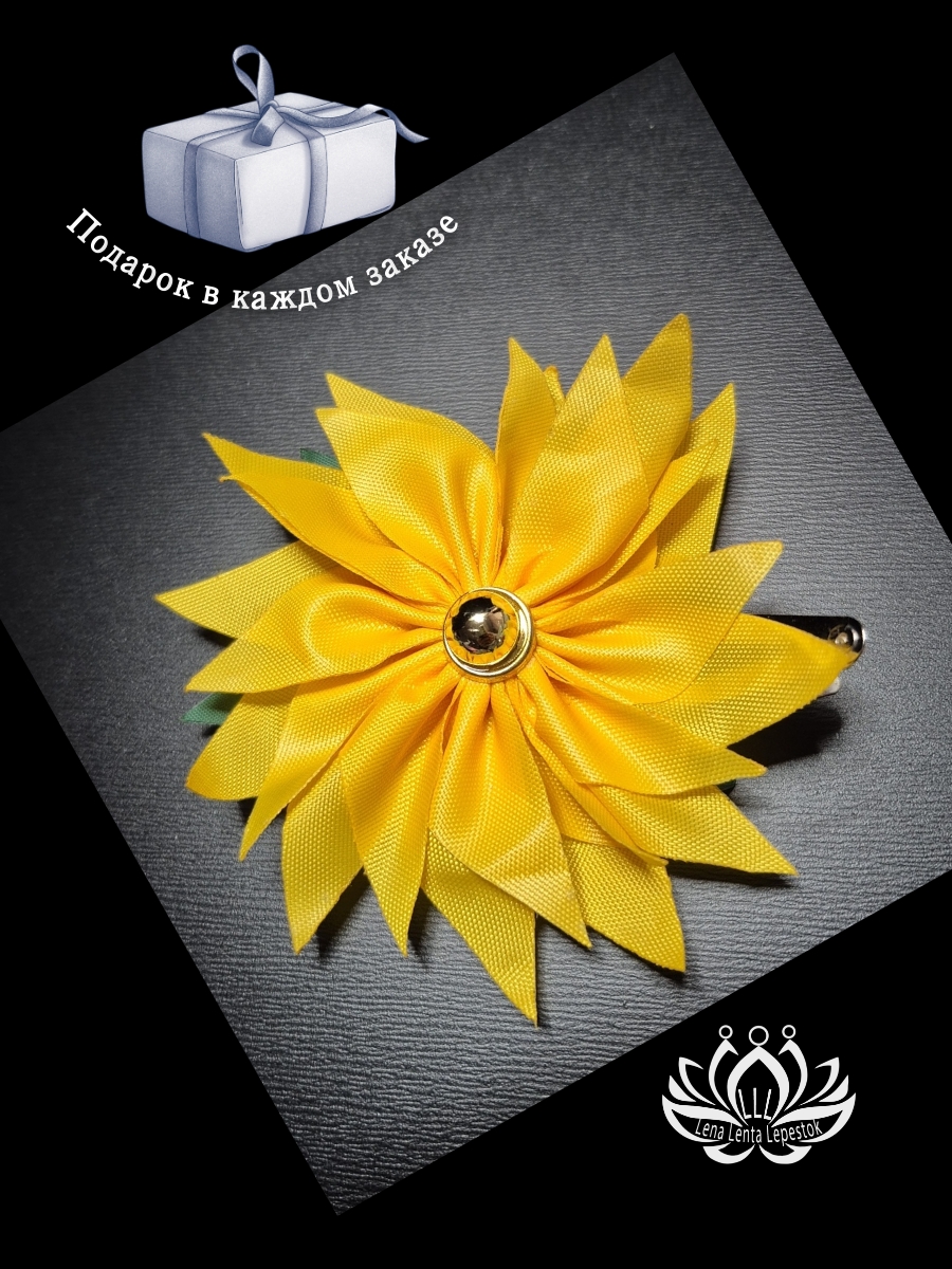 LenaLentaLepestok представляет: Заколка для волос ручной работы "Цветок" жёлтый. Единственный экземпляр. Цветы Канзаши на волосы Ваши. Материалы: ткань непромакаемая, декор;