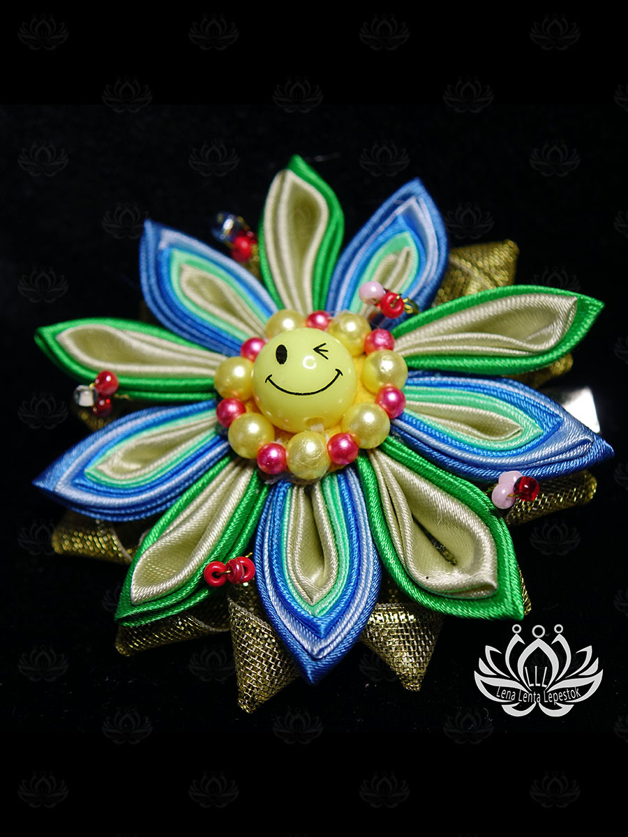 Выполнена в волшебной технике Канзаши, эта заколка - настоящее произведение искусства. Представьте себе: семь ярких лепестков, словно лучи солнца. Ах, как это мило!