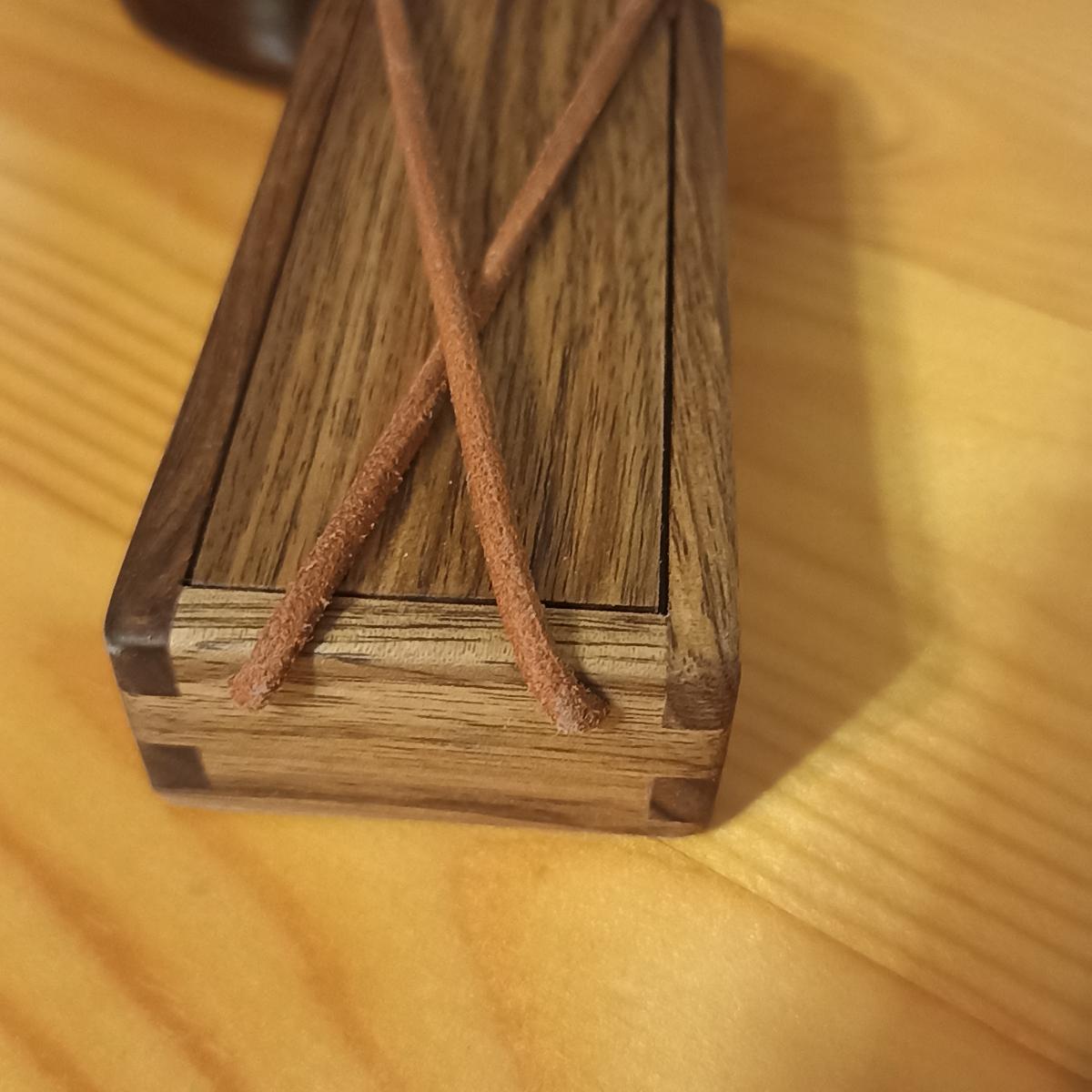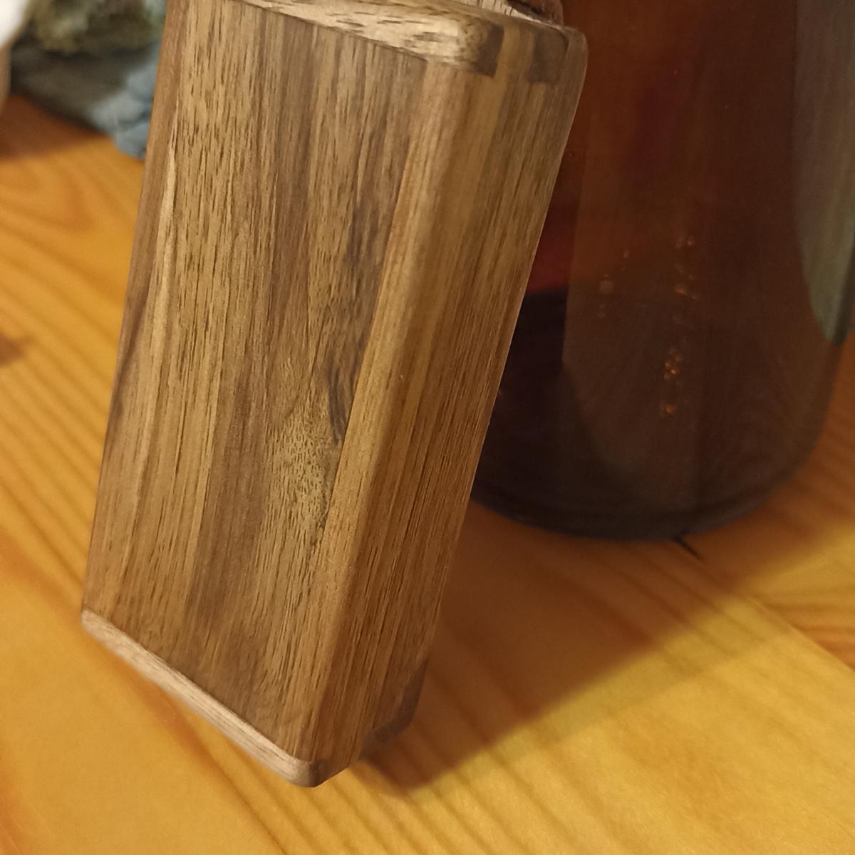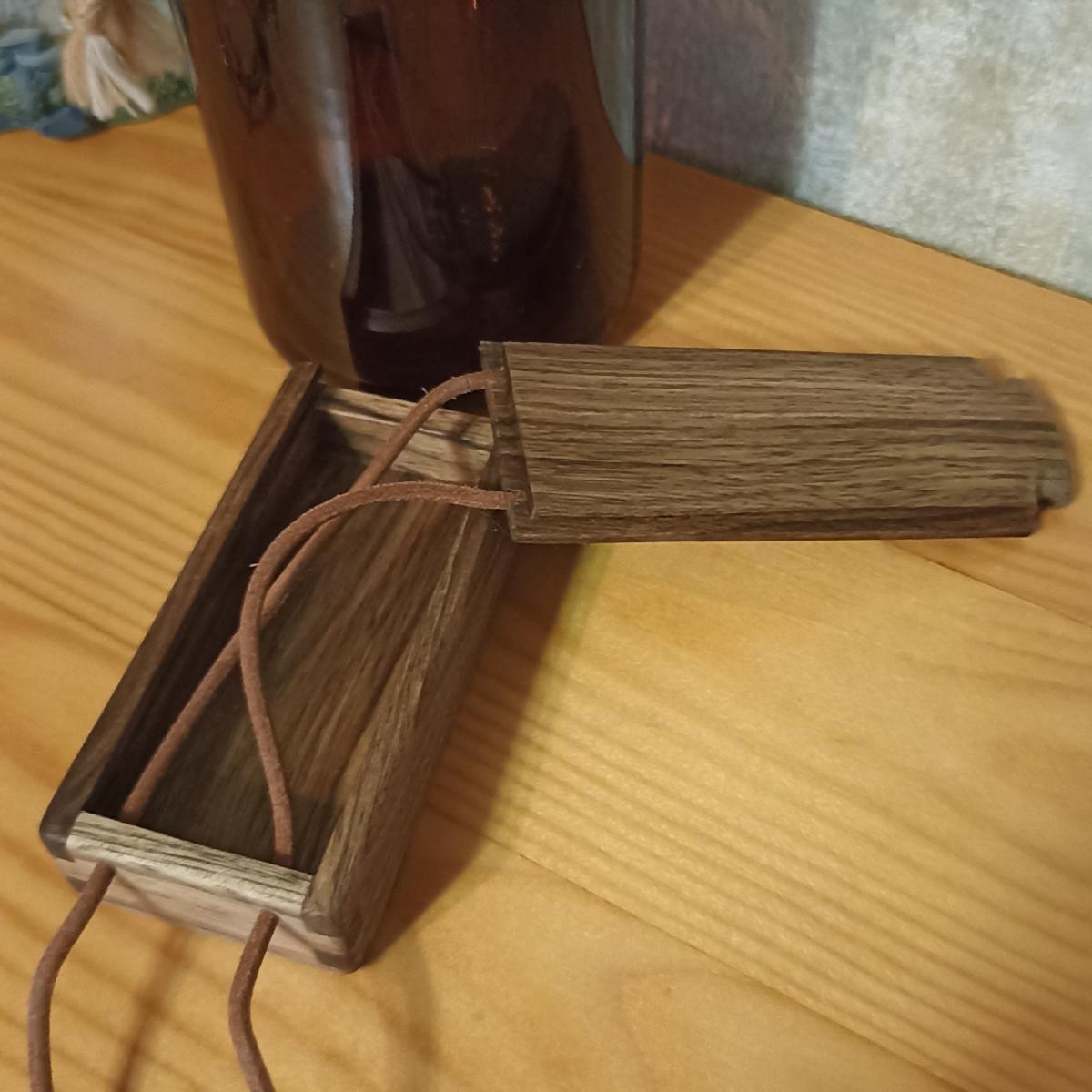 Прекрасная деревянная коробка оригинальной конструкции легко выполнит функции портсигара. Система запирания обеспечит полную сохранность содержимого. Внутренние размеры 88, 36,5 14 мм. Материал - грецкий орех. Покрытие - льняное масло, пчелиный воск. Кожанный шнур из кожи бизона. Самое главное: отсутствие предупреждающих надписей, портящих настроение перед затяжкой.