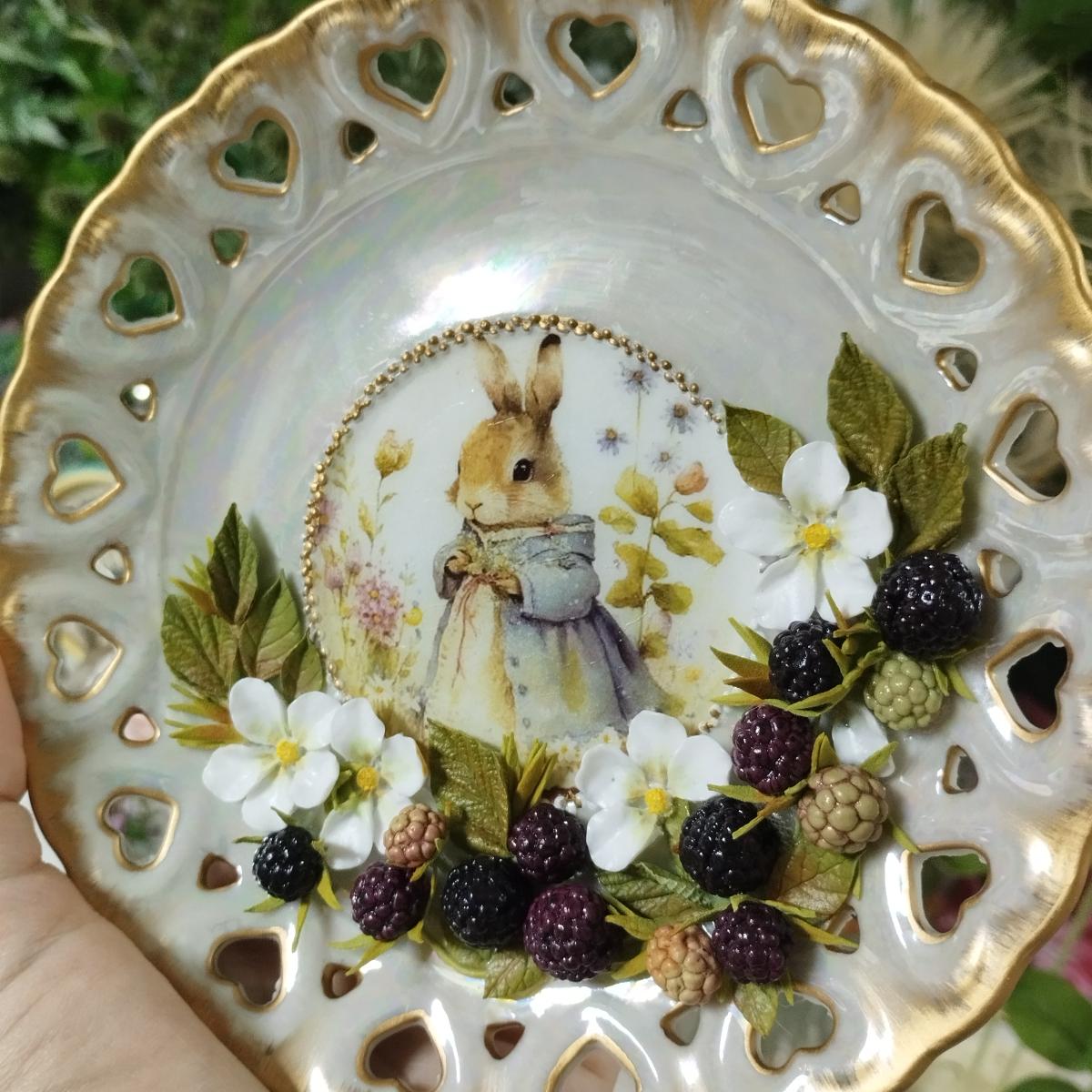 Рисунок печатный в технике декупаж нанесен на винтажные фарфоровые японские блюдца , тарелка с клеймом 1876г.Покрыты глазурью .Декор ручная лепка из полимерной глины ,включены мелкие детали из фоамирана .Роспись акриловыми красками и золотой поталью .
