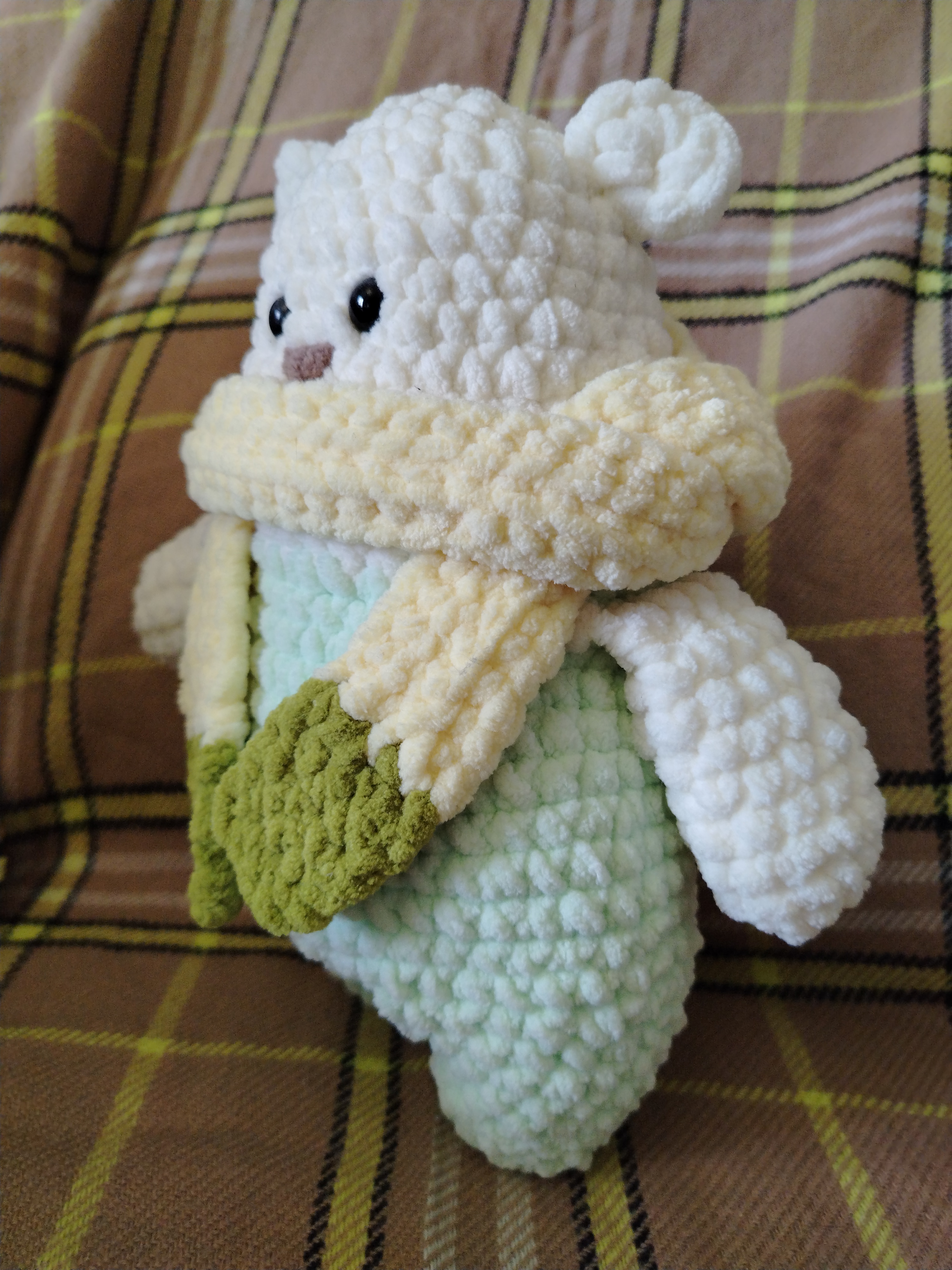 Игрушка Мишка в шарфике. Плюшевая пряжа в технике Амигуруми. Наполнитель синтепух. Высота 27 см.