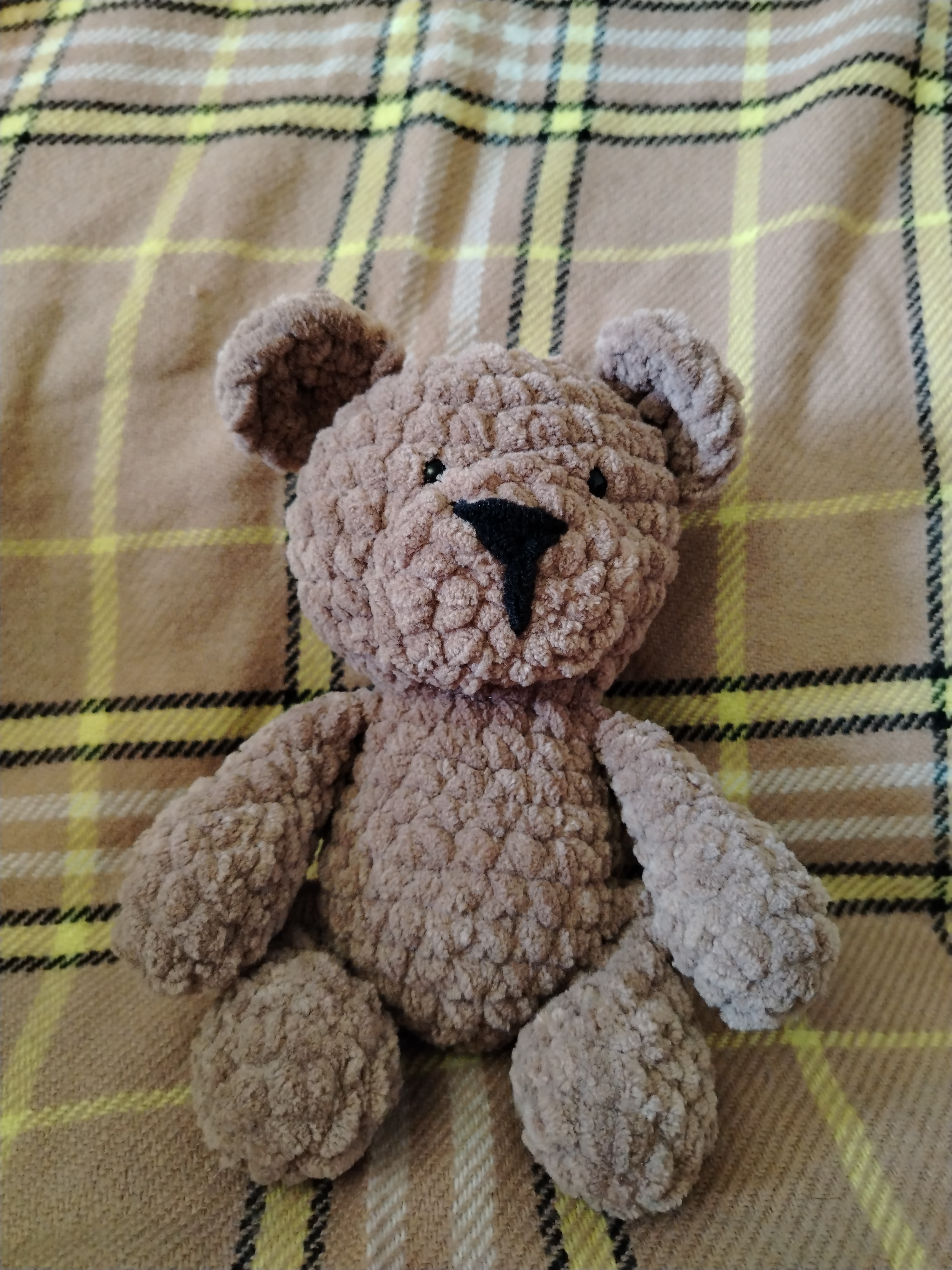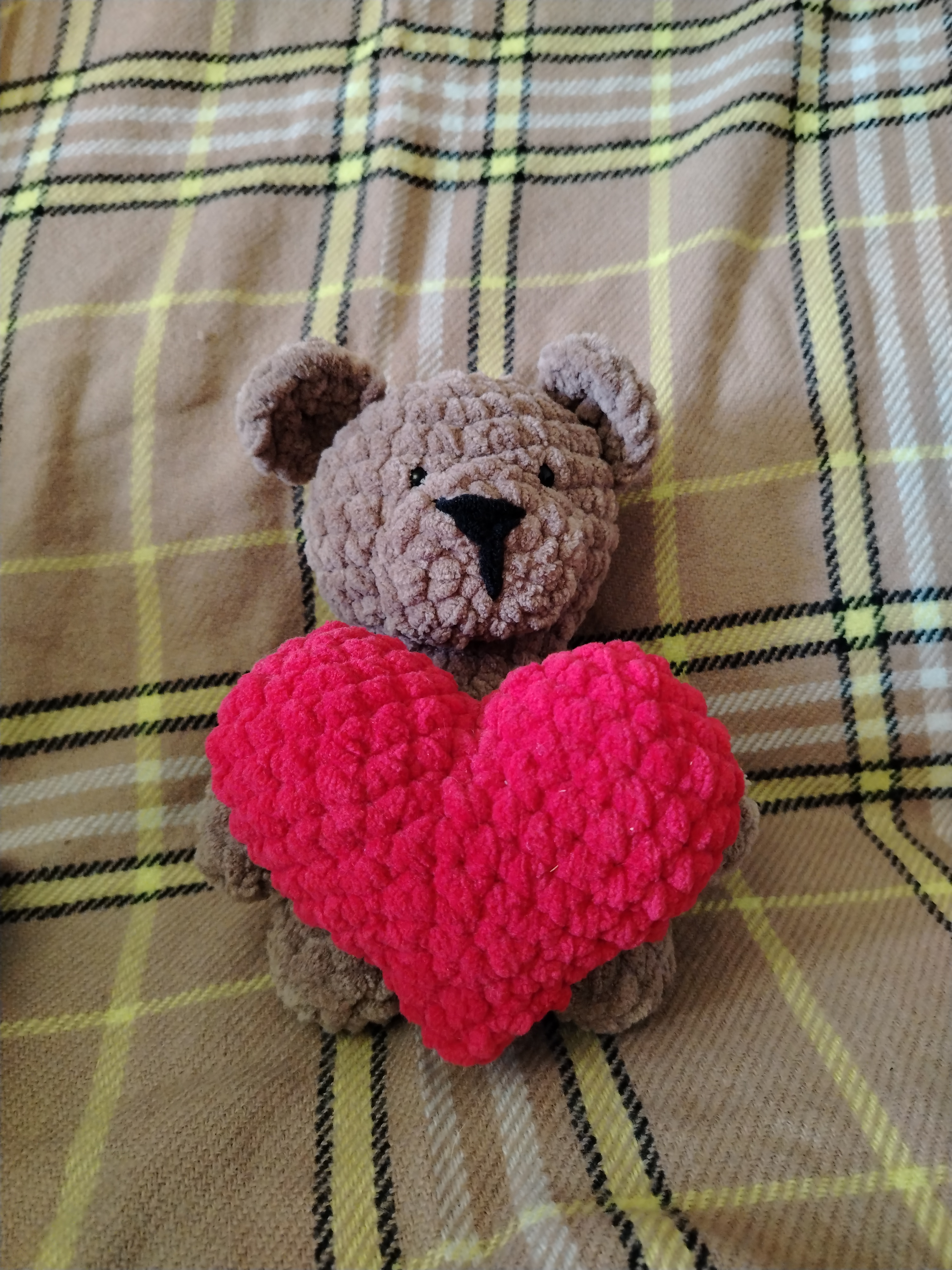 Игрушка влюбленный Миша. Плюшевая пряжа в технике Амигуруми. Наполнитель синтепух. Сердечко в комплекте. 22 см.