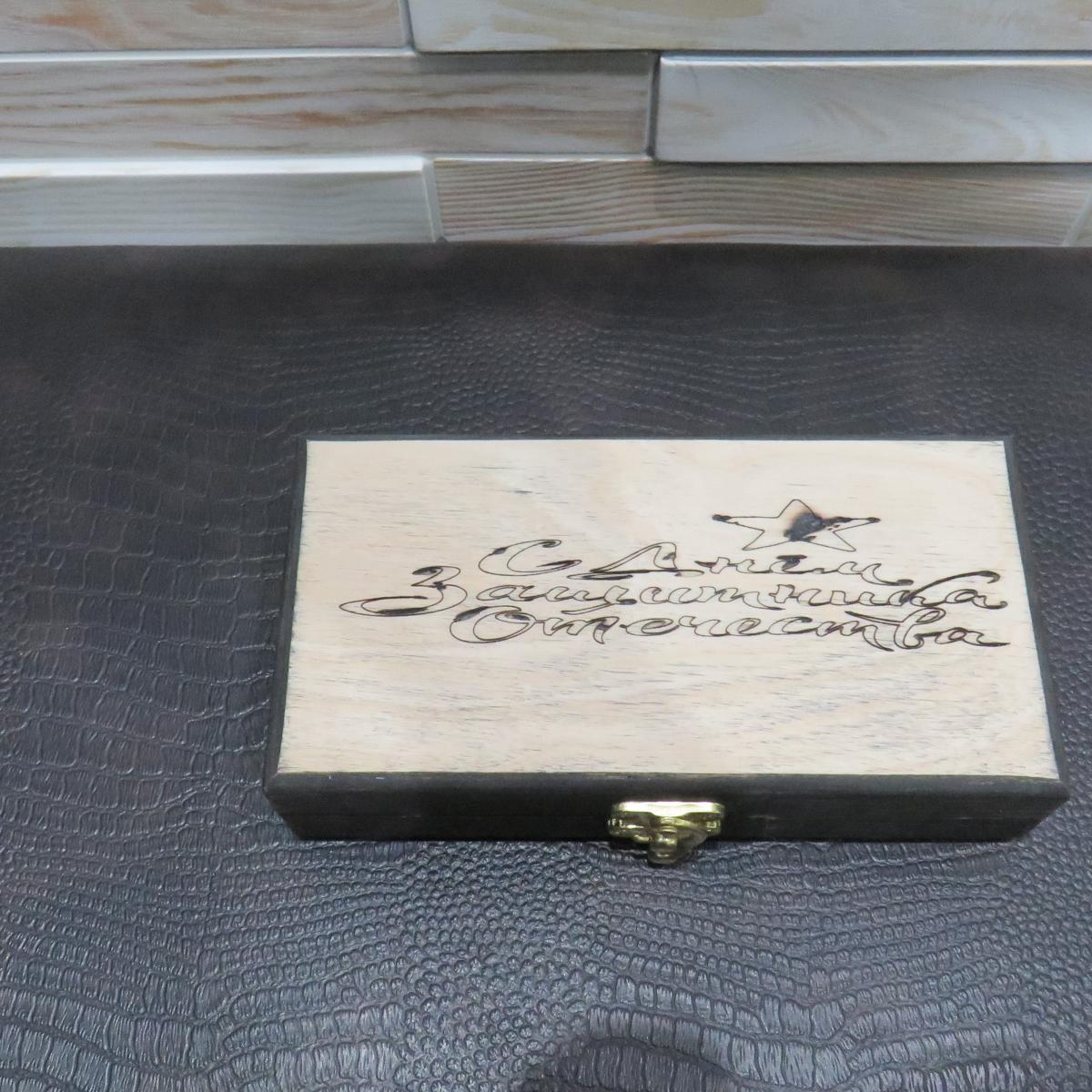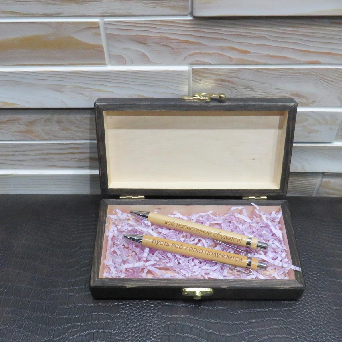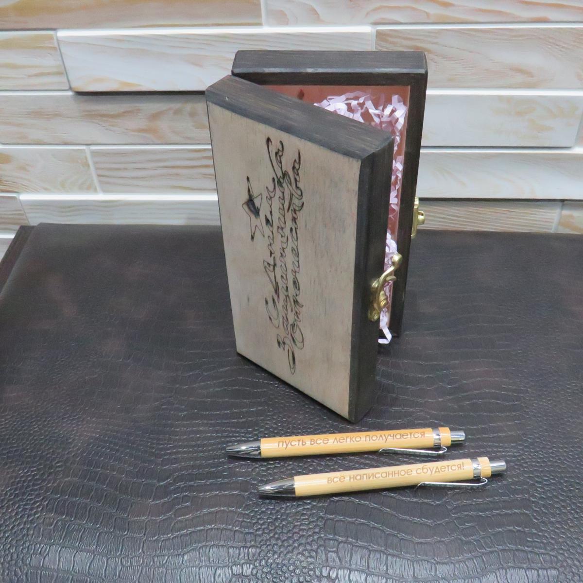 Этот подарок — для мужчины, который ценит настоящие вещи и честный труд. Основа набора — тяжелая, надежная шкатулка, выполненная из цельного массива дерева. Мы выбрали благородный, глубокий цвет Венге для корпуса и соединили его со светлой крышкой из натурального дерева. На этом светлом фоне надпись «С Днем защитника Отечества» смотрится особенно четко и достойно. Внутри вас ждет еще один символ внимания — две ручки из теплого, гладкого бамбука. На каждой из них мы выгравировали добрые пожелания. Это ручки для записи самых важных целей, больших планов и заветных желаний. В этом наборе нет ничего лишнего — только живое дерево, ручная шлифовка и тепло наших рук. Он пахнет лесом, а не мастерской, и его просто приятно держать в ладонях.