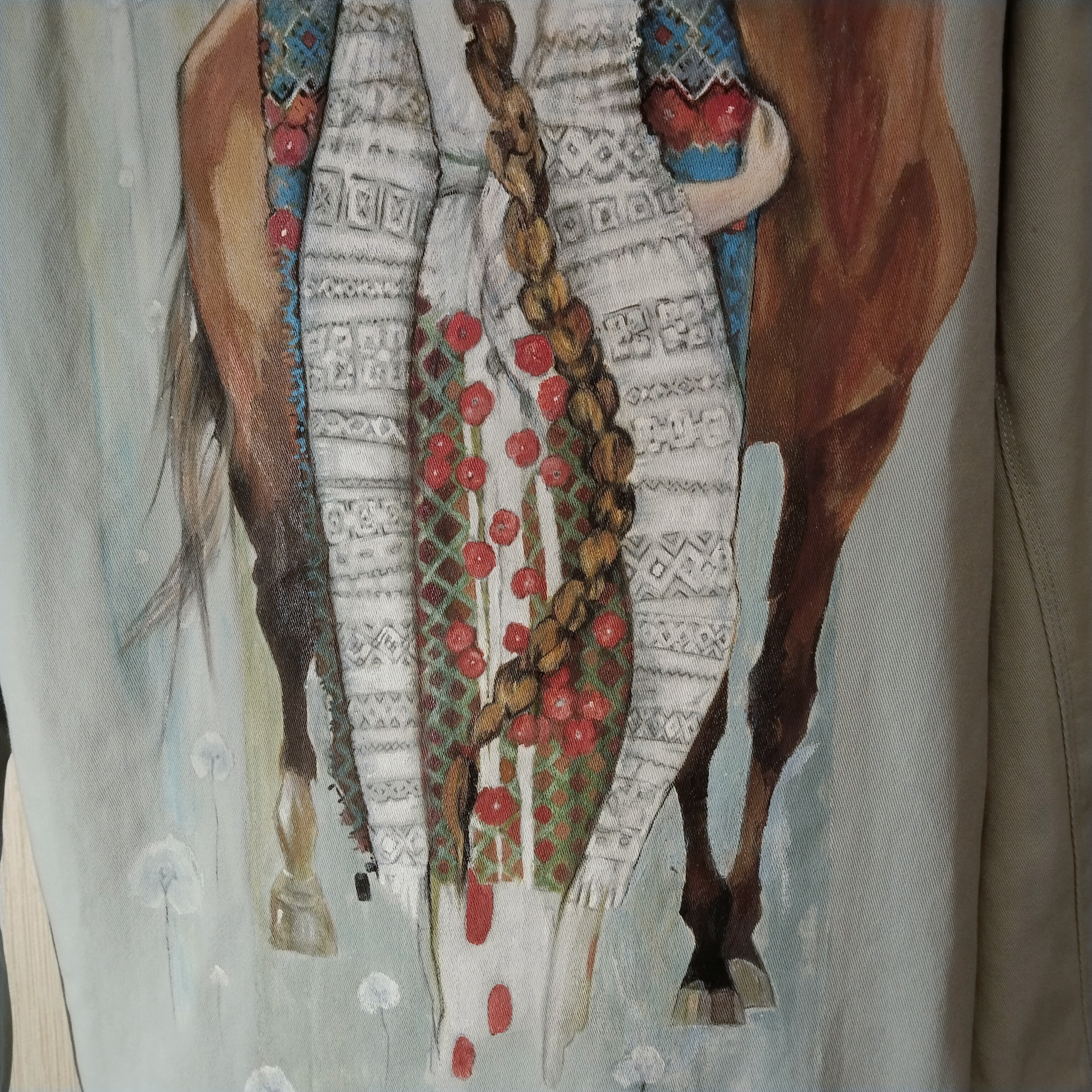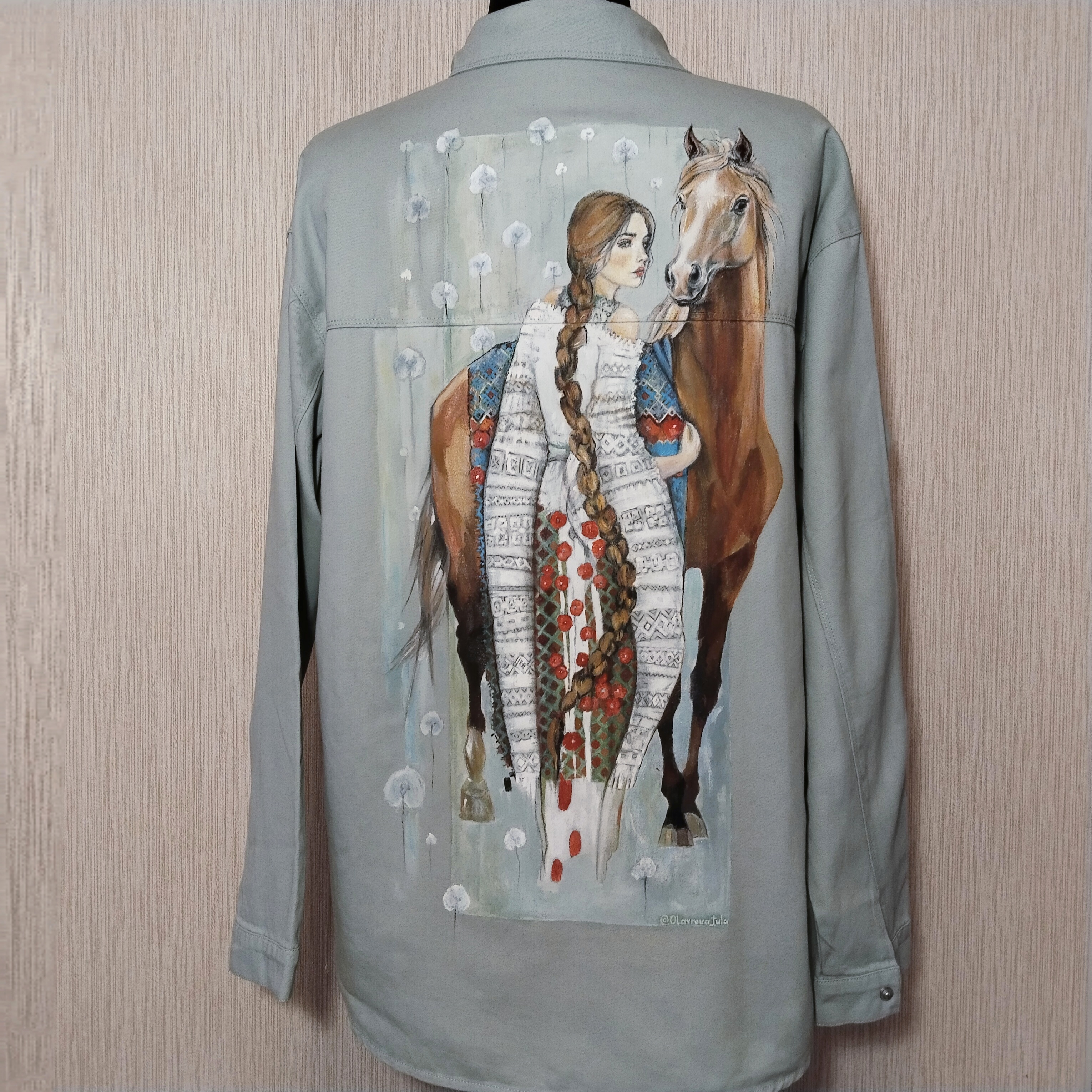 Рубашка тонкая джинсовая с принтом ручной работы " Русская душа".