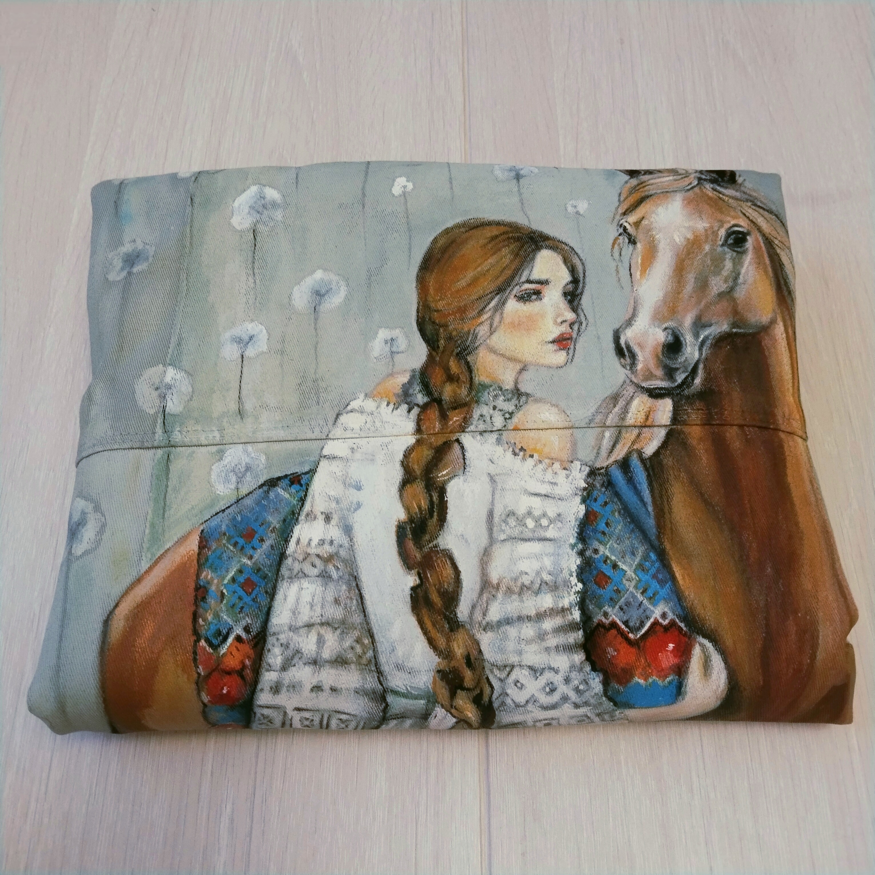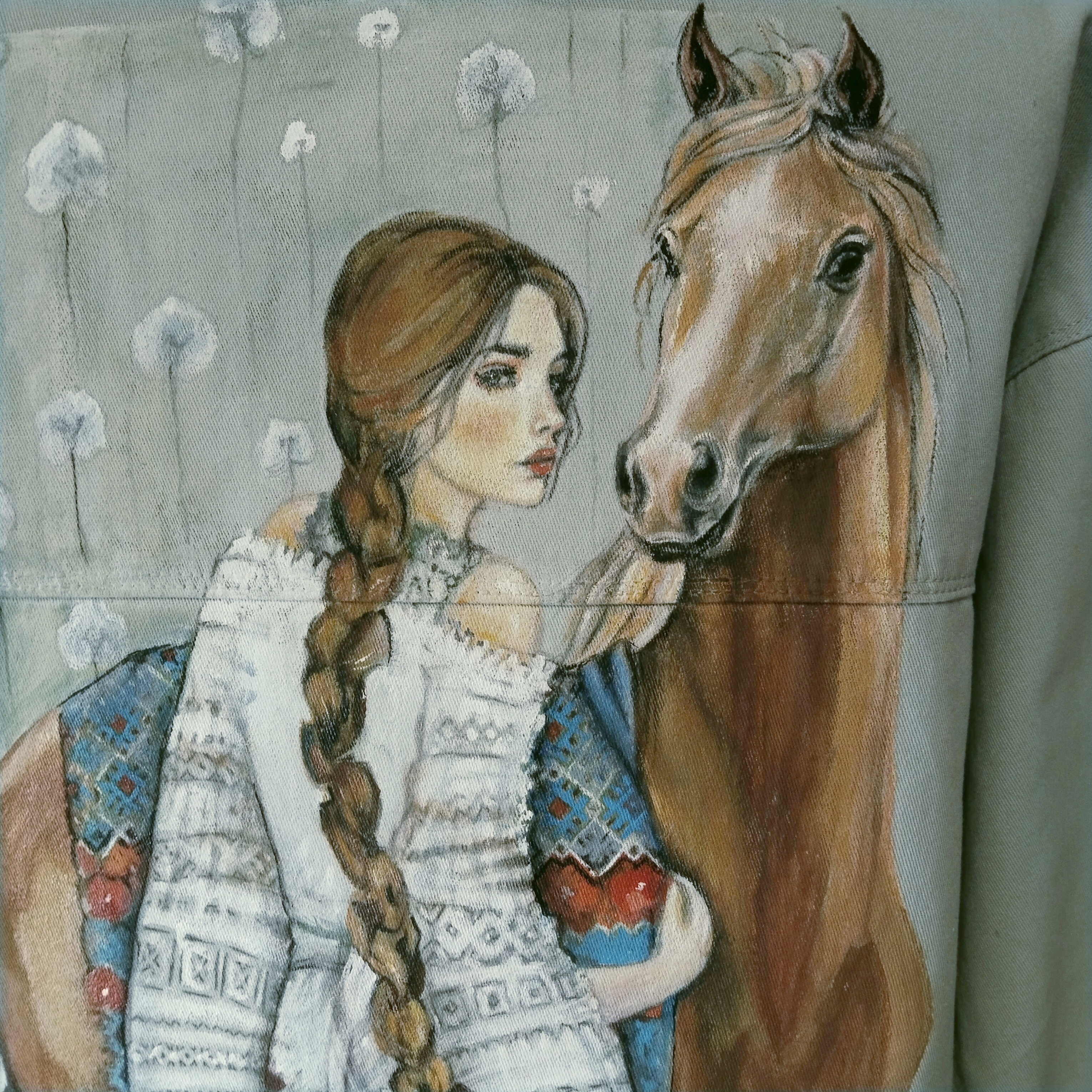 Лошадь Орловский рысак и девушка в русском платье с орнаментом.
