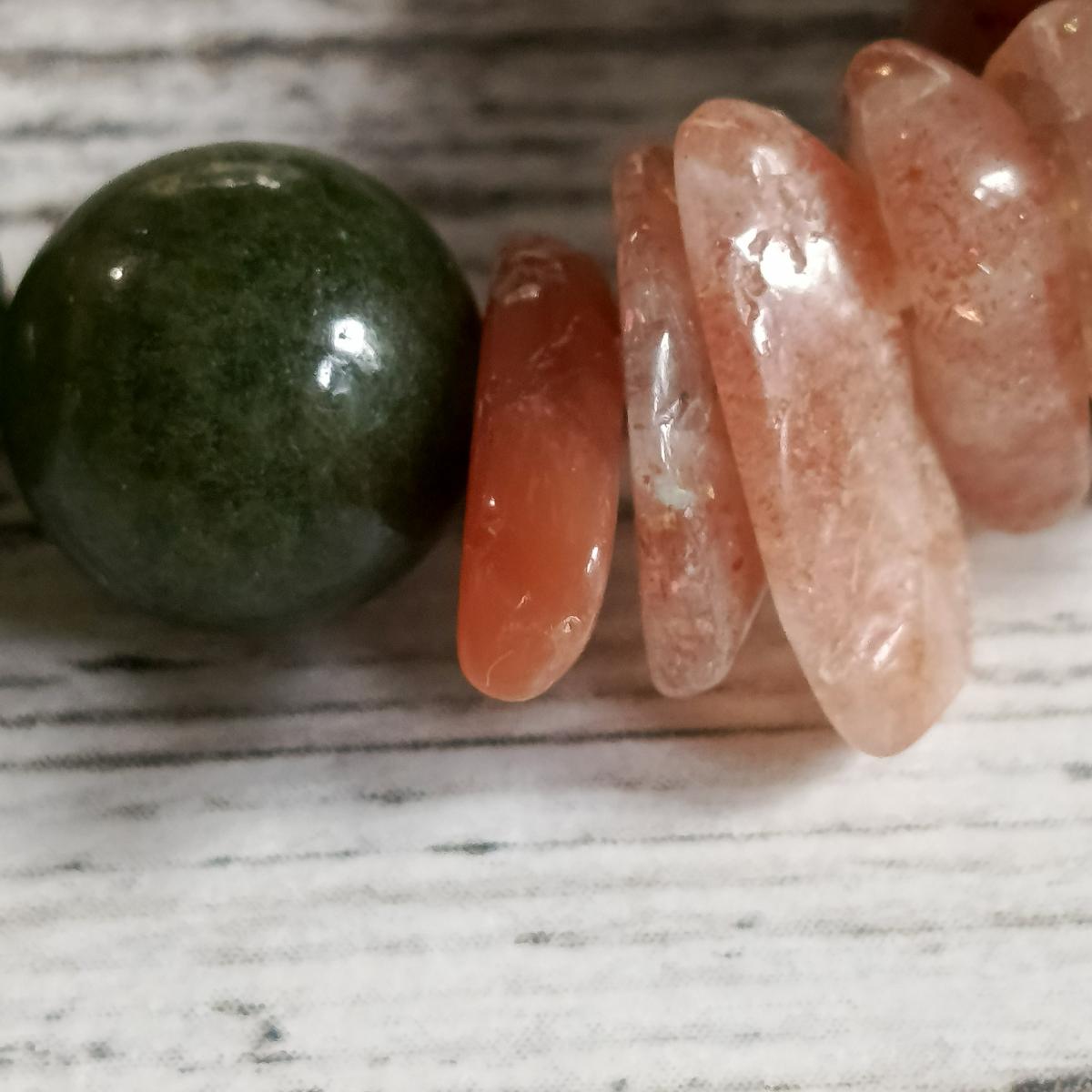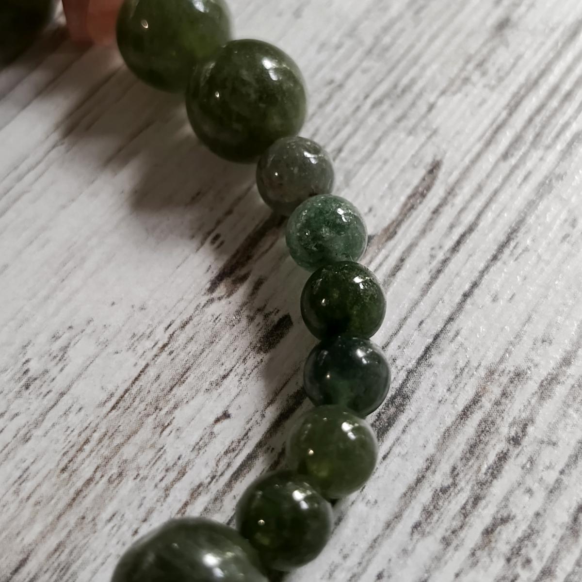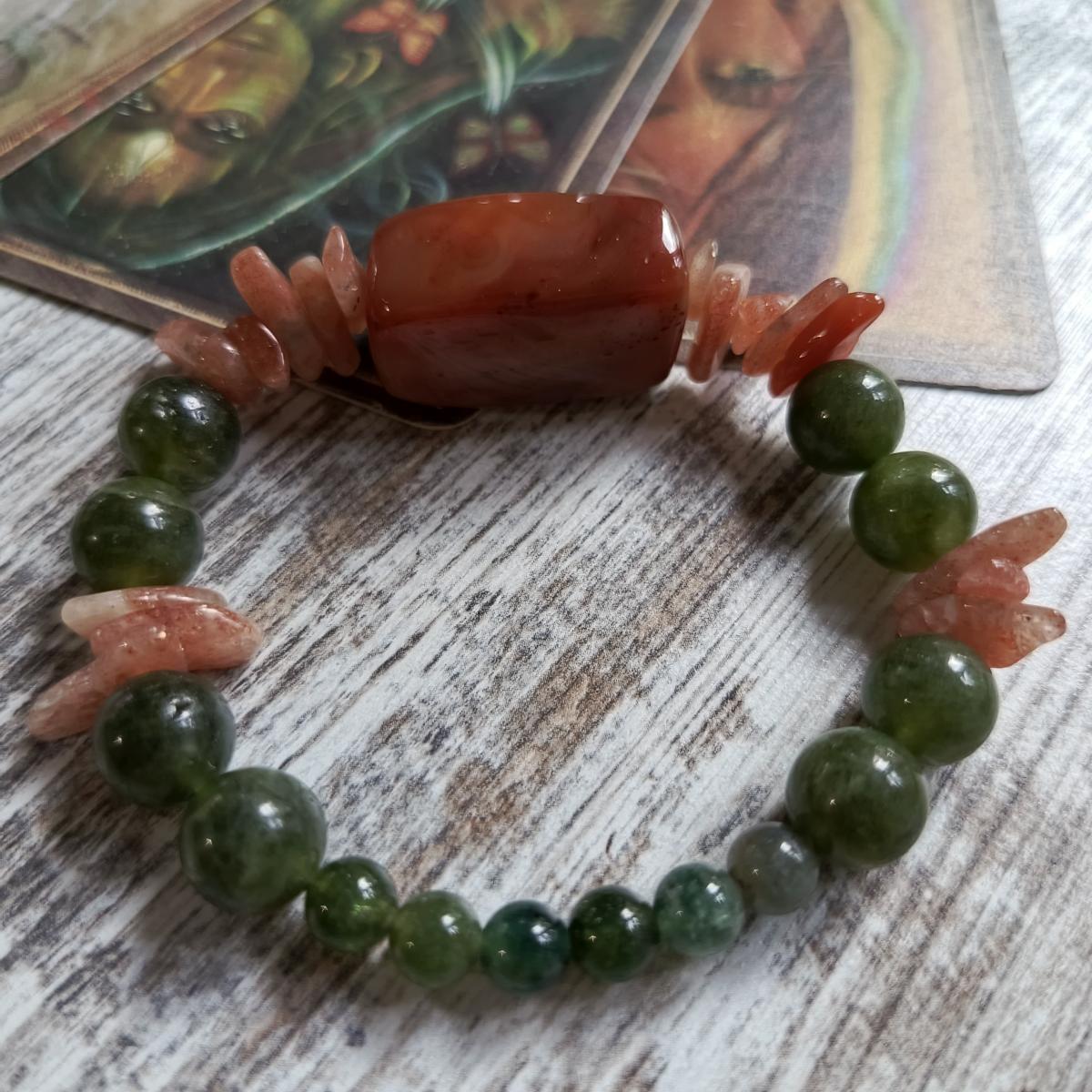 Это сочетание нефрита, агата и клубничного кварца создает сбалансированную и гармоничную энергию, объединяя защиту, стабильность и любовь. Агат обеспечивает надежную основу и защиту, нефрит способствует гармонии и изобилию, а клубничный кварц наполняет сердце нежностью и радостью. Вместе эти камни помогают исцелить эмоциональные блоки, укрепить самопринятие и привлечь гармоничные отношения. Использование их в украшениях, медитациях или на рабочем месте способствует созданию спокойствия, защиты и позитивной энергии, поддерживая баланс между внутренним состоянием и внешним окружением.