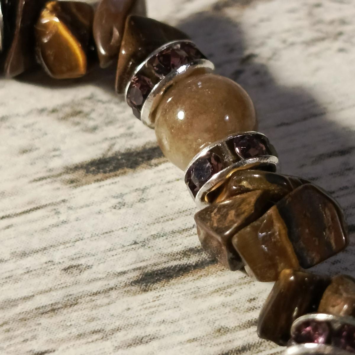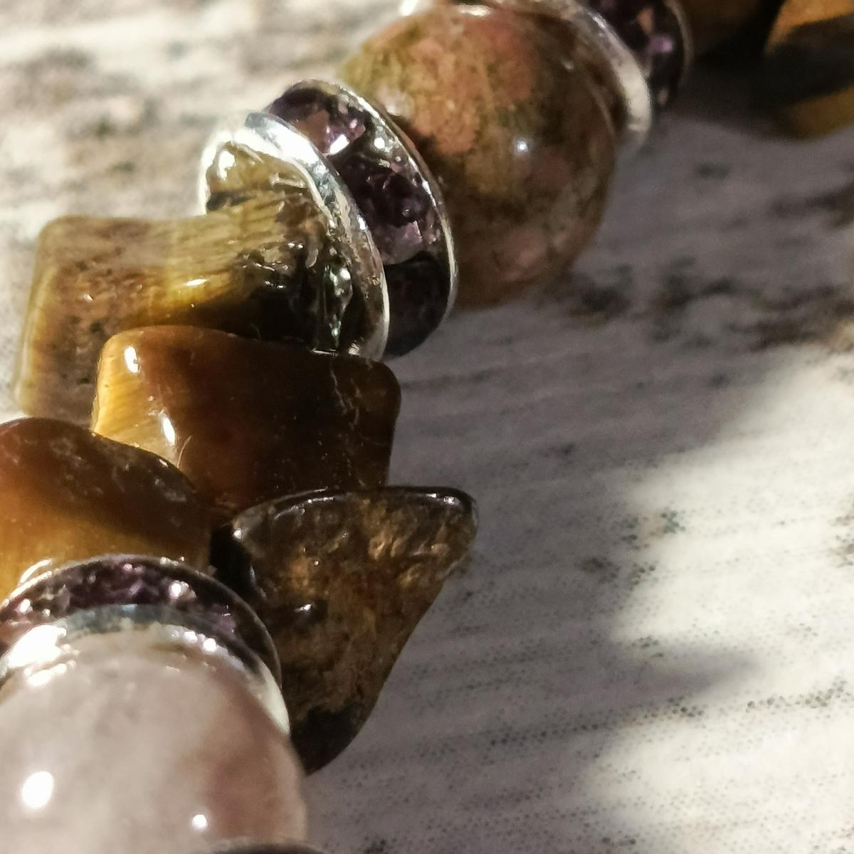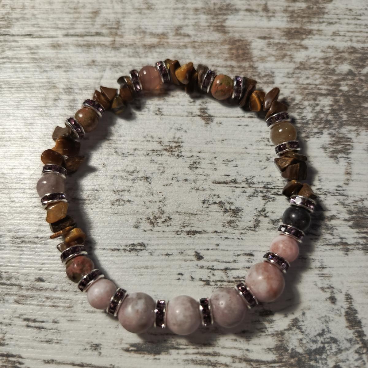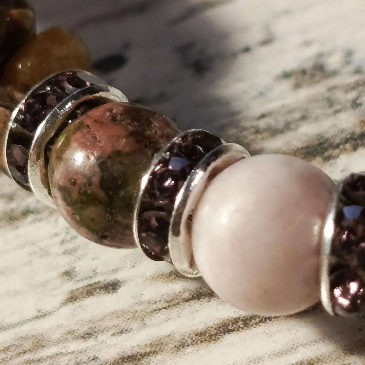 Комбинация розовой яшмы и тигрового глаза, с добавлением унакита и агата представляет собой гармоничное сочетание энергий разных стихий и вибраций.