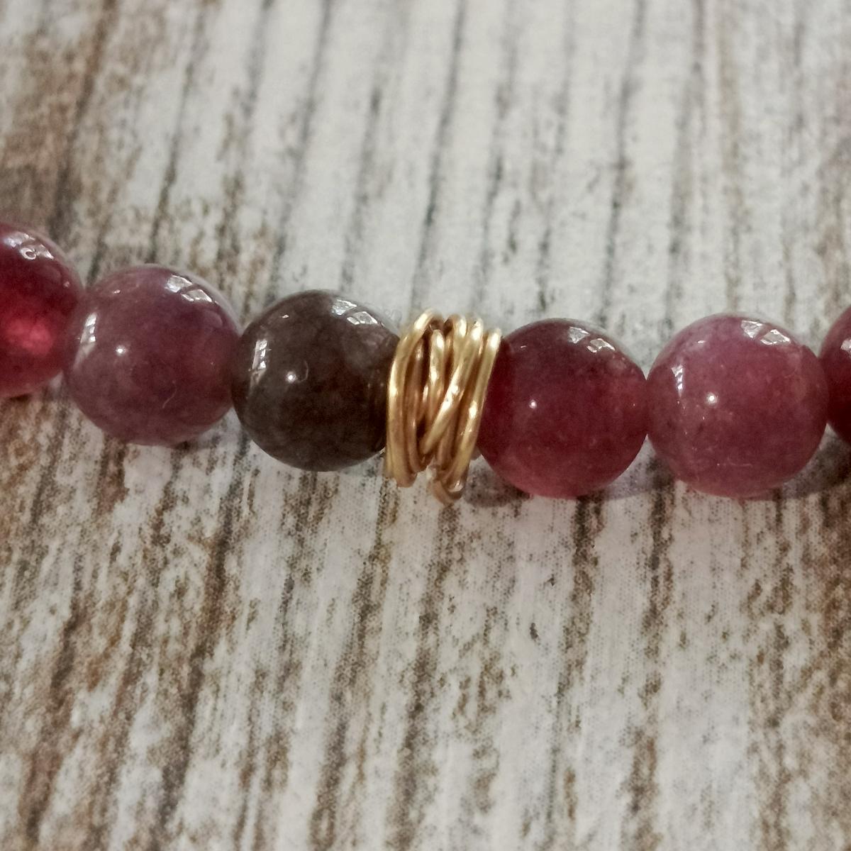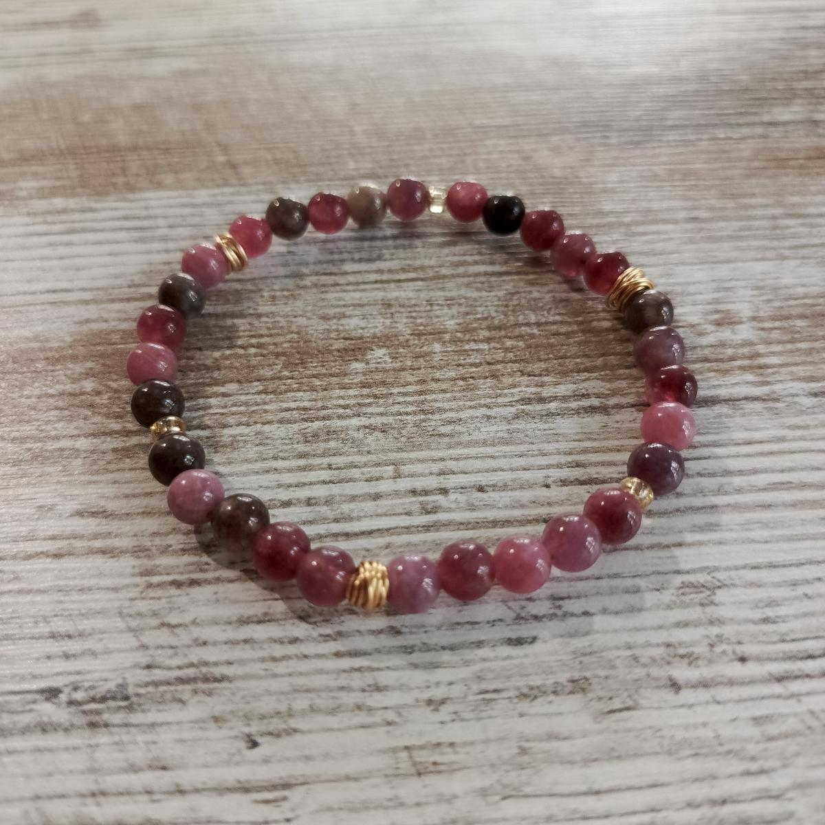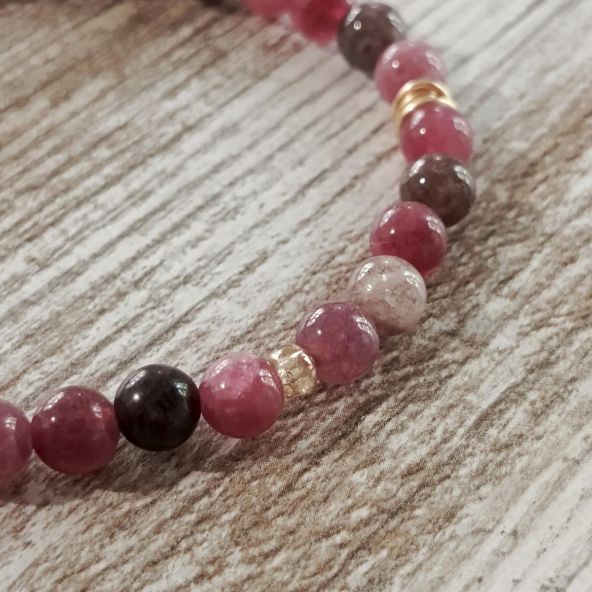 В этом браслете два вида турмалинов - турмалин рубелит и турмалин эльбаит. Они принадлежат к одному семейству минералов, причем рубелит является разновидностью эльбаита, отличающейся розовым или красным цветом. Эльбаит включает в себя множество цветных подвидов, таких как верделит, индиголит, ахроит и арбузный турмалин, каждый из которых обладает своими уникальными энергетическими характеристиками.