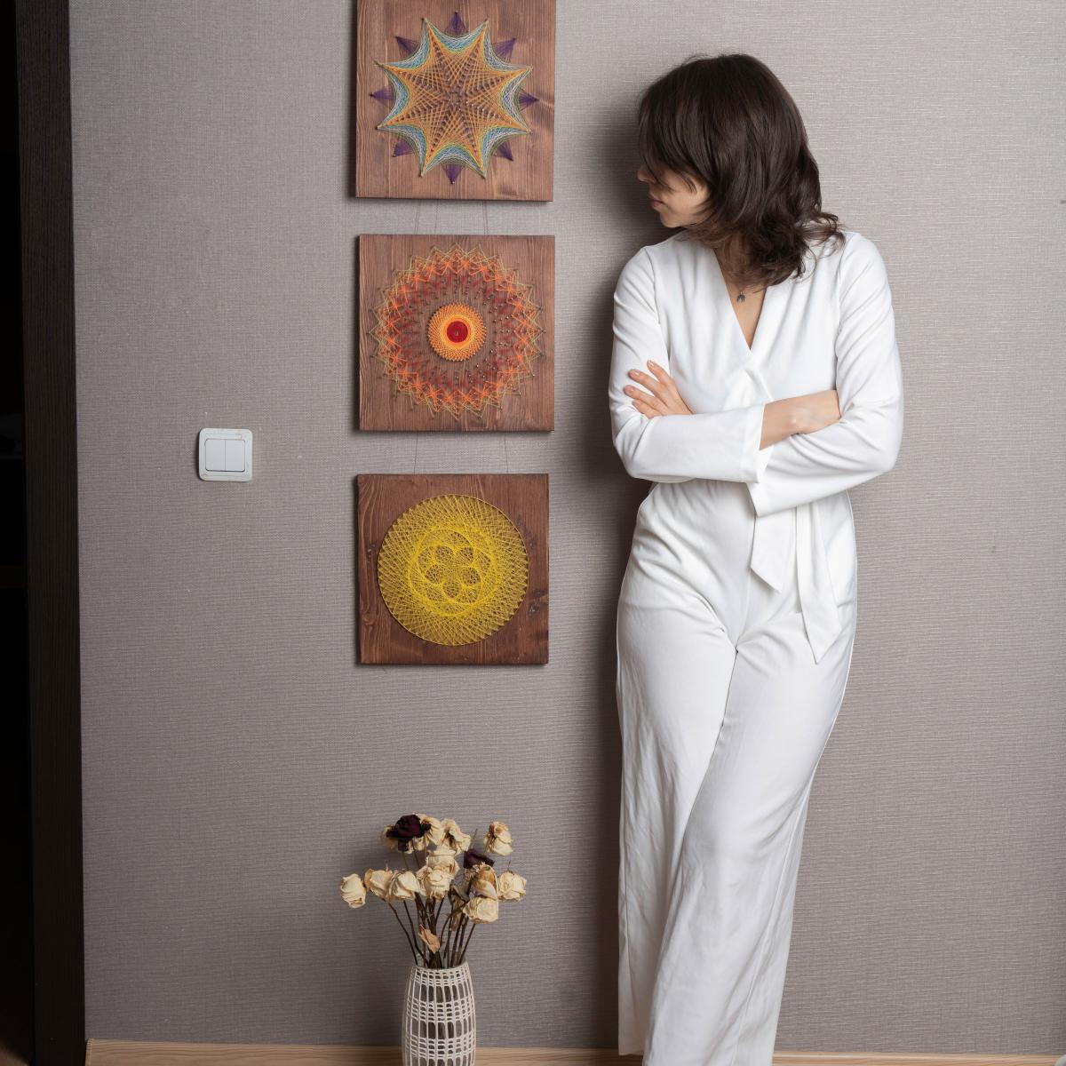 В наборе: деревянная основа с гвоздями, нитки швейные, инструкция бумажная, контакты автора, видео инструкция по запросу.