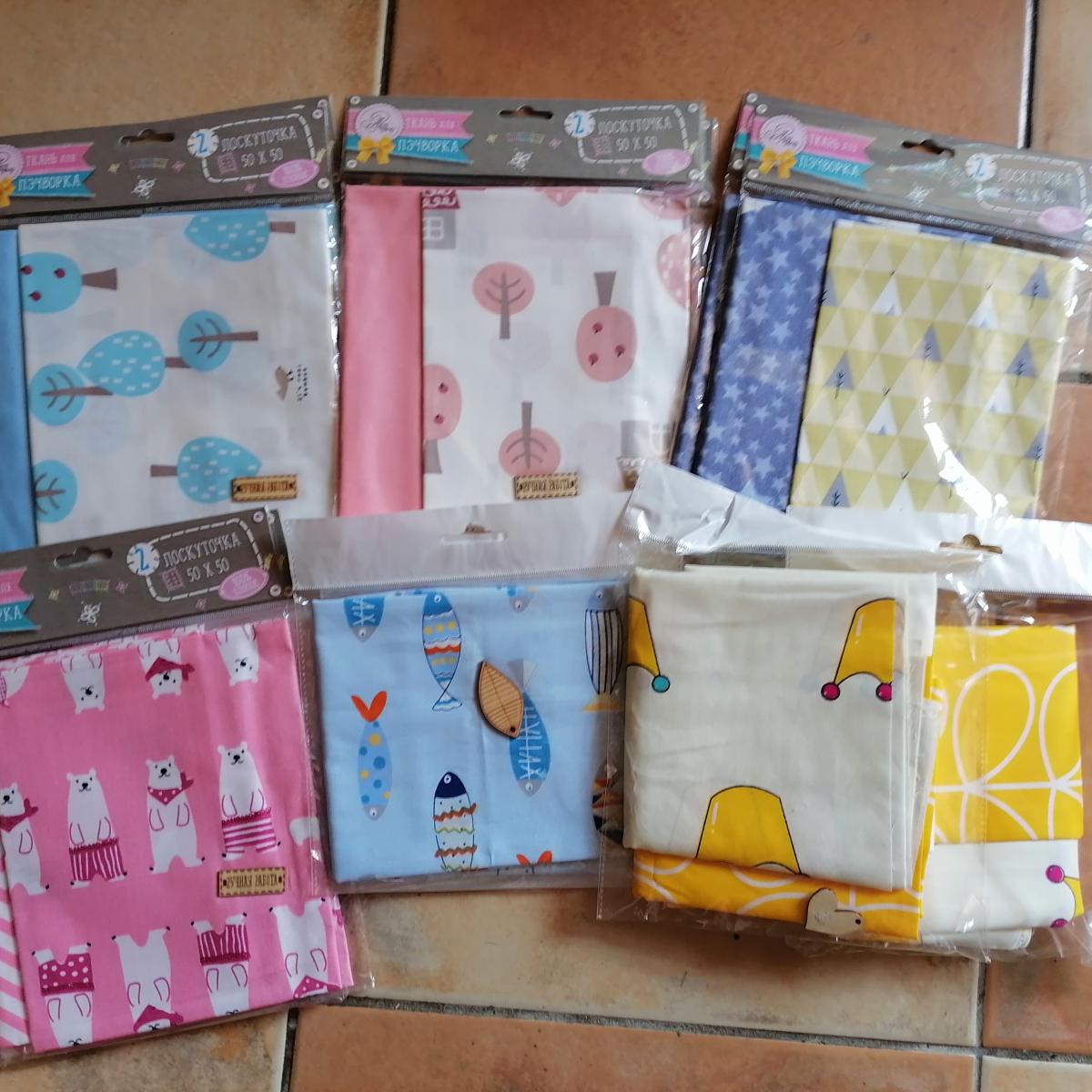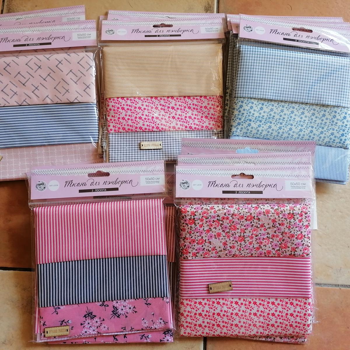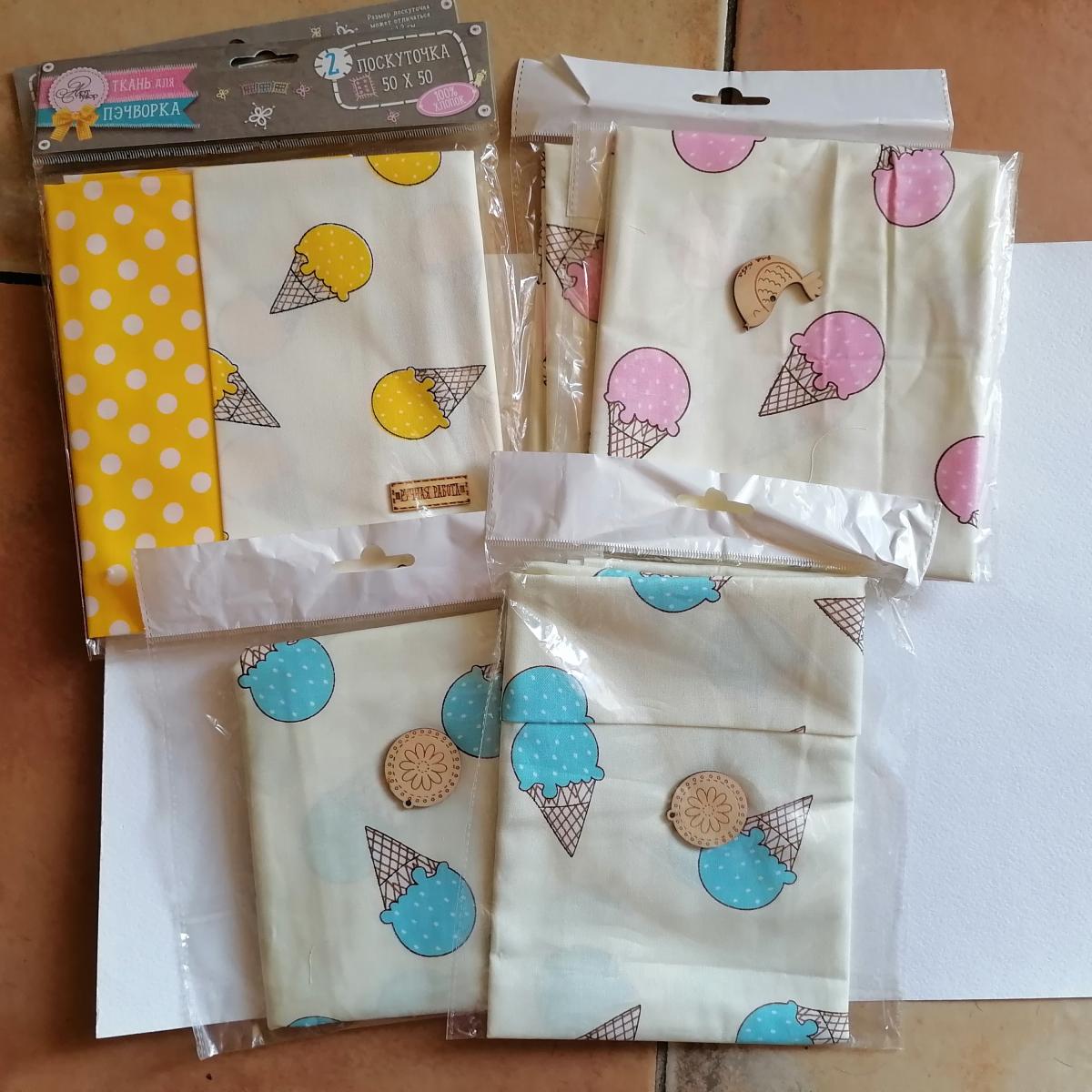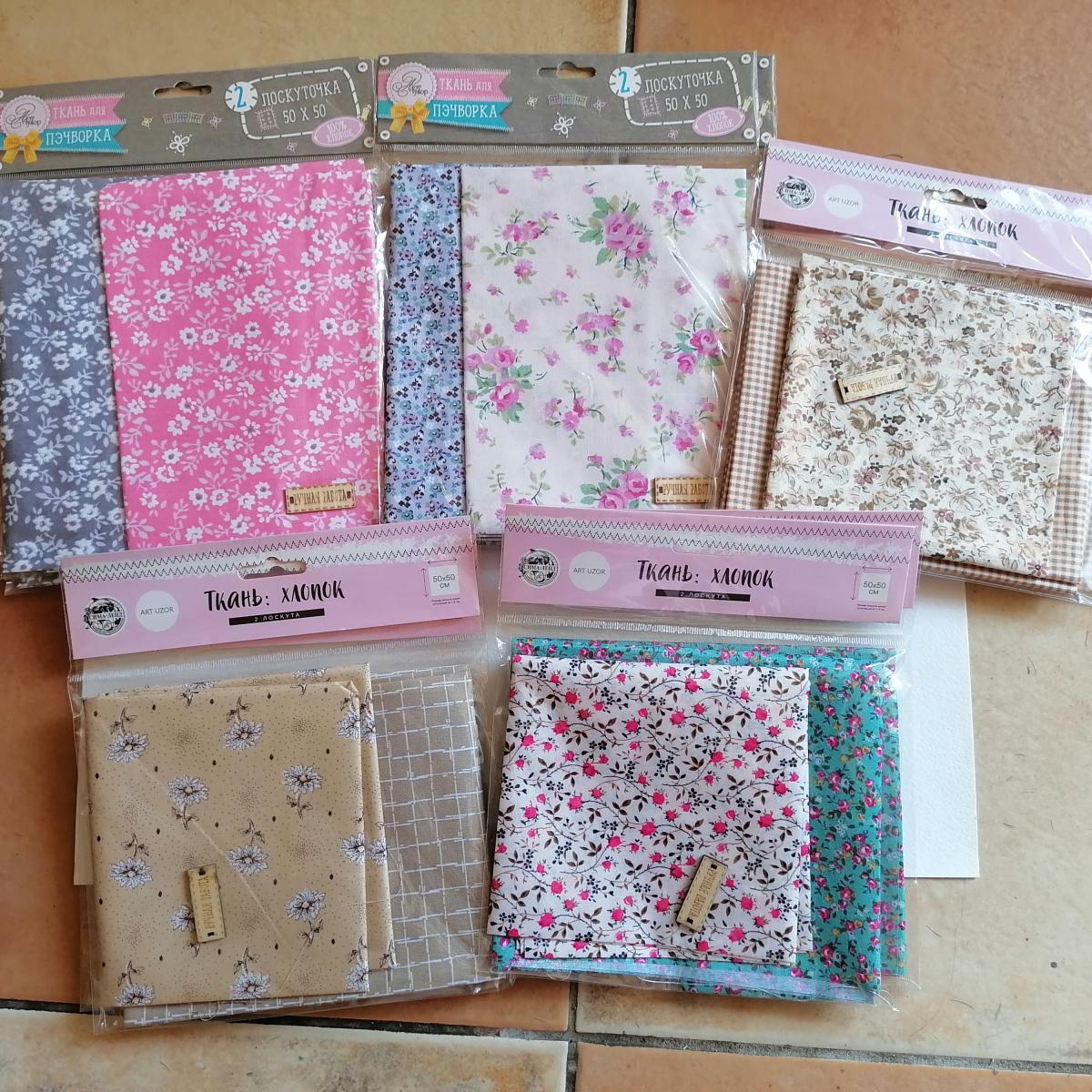 Хлопок 100%, размер отрезов 50х50 см/70х130 см, запечатано в отдельные пакетики, есть деревянная плашечка "Hand made".