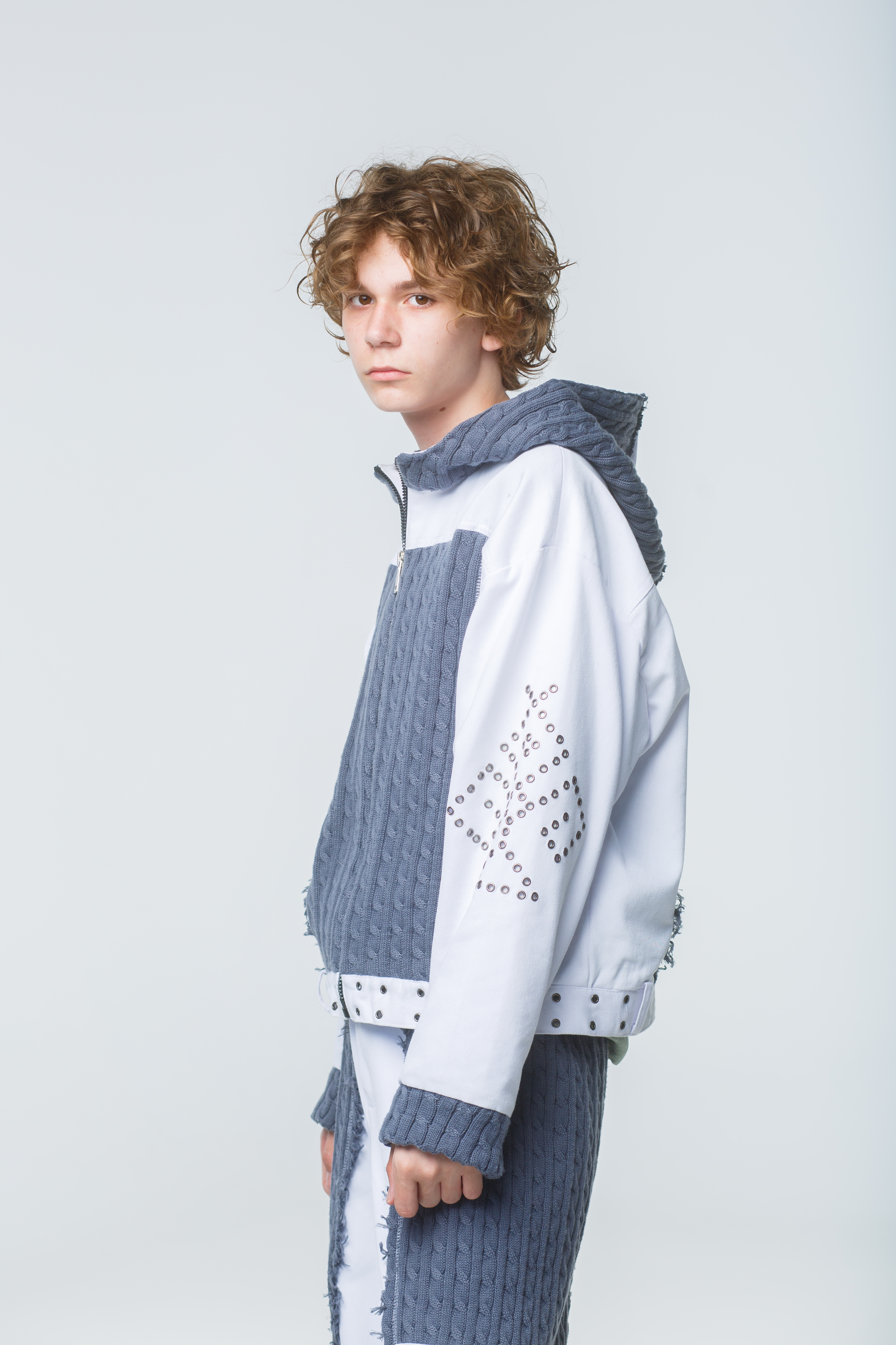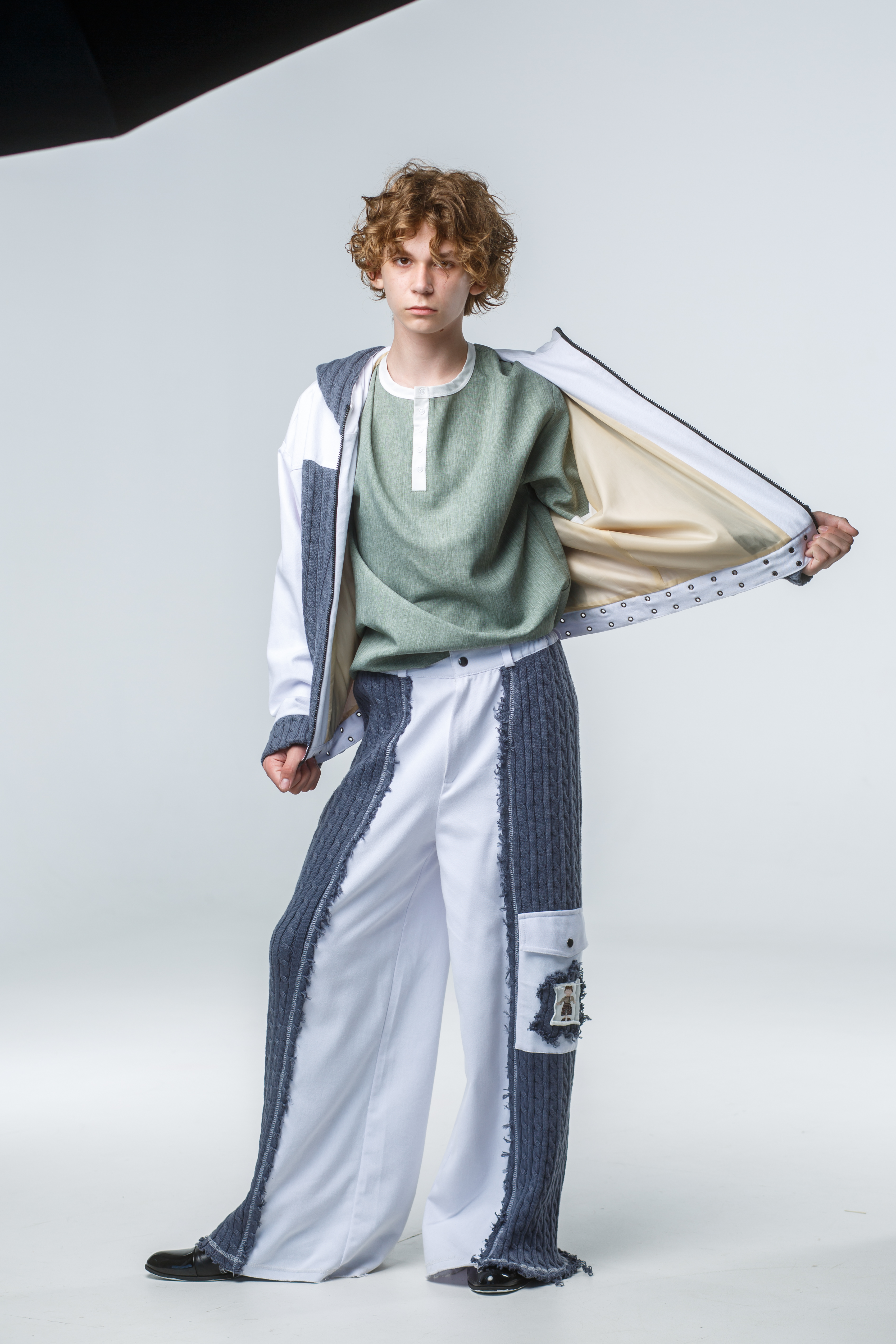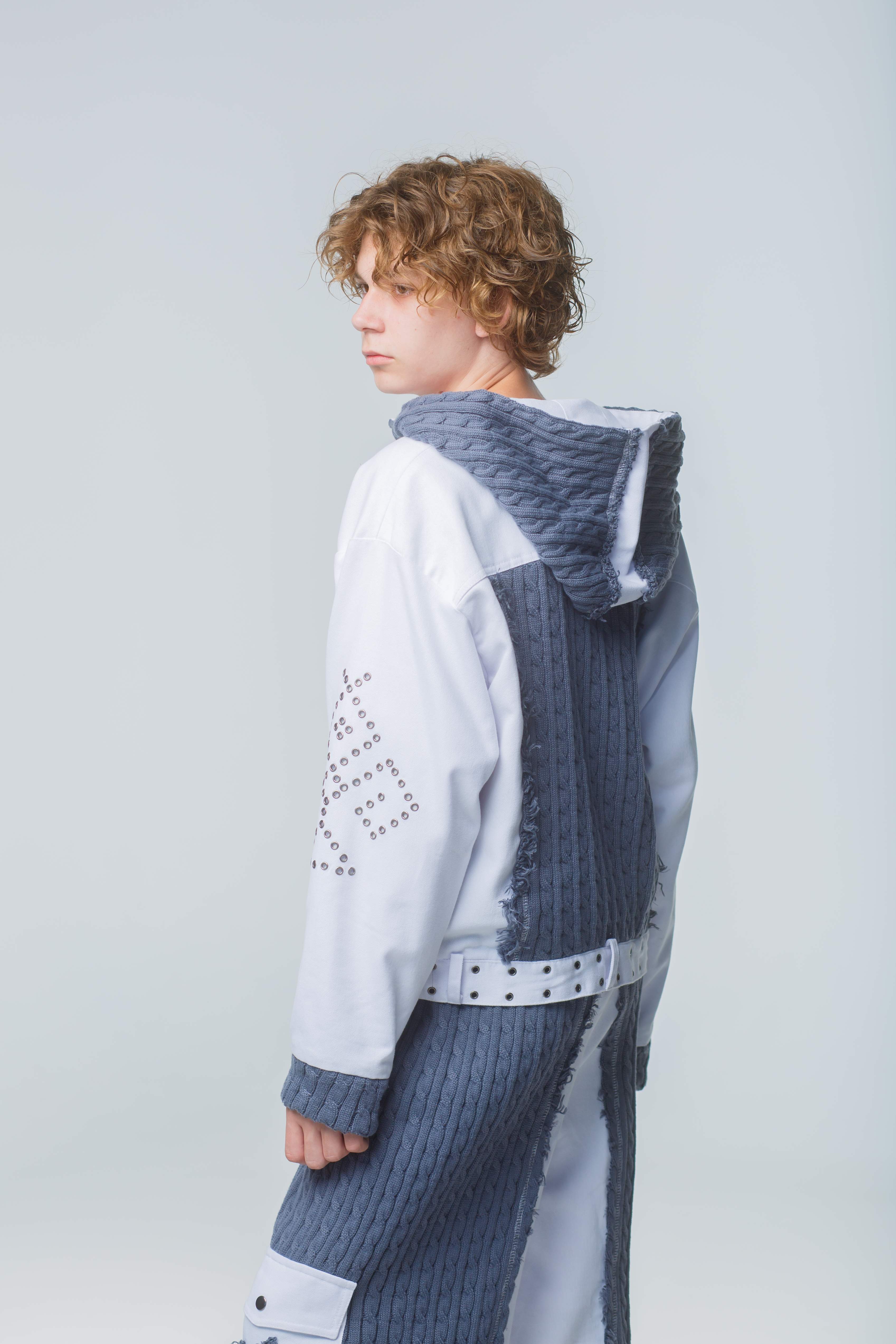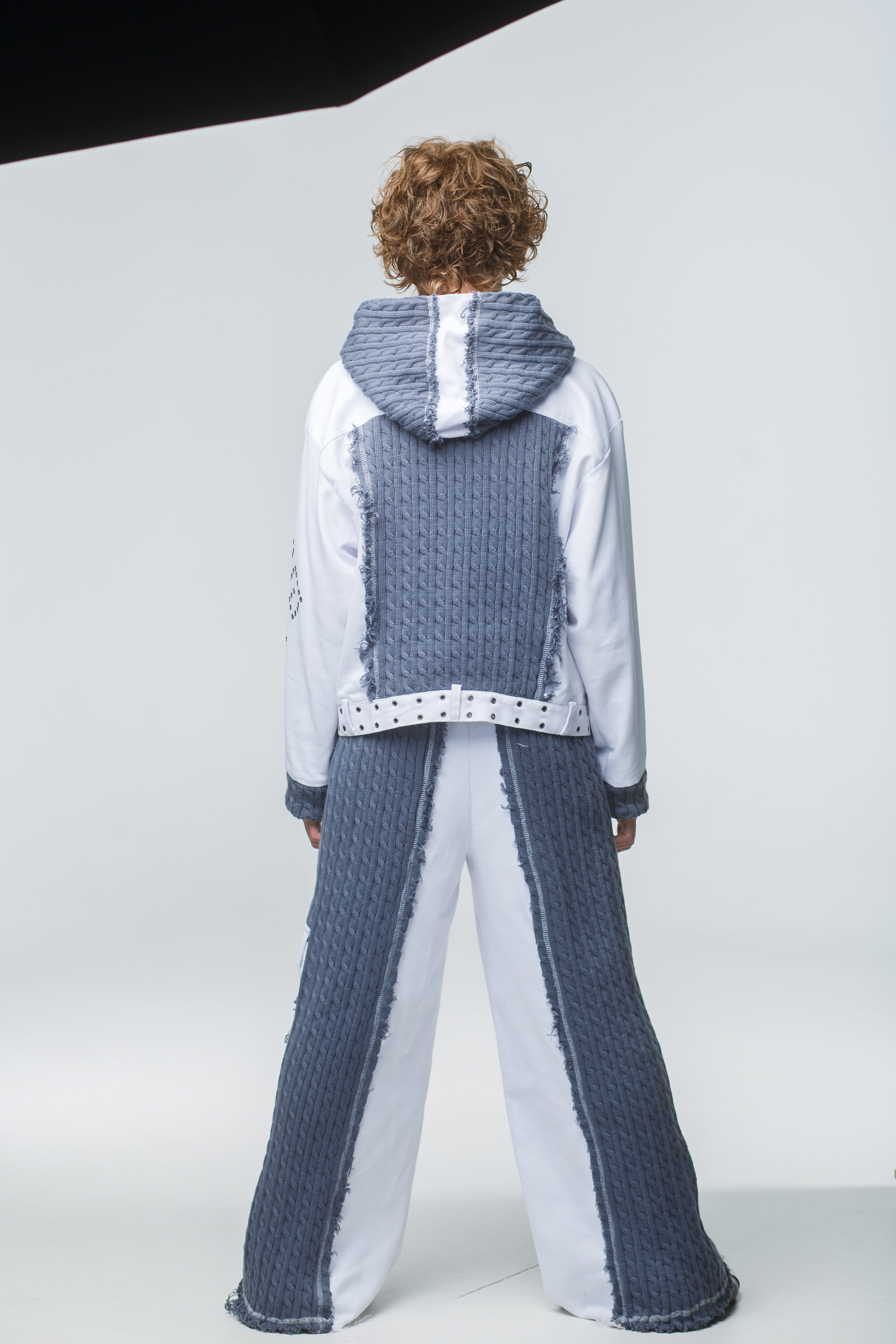 Игра текстур: Рваные (распущенные) края трикотажных полотен добавляют образу лёгкую брутальность и современность.
