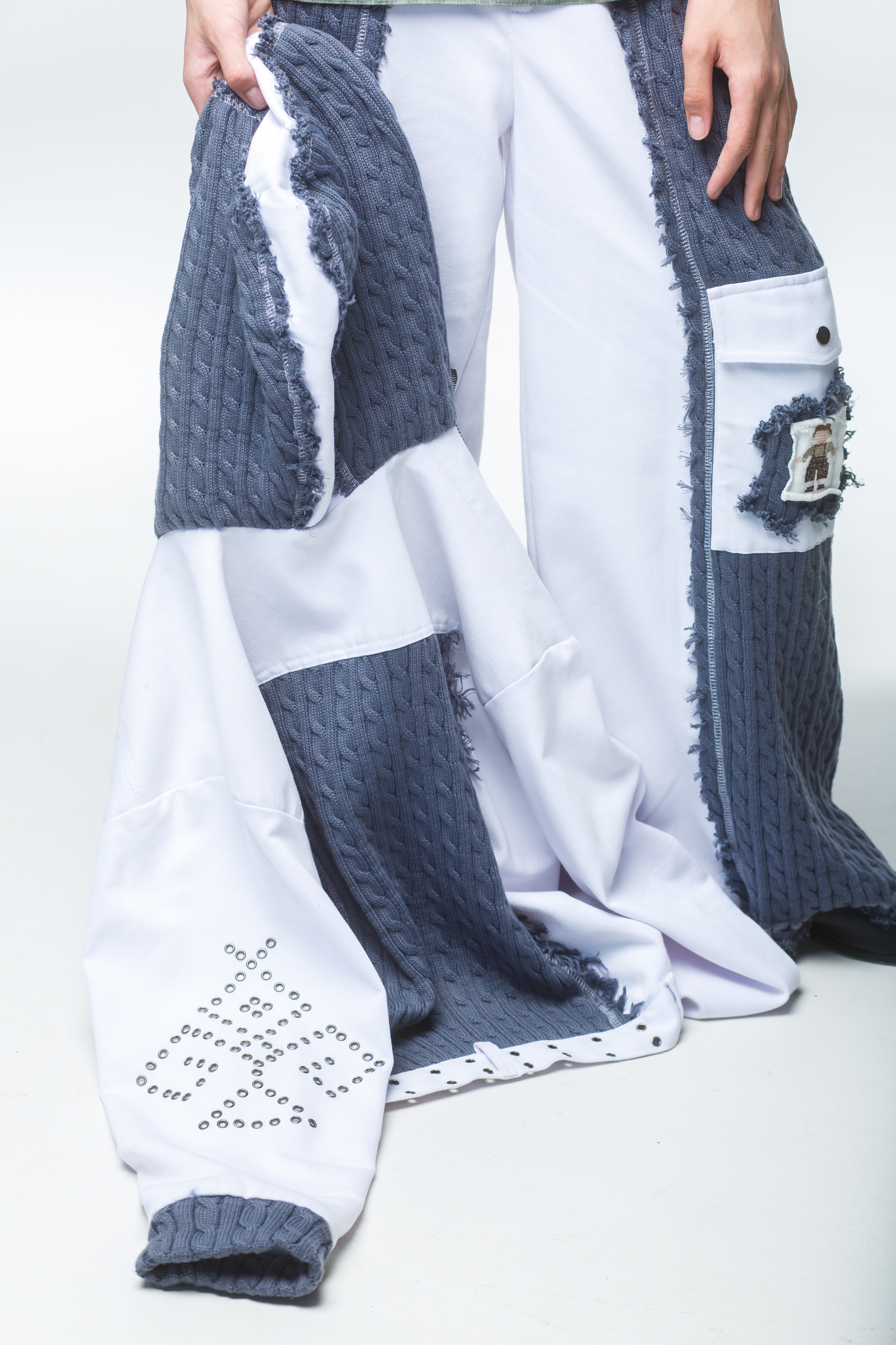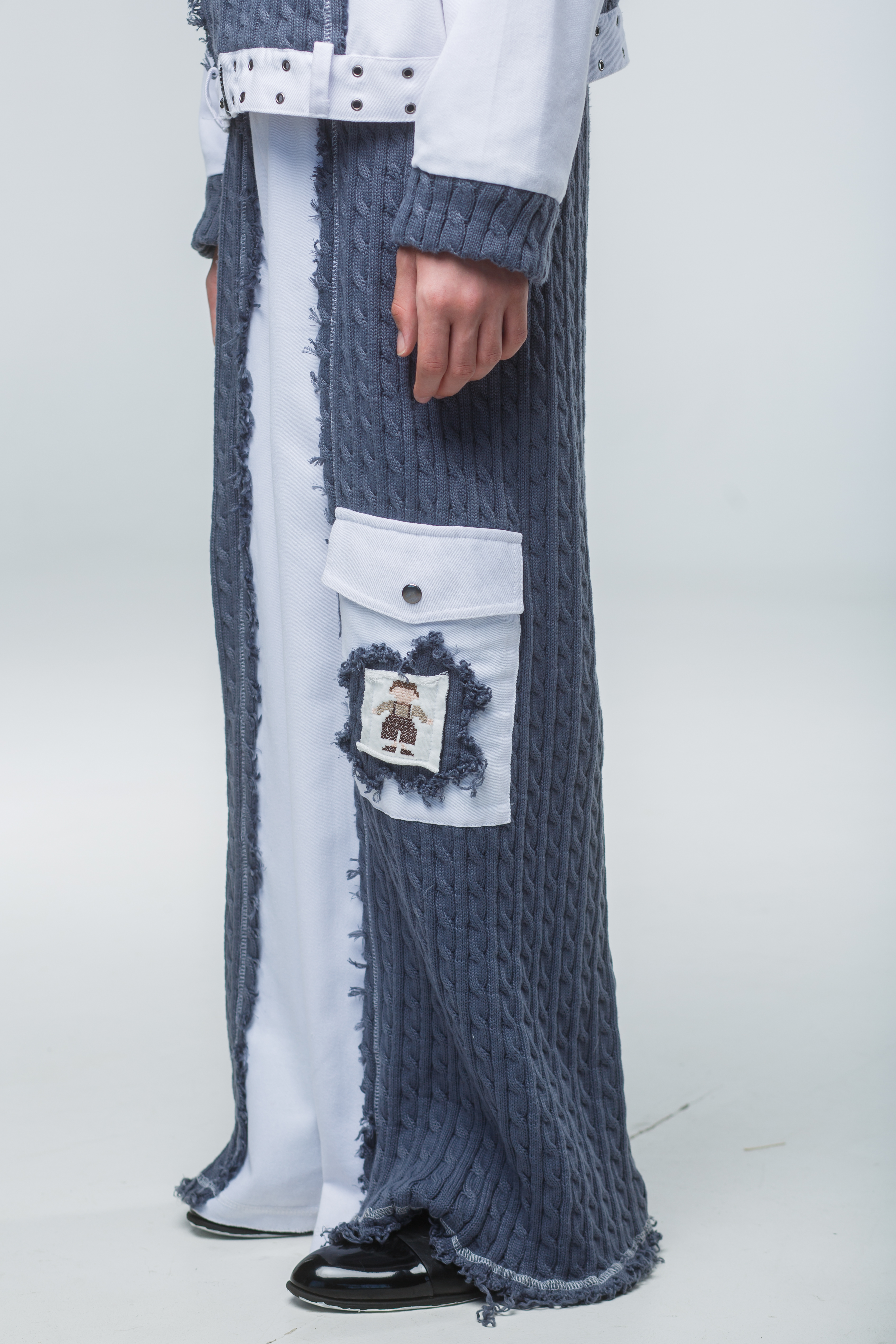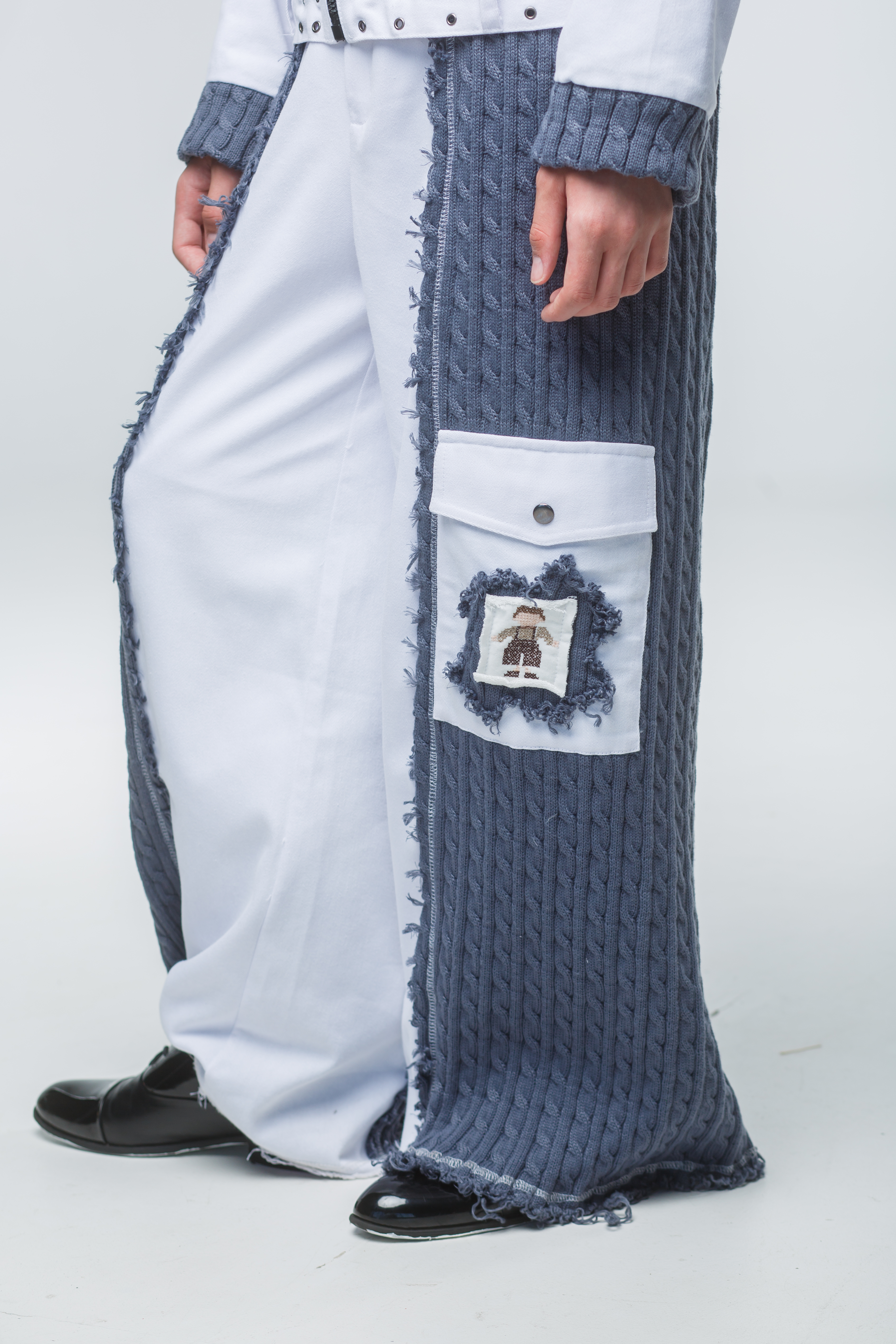 Декоративная заплатка: На кармане брюк размещена текстильная аппликация с уникальным рисунком, перекликающимся с орнаментом на рукаве.