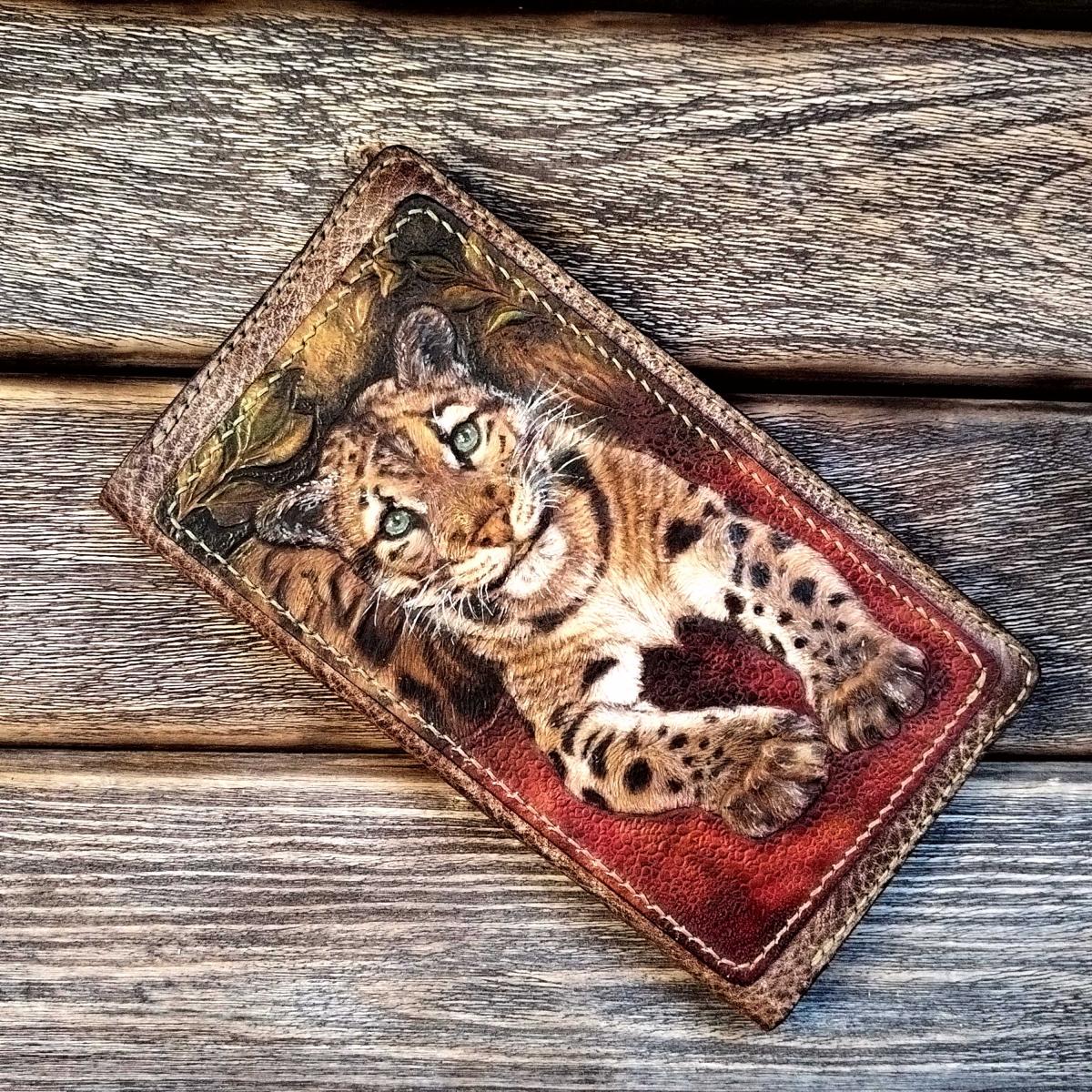 Натуральная кожа. Ручная работа, покраска, сборка. 8 карточек, два больших отделения + отделение на молнии. Паспорт поместится тоже. а также водительское удостоверение и много чего другого.