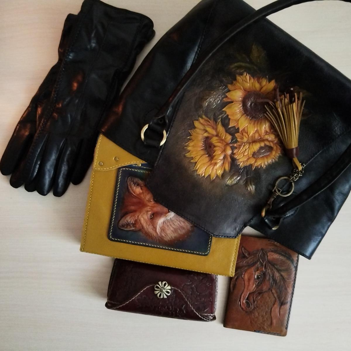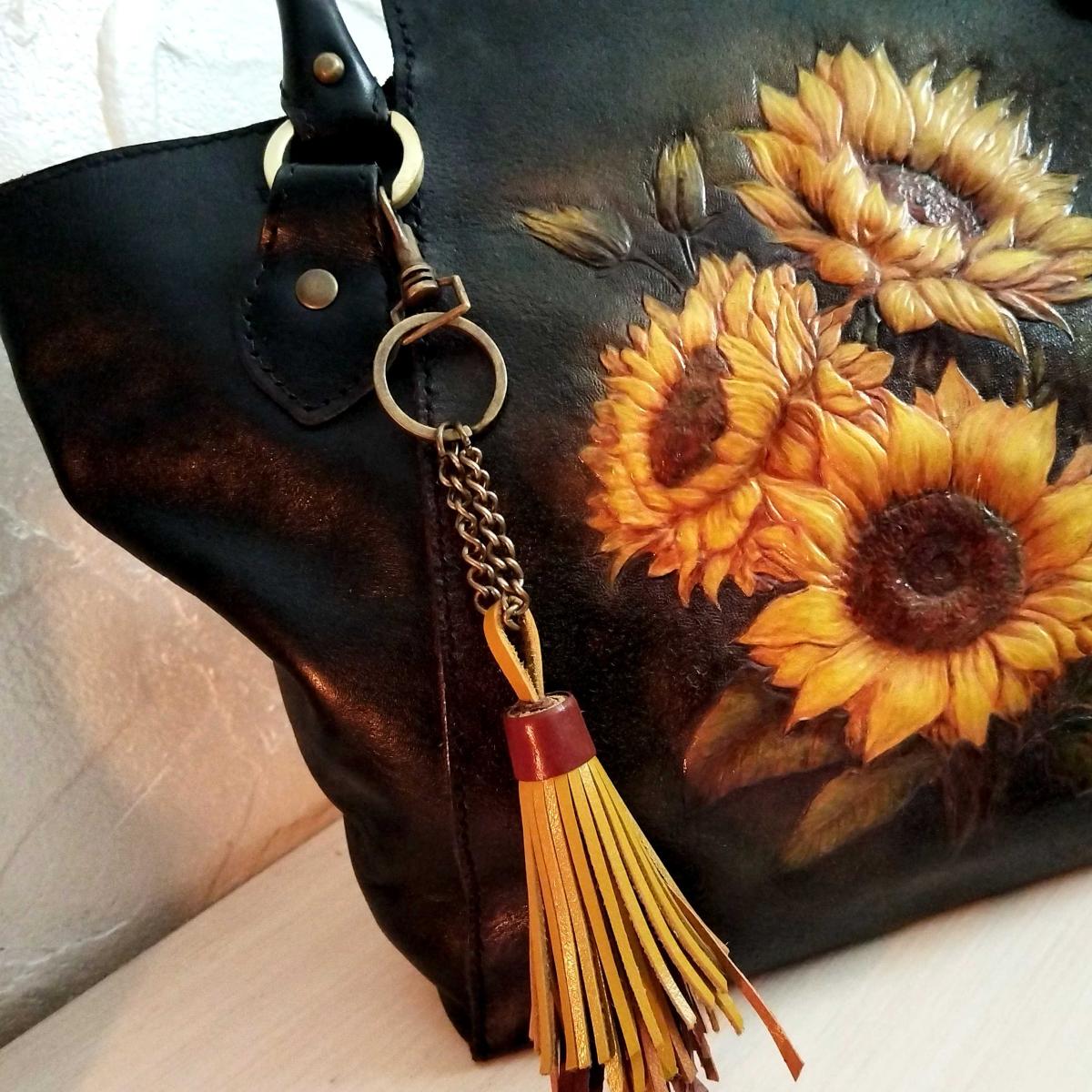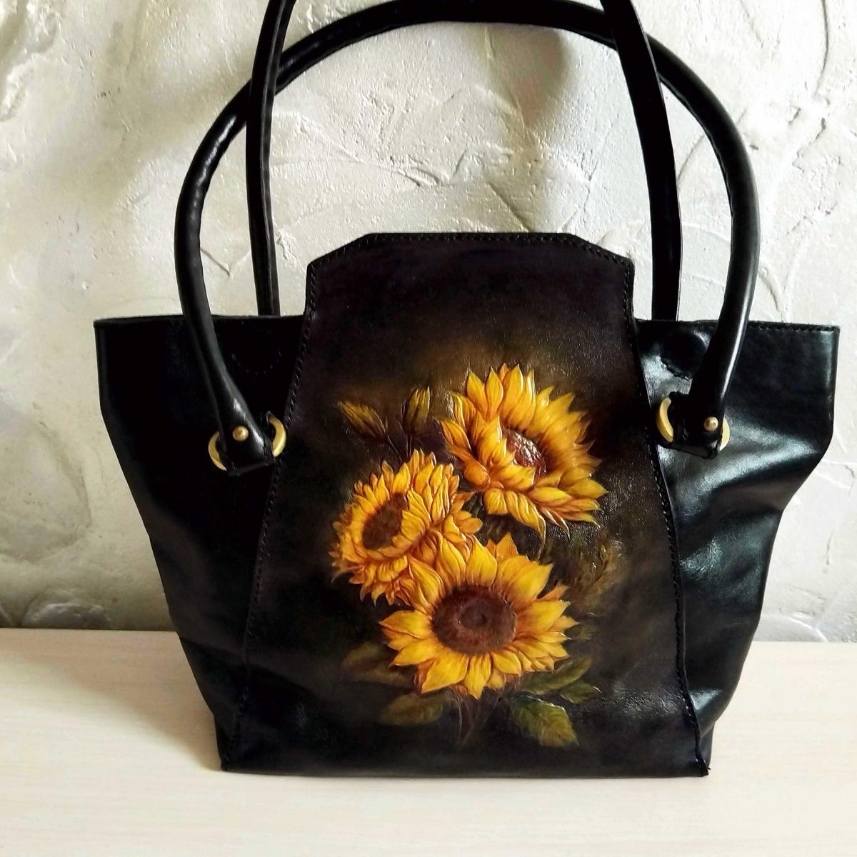 Сумка из натуральной кожи с тиснением "Подсолнухи". Тиснение выполнено на коже растительного дубления профессиональными инструментами, рисунок выполнен профессиональными красками. Полностью ручная работа от раскроя до пошива.