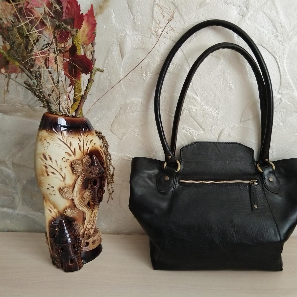 Достаточно мягкая кожа и в то же время хорошо держит форму. Закрывается с помощью магнитов. Сумка выполнена без подклада. Имеется карман на молнии на задней части, а также внутри карман на молнии и два кармашка под карточки. Ручки длинные, позволяют носить сумку на плече.