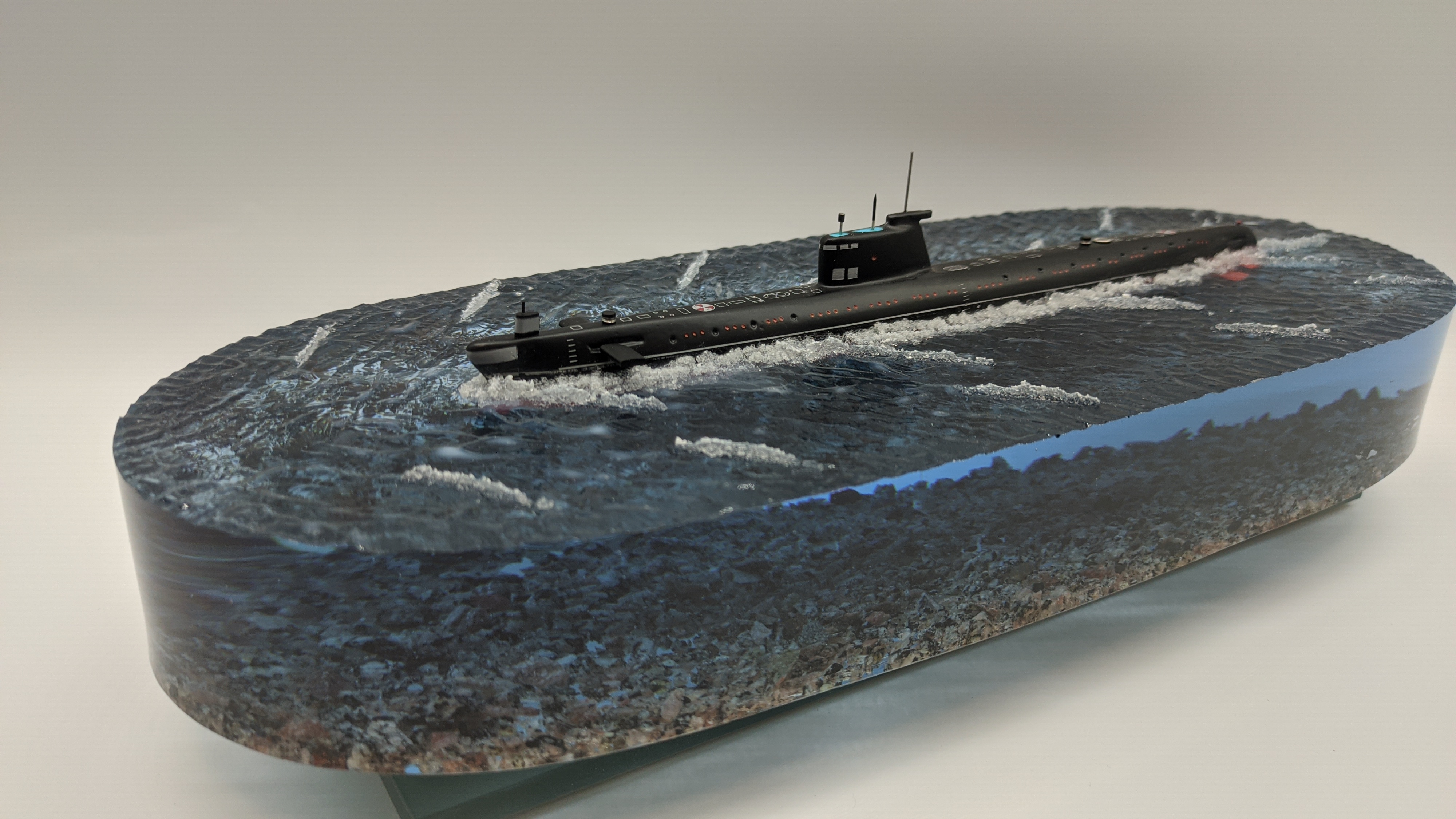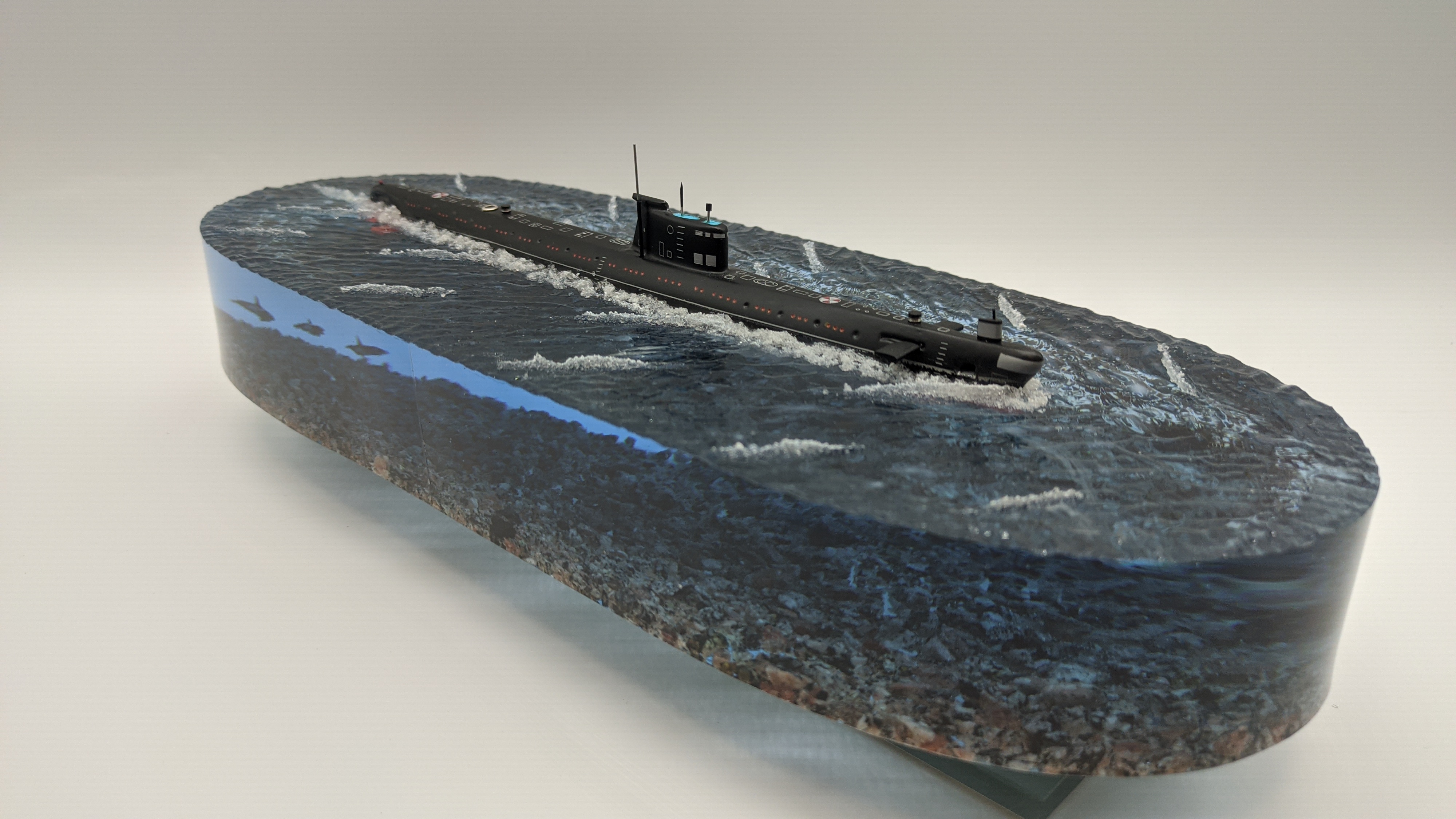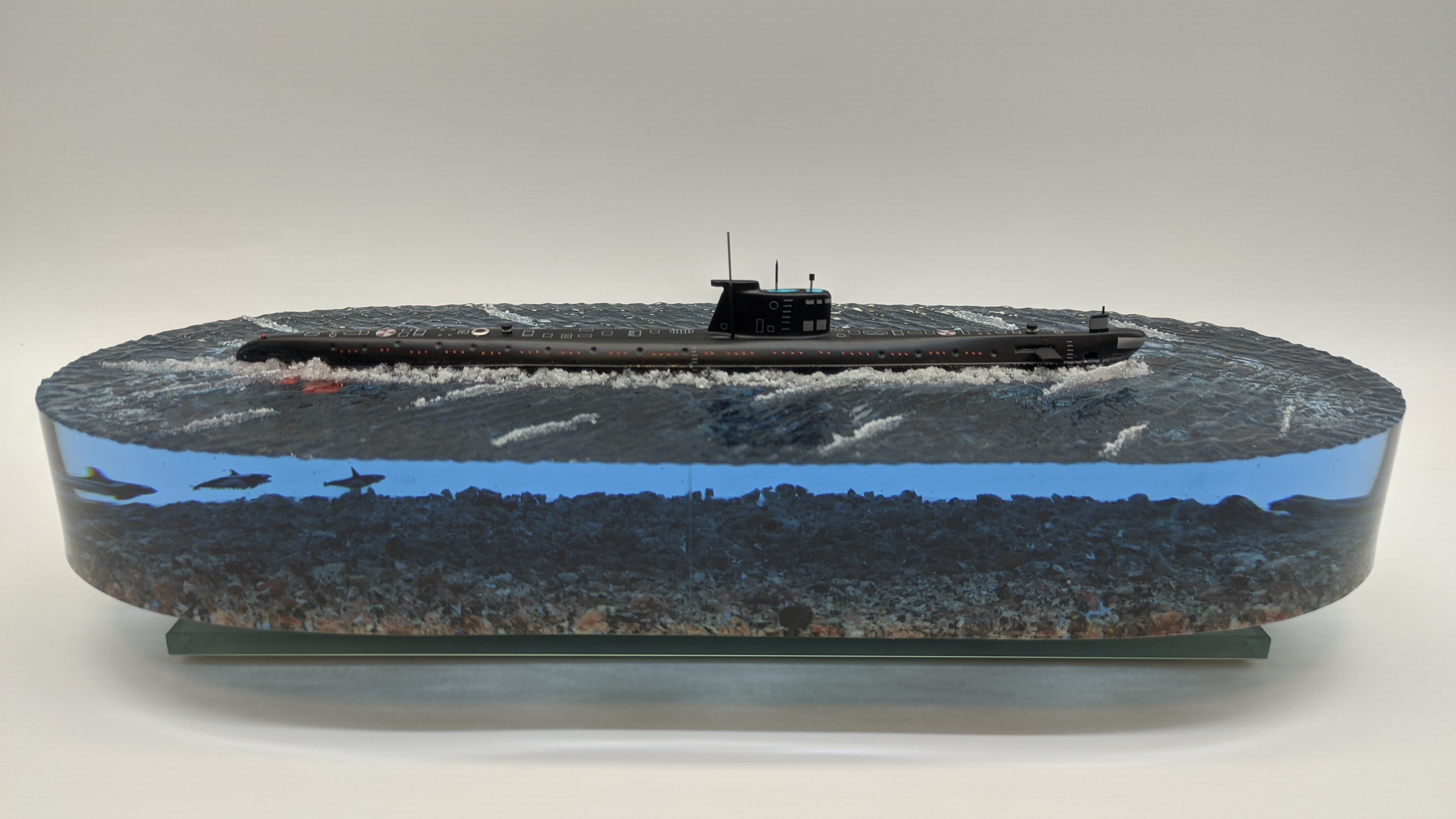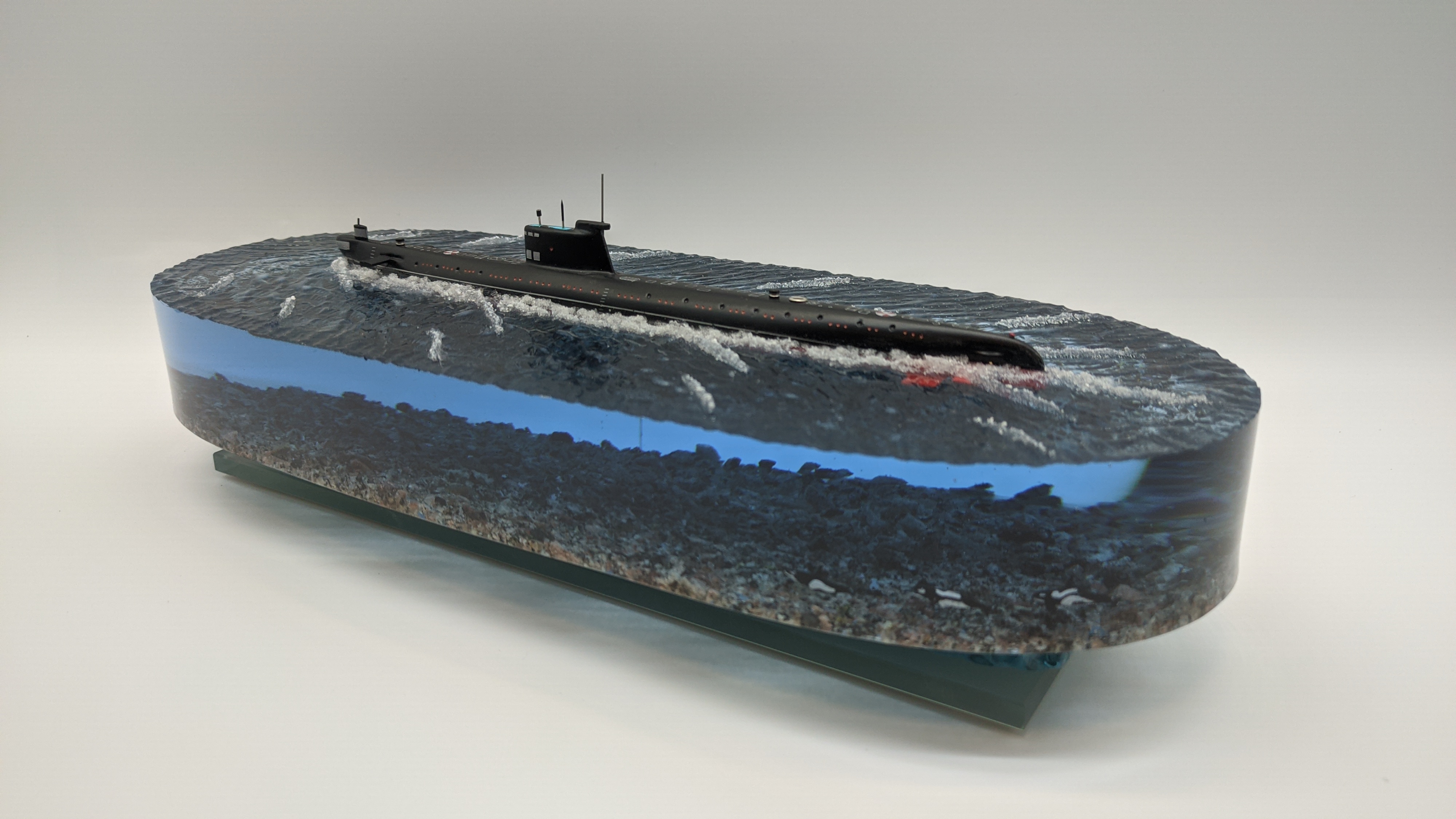 Подводная лодка проекта 641 "Фокстрот" в надводном положении. Дно натуральная гранитная крошка. Подставка стекло 8мм. Возможно добавление подсветки с аккумулятором и управлением с пульта и с телефона ВТ. (+3000р) Отправка в регионы компанией СДЕК. Возможна оплата при получении.