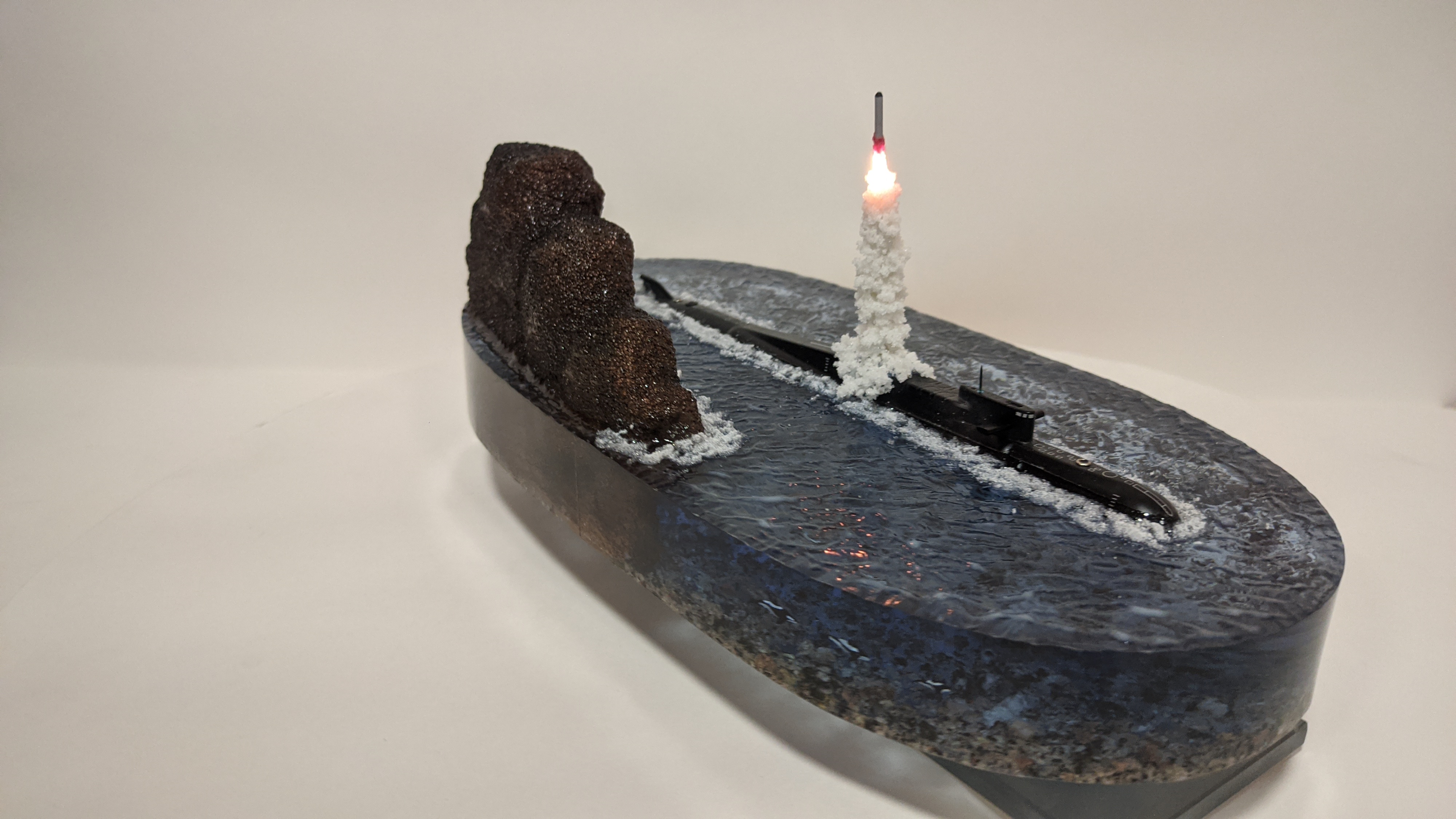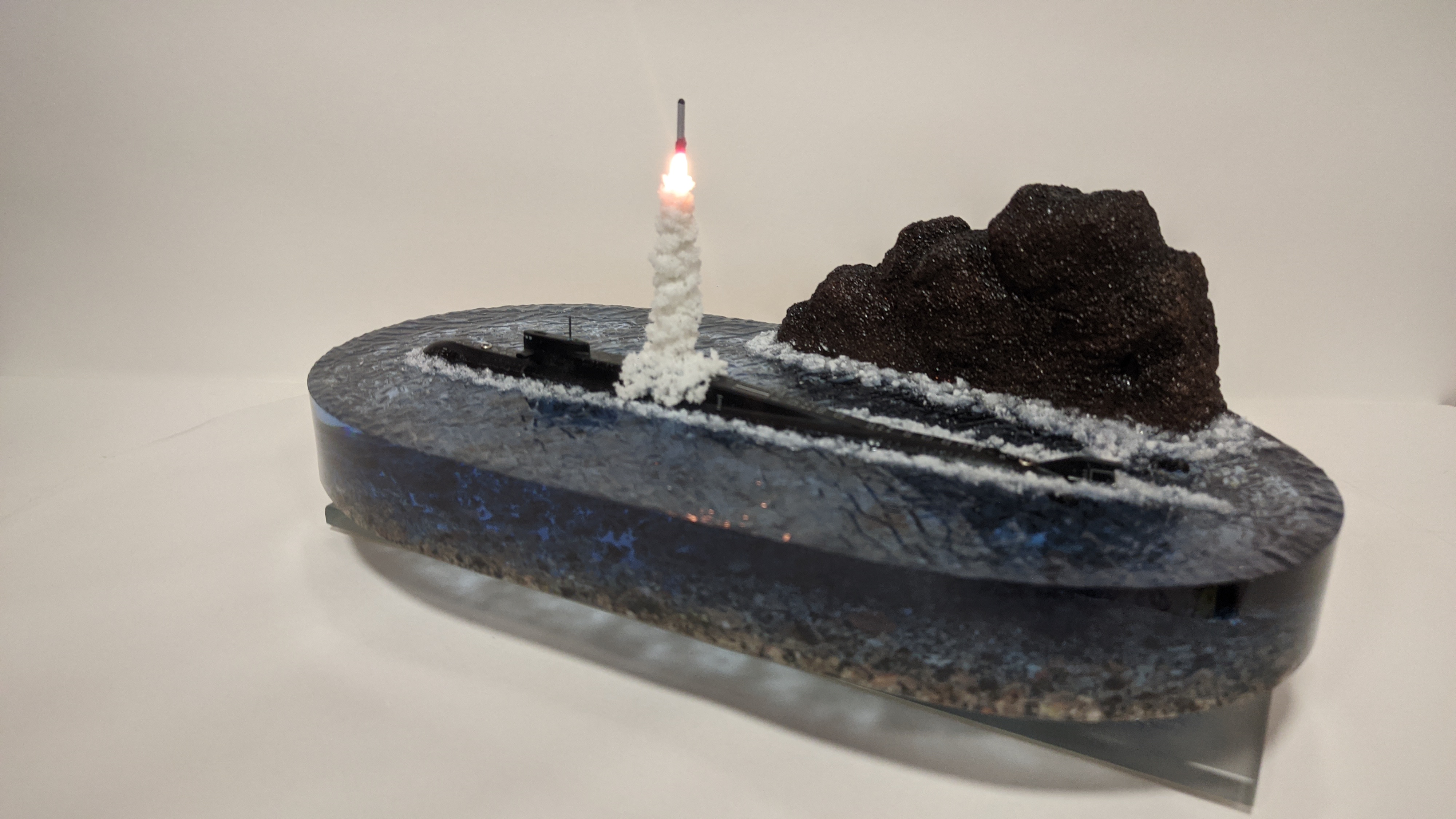 Модель подводной лодки 667БДРМ "Дельфин" с имитацией пуска МБР (ракеты). След от ракеты светится. Встроенный аккумулятор. Сзади порт для зарядки. Включается сенсорной кнопкой.