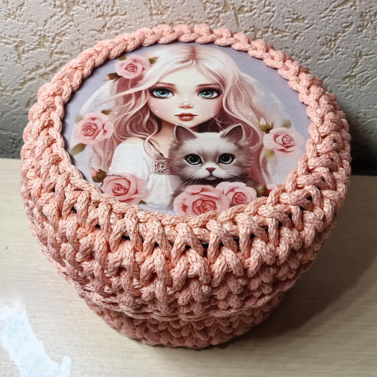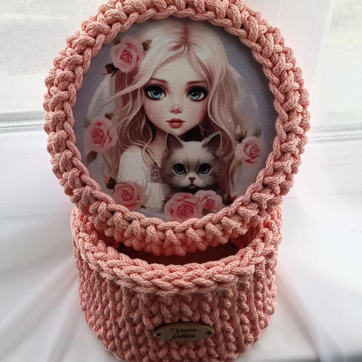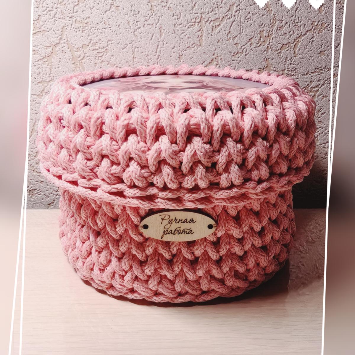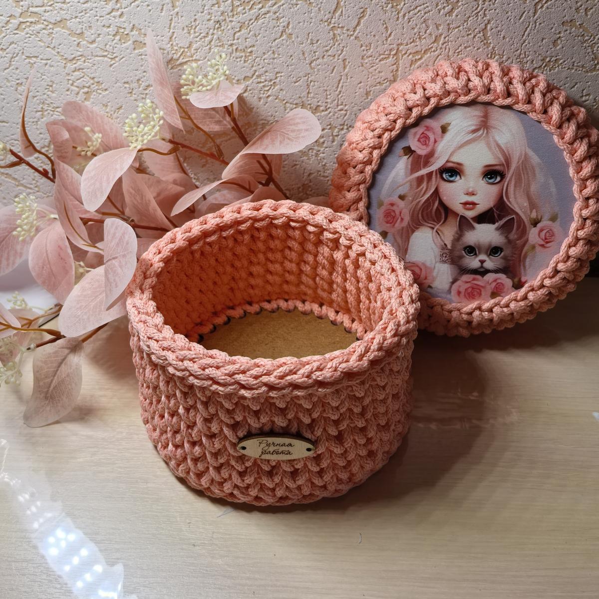 Корзинка круглая вязаная крючком из полиэфирного шнура 5мм. Деревянное донышко диаметром 15 см. Корзинка очень нежного персикового цвета. Отлично подойдет на подарок или как органайзер для разных мелочей. Высота корзинки без крышки 10см, вместе с крышкой-12см.