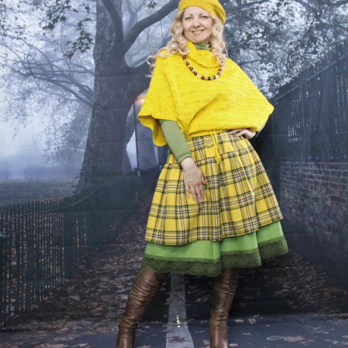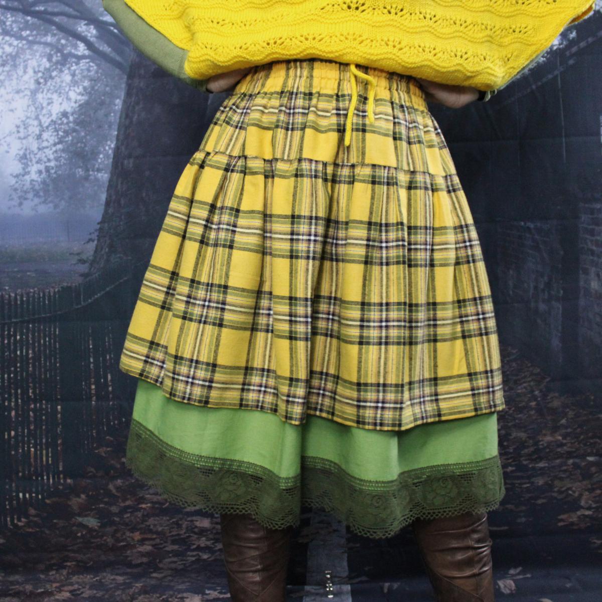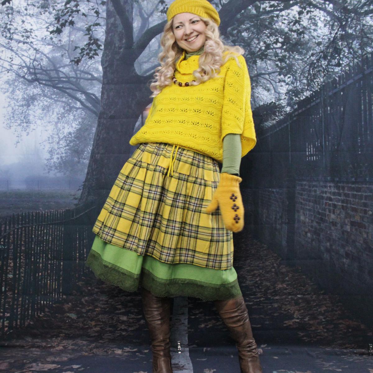 Юбка сшита из костюмной ткани типа фланели в клетку ( хлопок с полиэстером), второй слой из полульна светло-зеленого цвета, по низу отделана хлопковым кружевом.