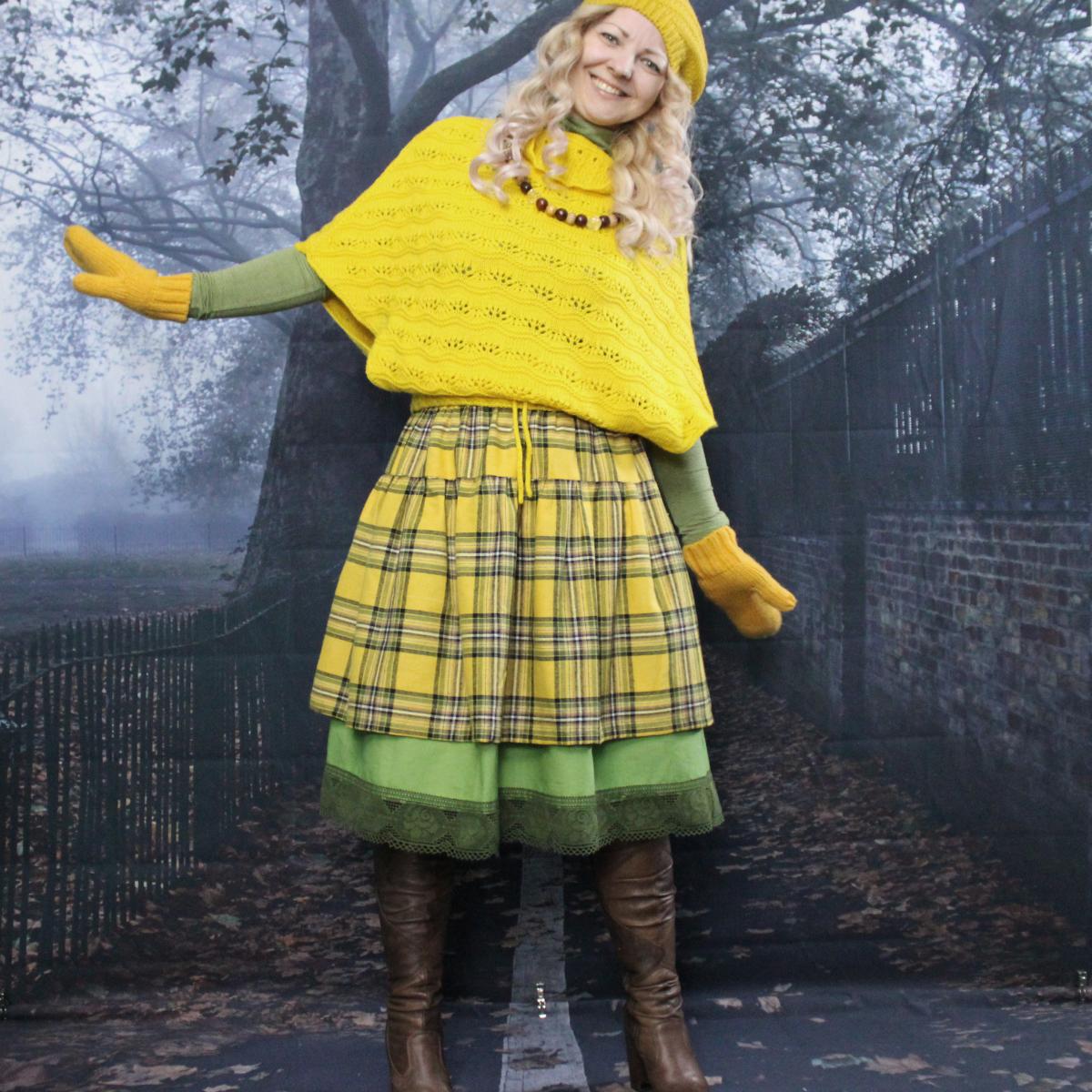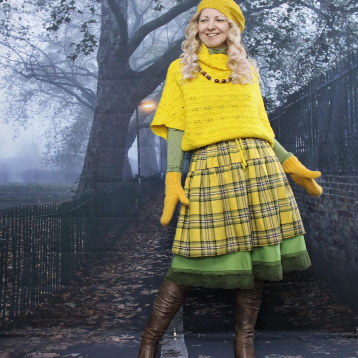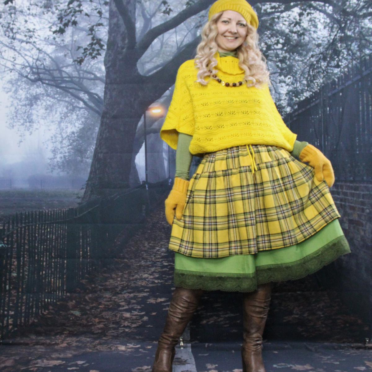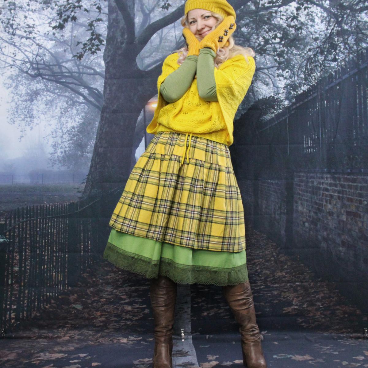 Юбка сшита из костюмной ткани типа фланели в клетку ( хлопок с полиэстером), второй слой из полульна светло-зеленого цвета, по низу отделана хлопковым кружевом.