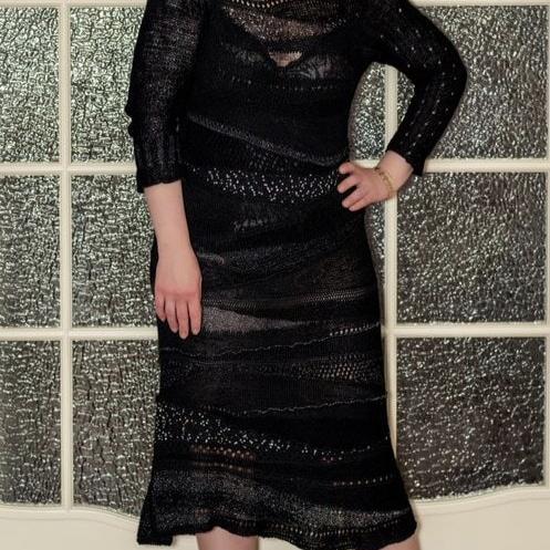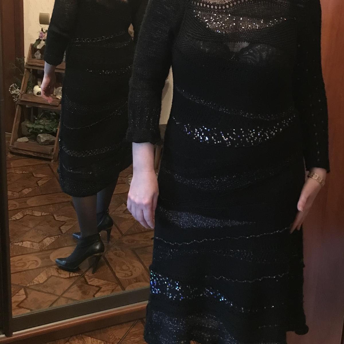 Это уникальное черное платье, выполненное в технике фриформ. Его привлекательность заключается в том, что это единственный экземпляр, созданный вручную по авторскому дизайну. Утонченный блеск и оригинальный силуэт делают его идеальным выбором для особых случаев и мероприятий, где вы хотите выглядеть неповторимо и стильно.
