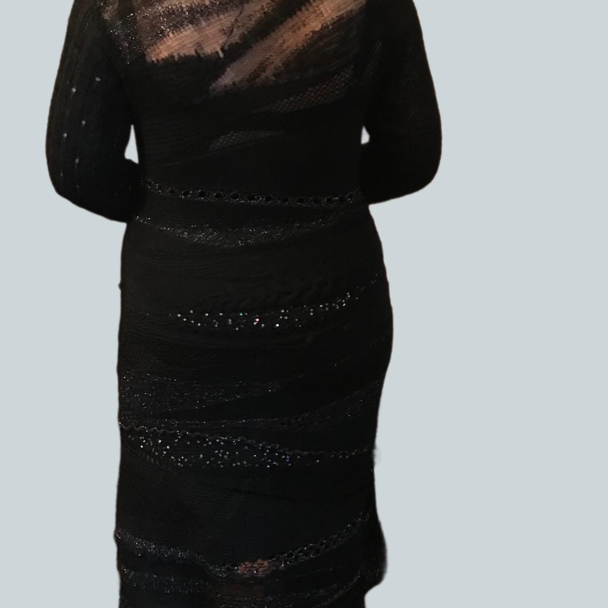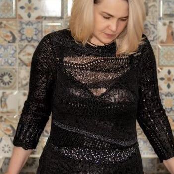 Глухой ворот придает целомудренности, а полупрозрачный лиф - интригует и завораживает созерцателей. Укороченные асимметричные рукава демонстрируют изящество женских рук и дают возможность продемонстрировать на них надетые украшения. Пайетки и люрекс добавляют неповседневности и незаурядности черному цвету.