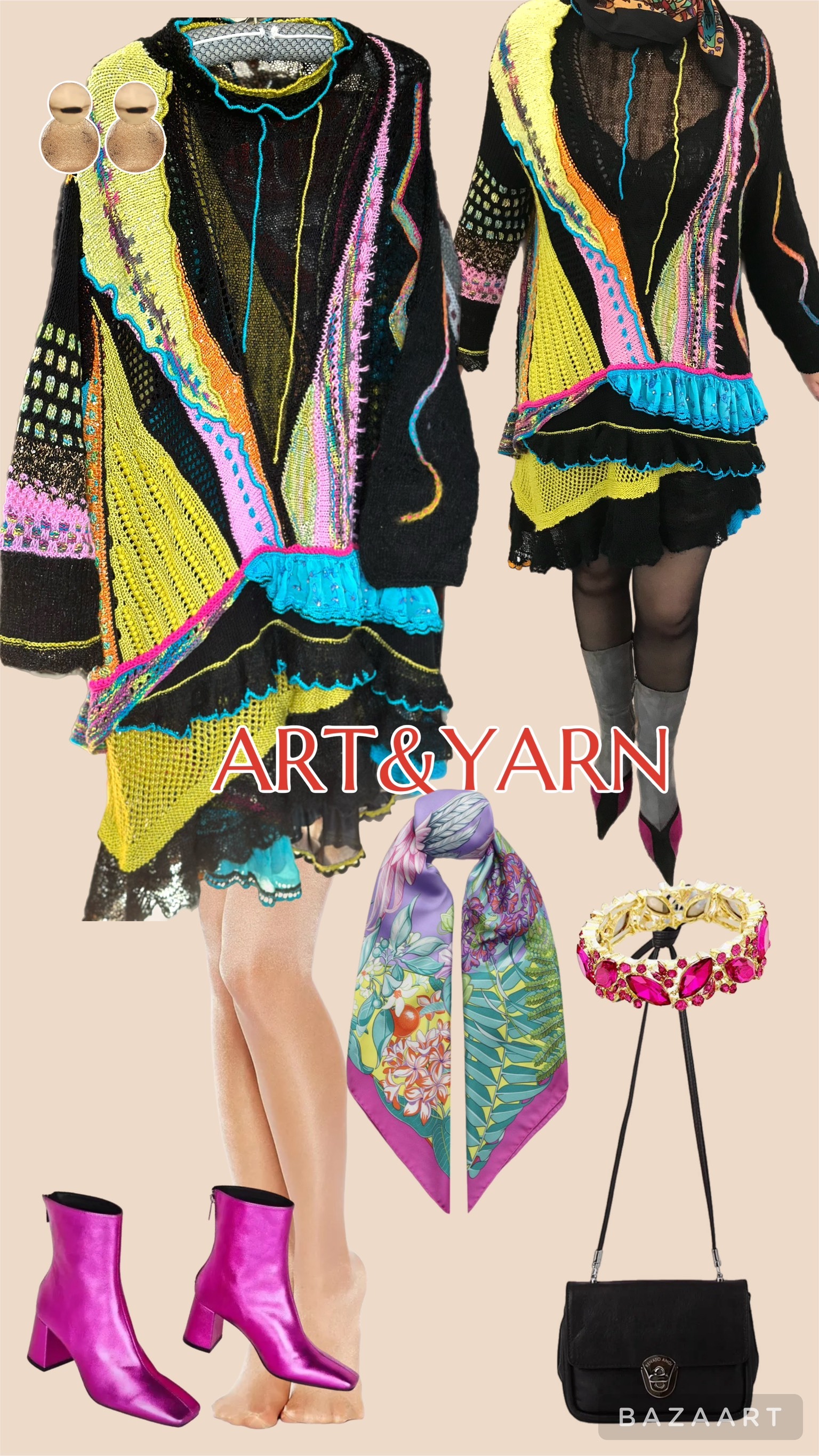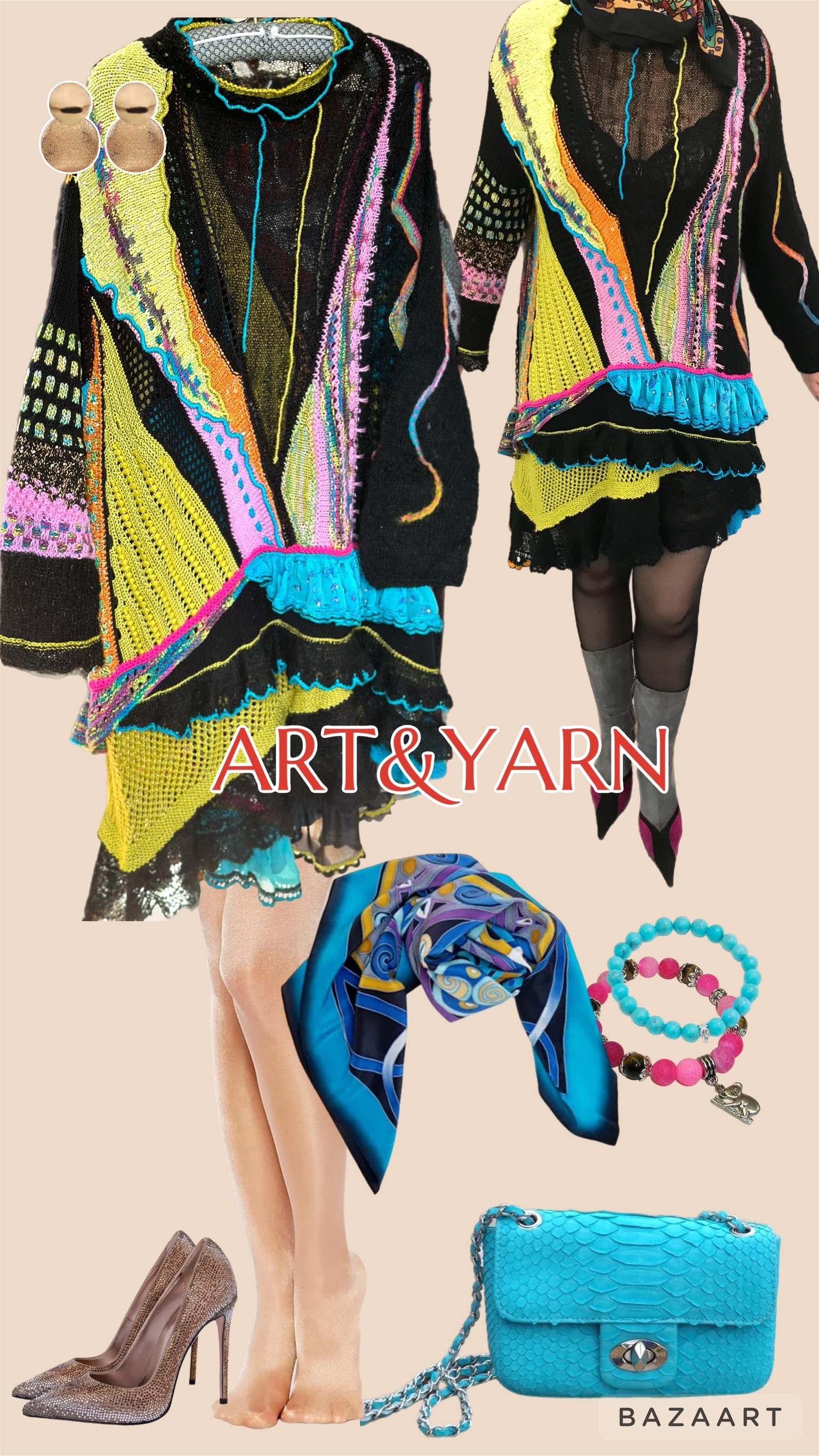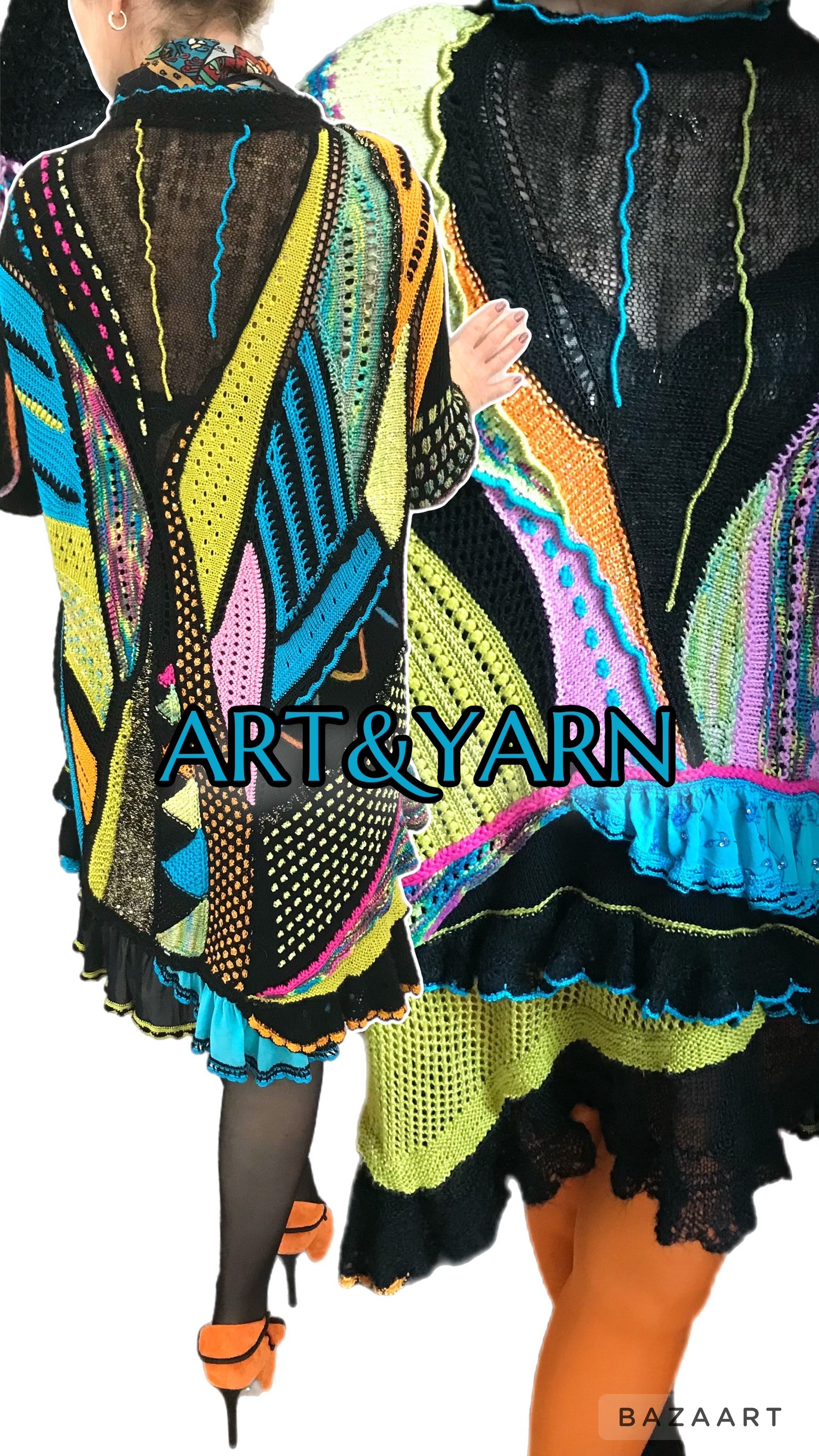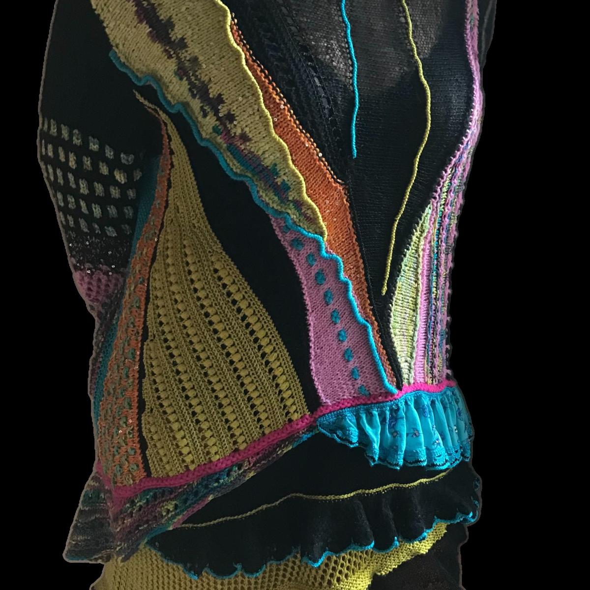 Связано руками из натурального итальянского букле, шелка, кашемира, мериноса, вискозы и хлопка. Оборки- шелковые ленты сари. Декорировано пайетками, сухим валянием м и вышивкой.