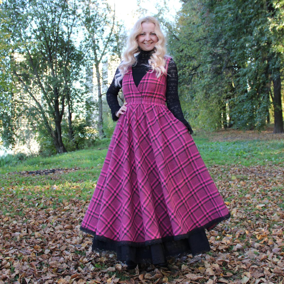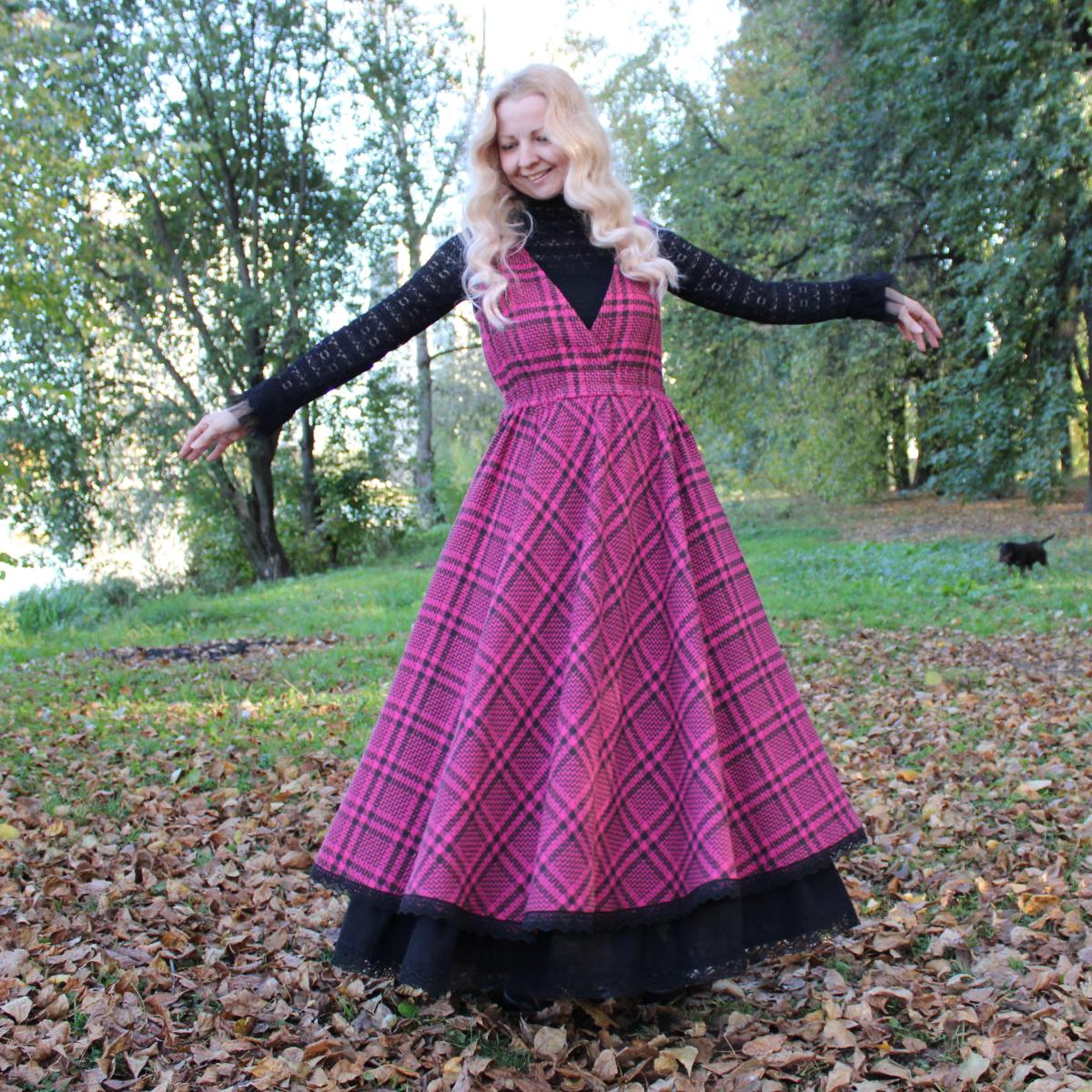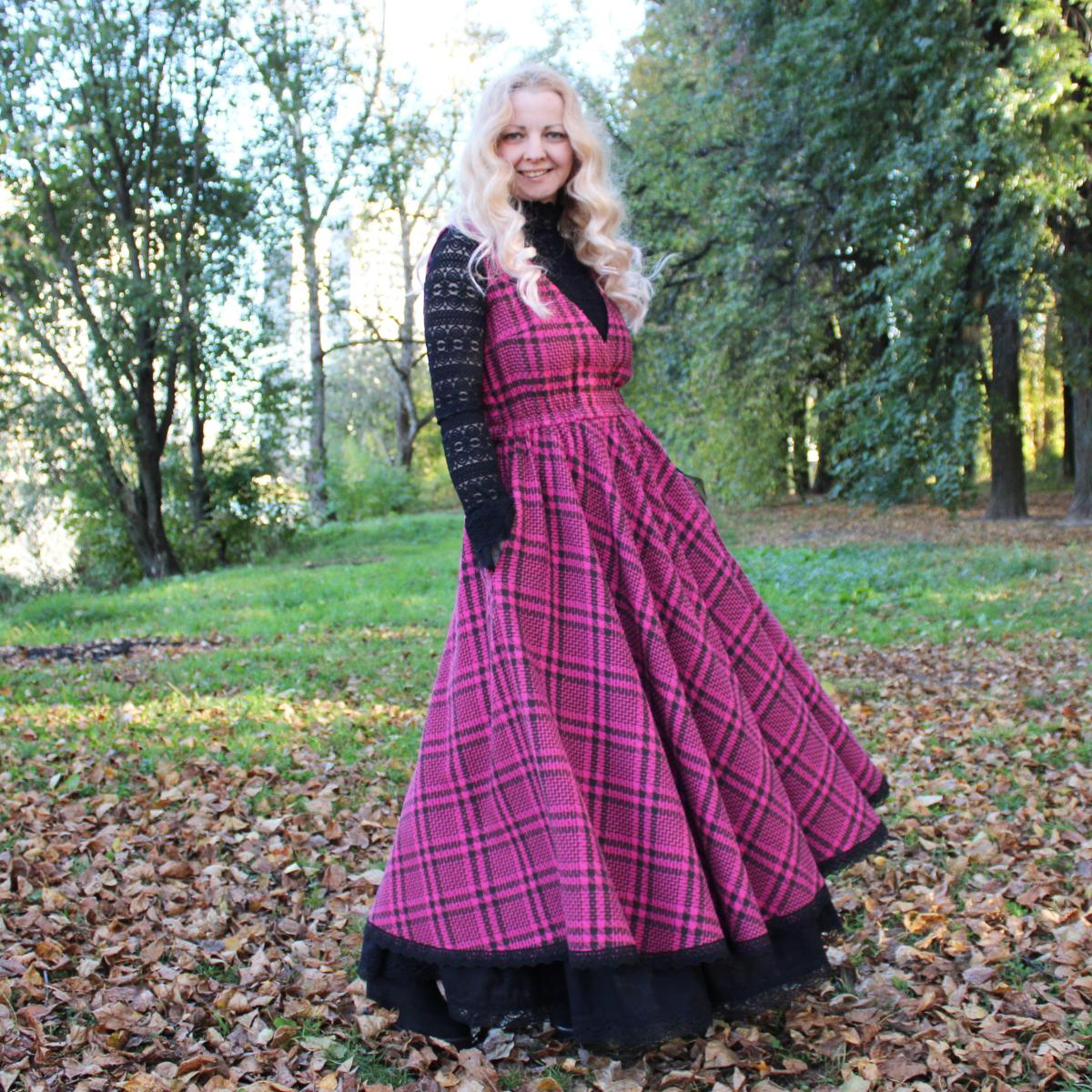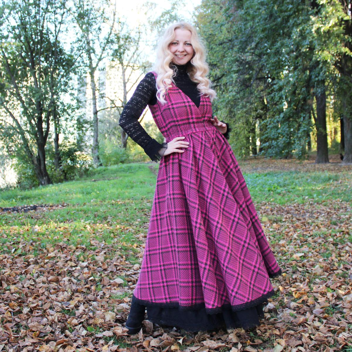 Сарафан идет в комплекте с подъюбником. Сшит из твида в клетку красивого цвета фуксия (хлопок с полиэстером). Подъюбник сшит из полульна черного цвета. По низу украшено хлопковым кружевом.