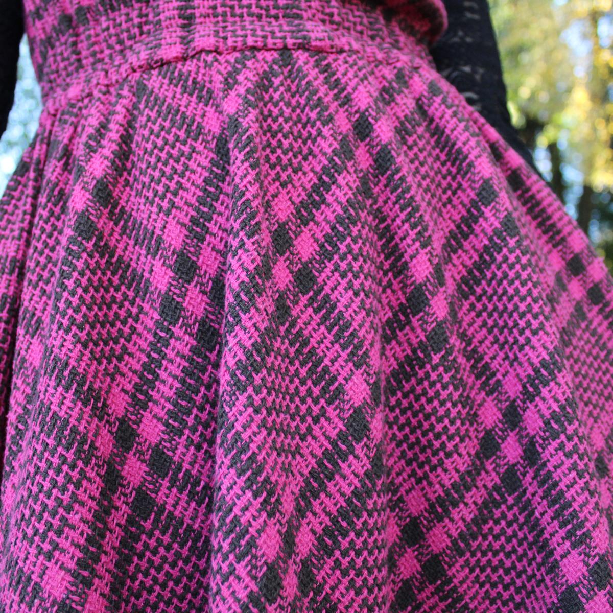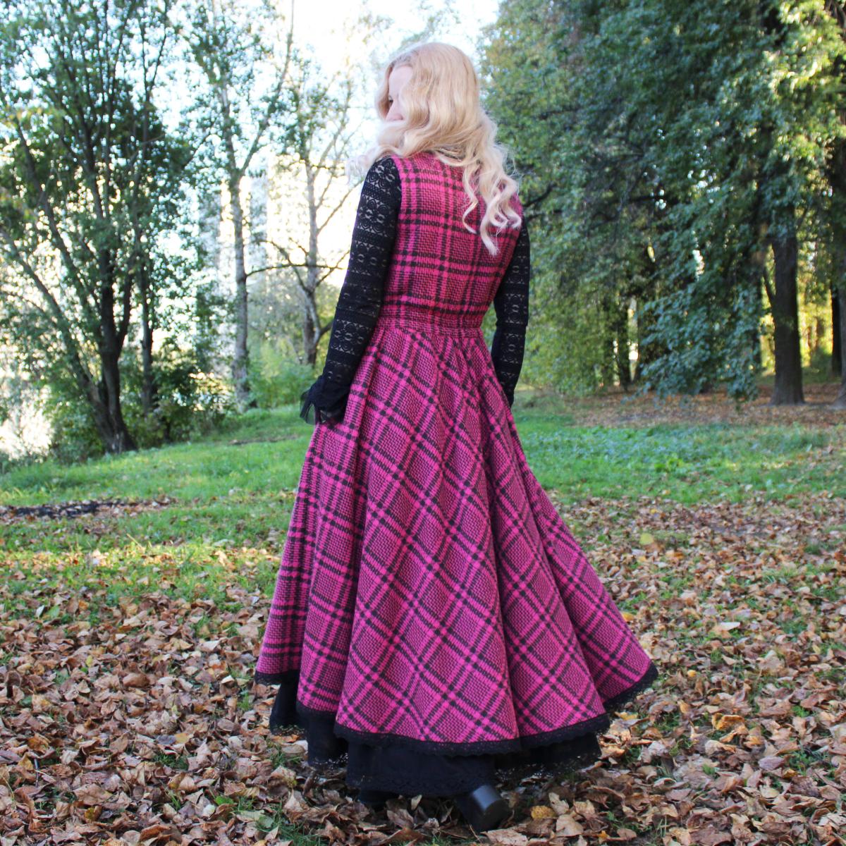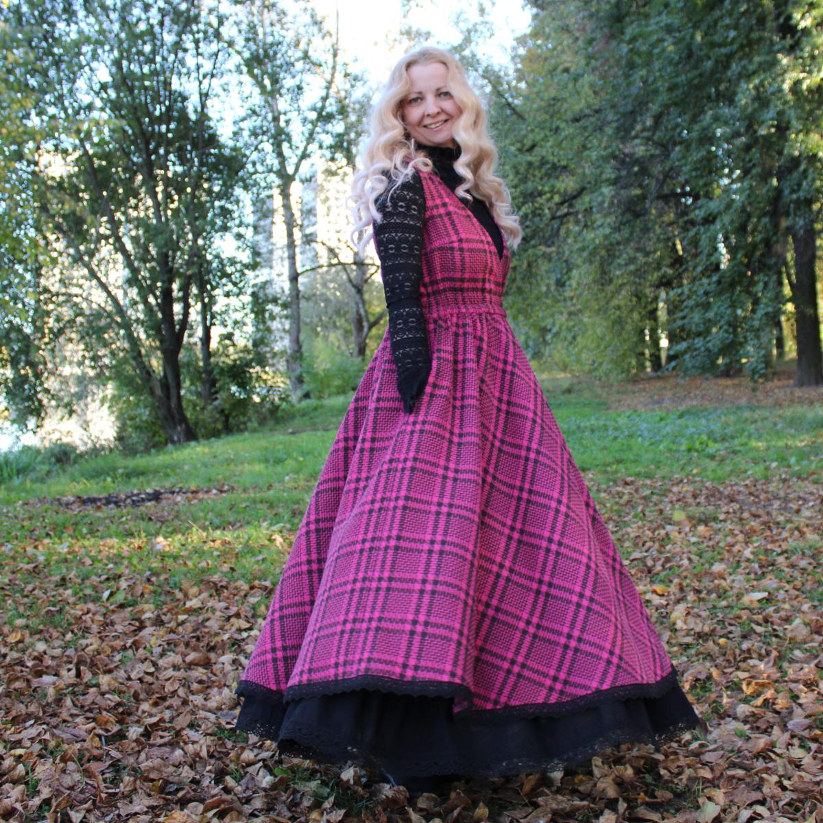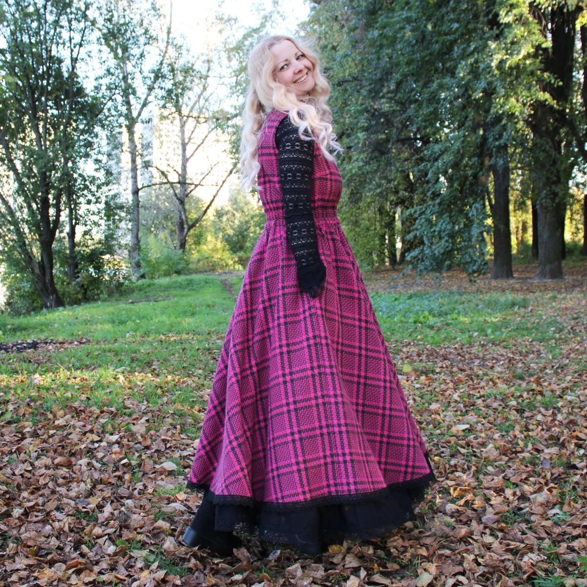 Сарафан идет в комплекте с подъюбником. Сшит из твида в клетку красивого цвета фуксия (хлопок с полиэстером). Подъюбник сшит из полульна черного цвета. По низу украшено хлопковым кружевом.