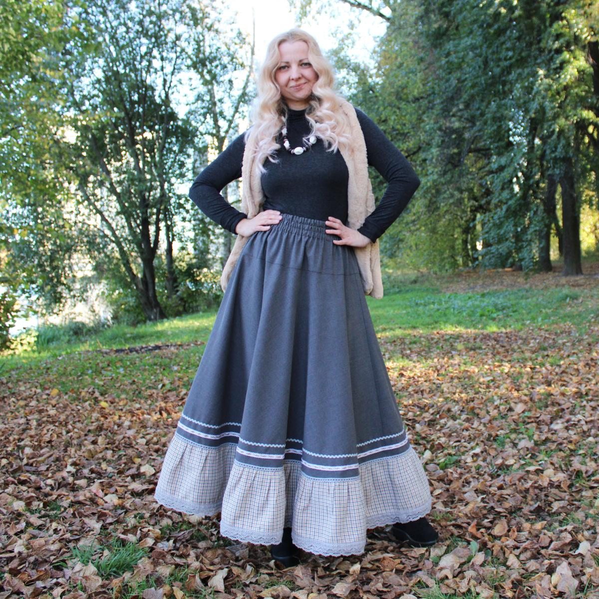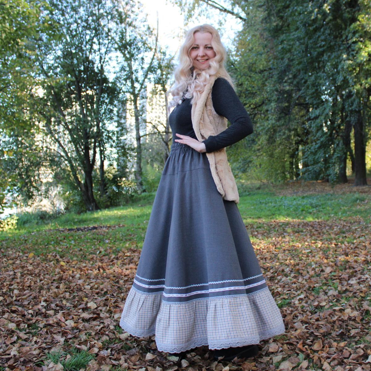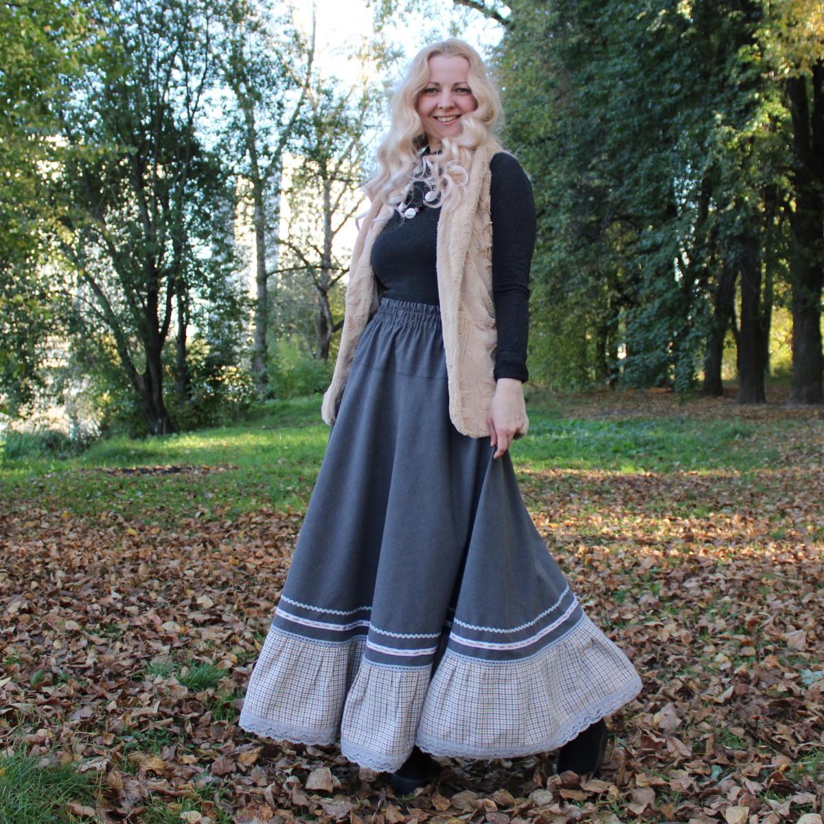 Юбка сшита из полушерсти серого цвета и отделана воланом из костюмной ткани в мелкую клетку . По низу отделана кружевами и тесемками. На вискозной подкладке.