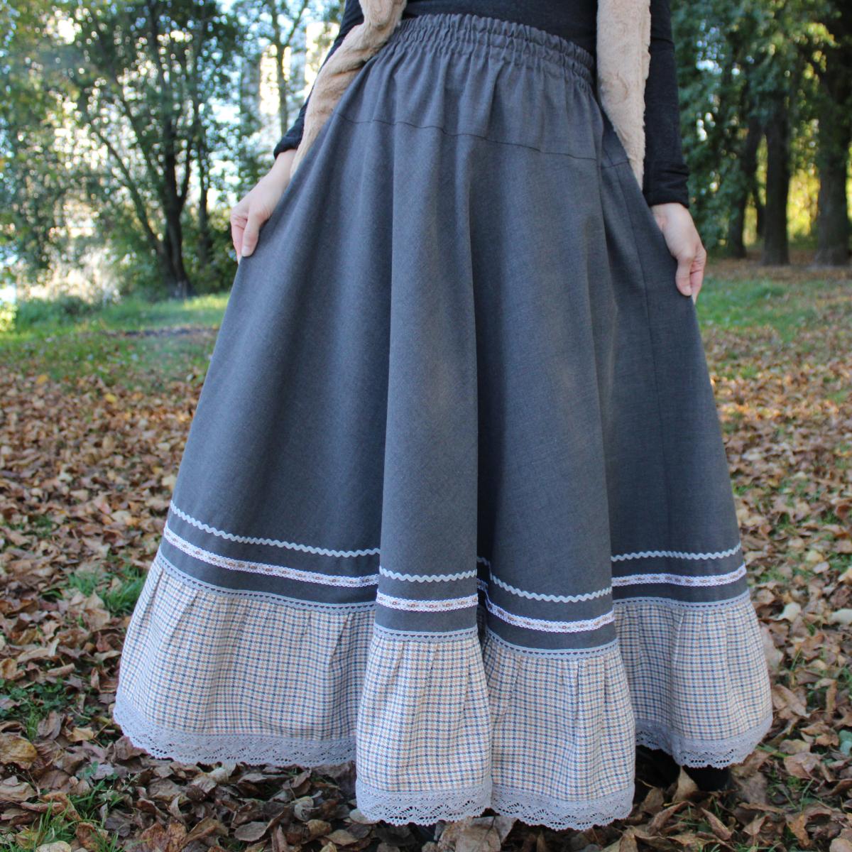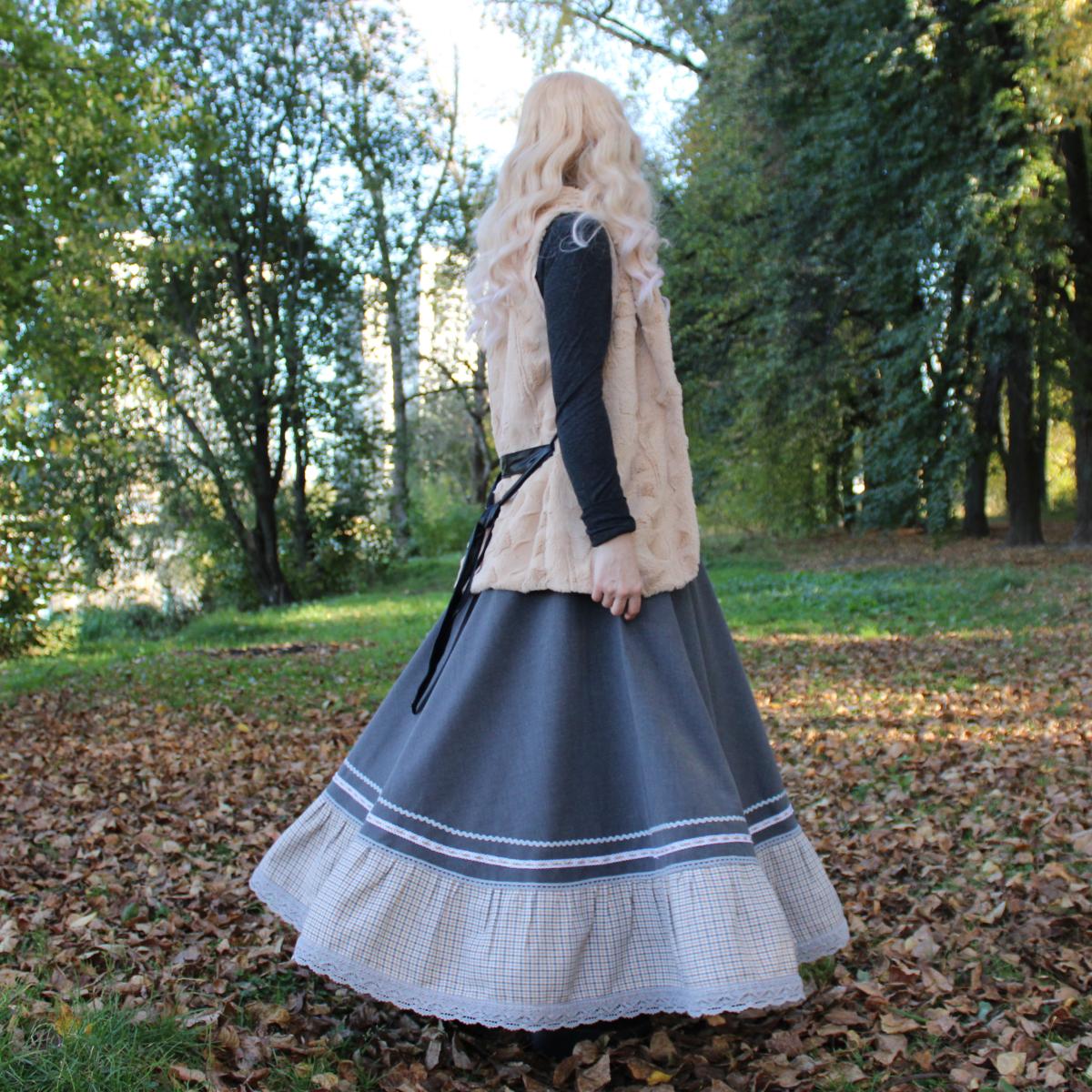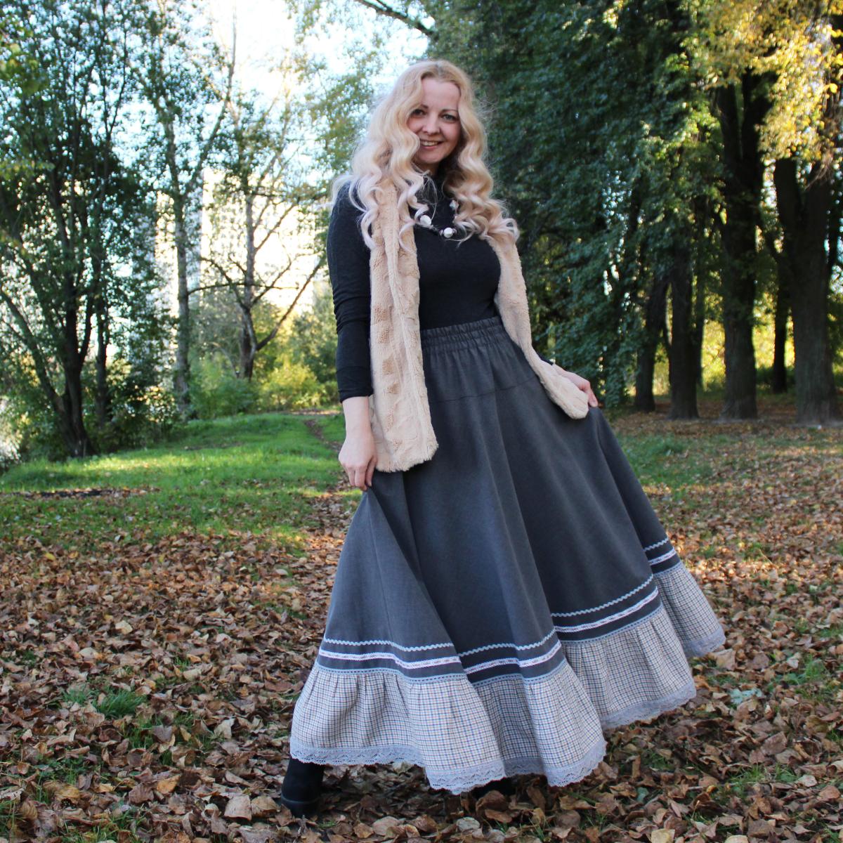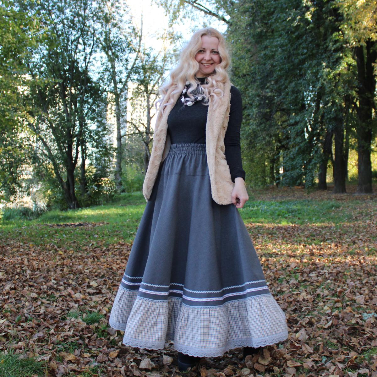 Юбка сшита из полушерсти серого цвета и отделана воланом из костюмной ткани в мелкую клетку . По низу отделана кружевами и тесемками. На вискозной подкладке.