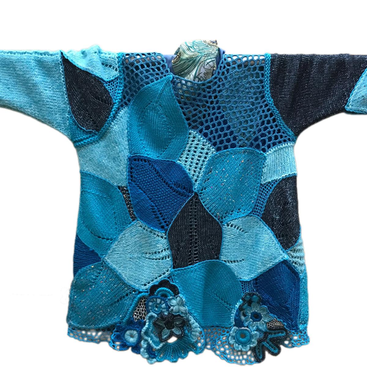 ГОЛУБАЯ ЛАЗУРЬ — это яркий женский джемпер, созданный вручную по авторским эскизам в единственном экземпляре. Его асимметричные рукава и слегка расклешенный силуэт, украшенные вставками в технике ирландского кружева, делают этот джемпер настоящим произведением искусства в вашем гардеробе.