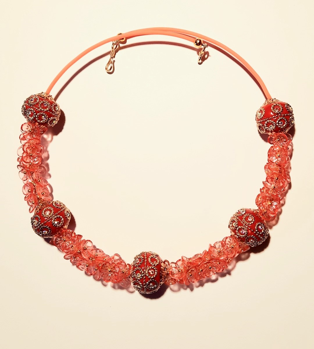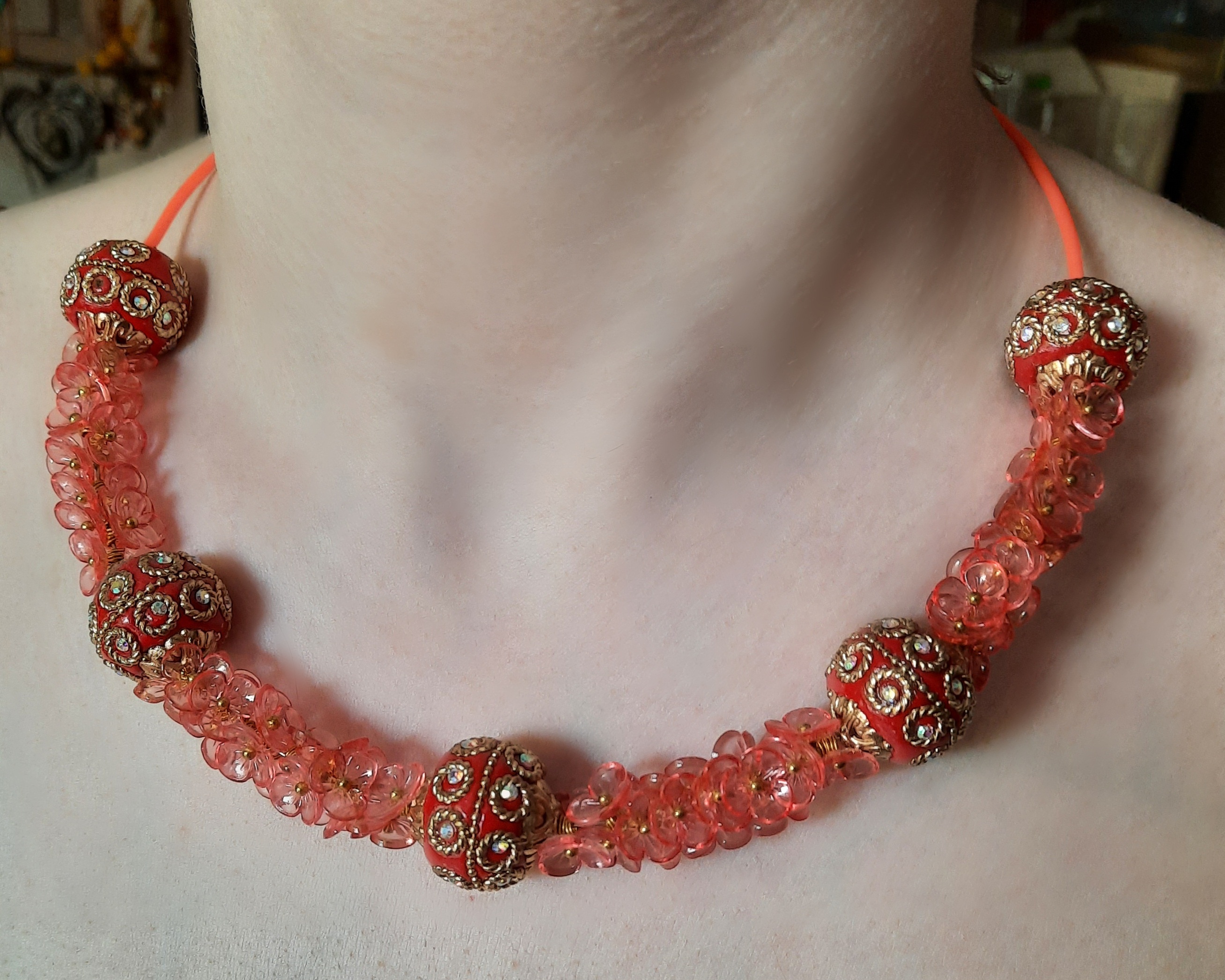 Летнее ажурное колье из мелких акриловых цветов, посаженых на пины и крупных декоративных бусин ручной работы. Использованы фурнитура под золото, мемори проволока и оранжевый силиконовый шнур. В диаметре 15 см, длина изделия 47 см.