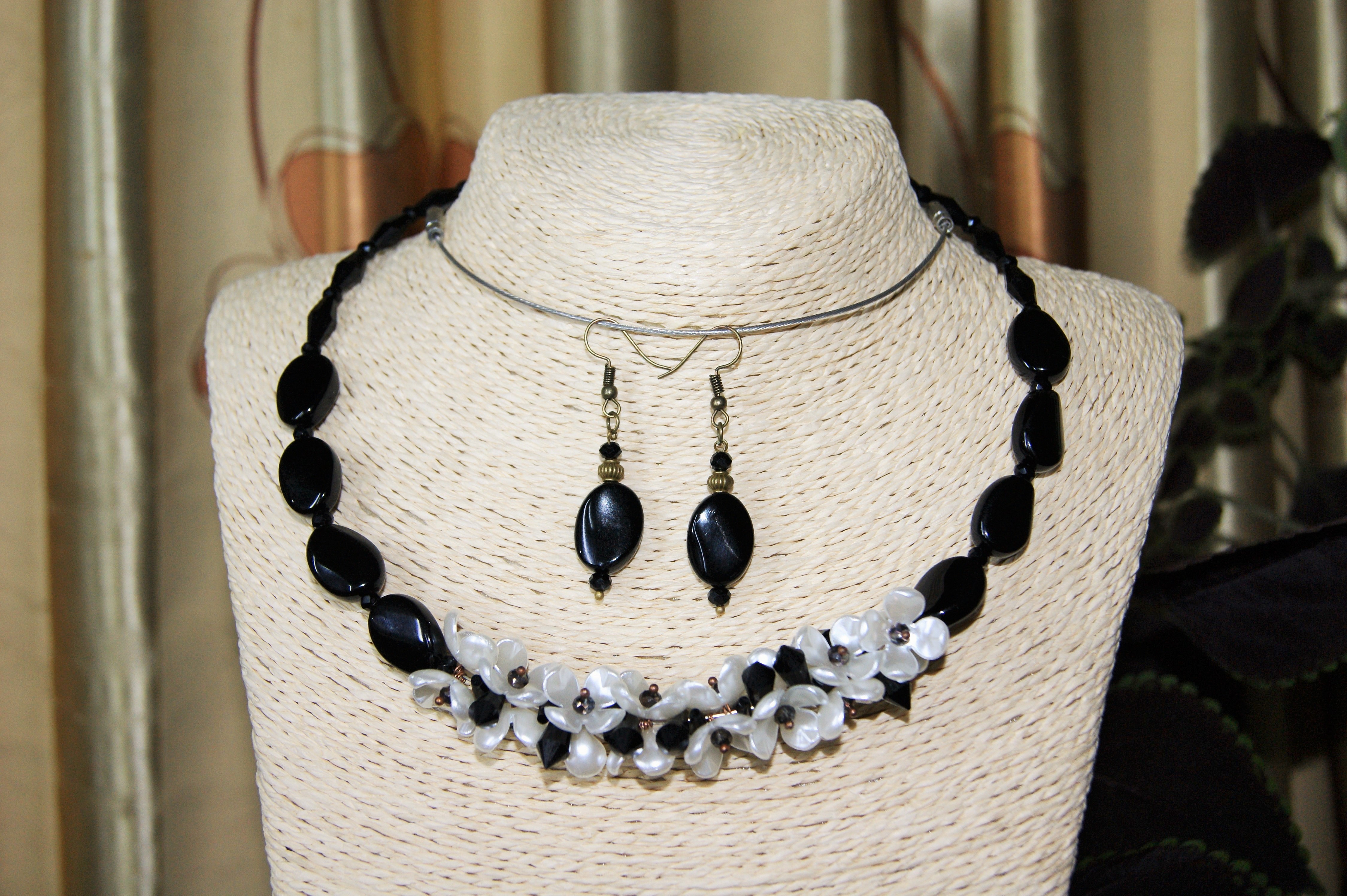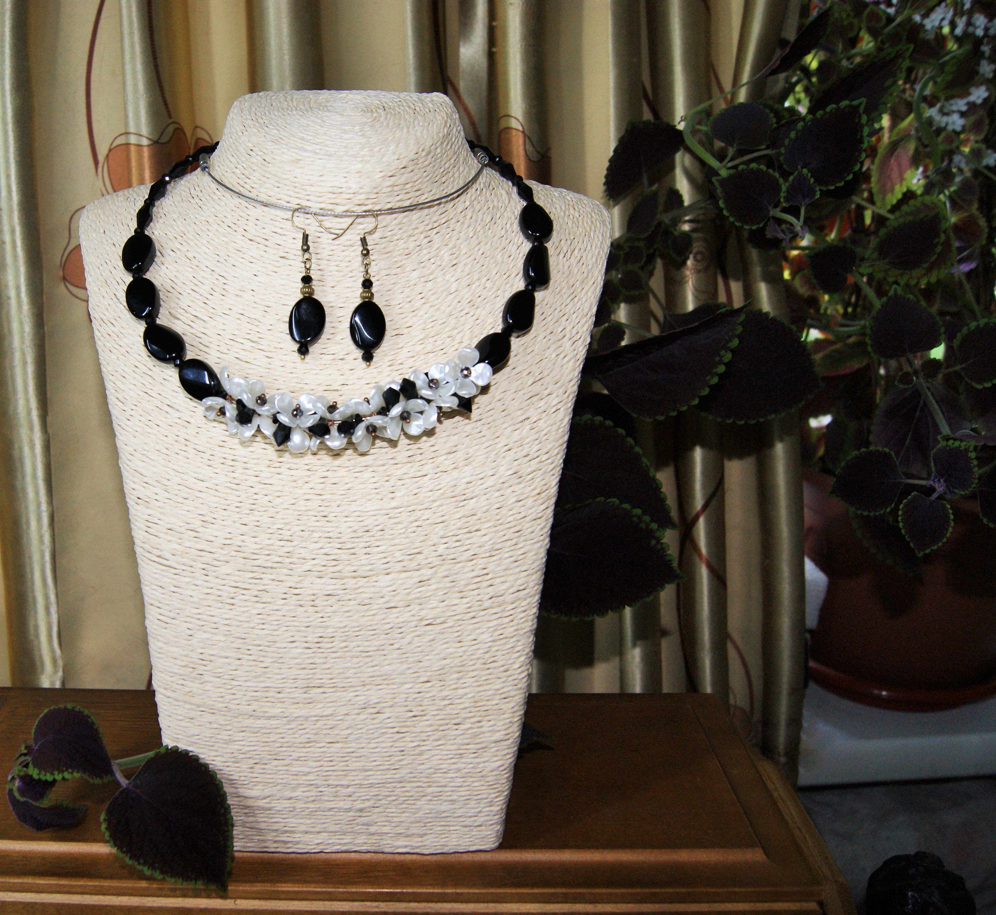Комплект состоящий из ожерелья и пары серёг. Использованные в изделии материалы: бусины чёрные овальные 13х18 мм - оникс, бусины черные биконусы 6х12 мм - австрийский гранёный кристалл, бисер 3х4 мм -гранёный кристалл, цветок - белый акрил, фурнитура под бронзу (мемори-проволока, замок, швензы, пины, соединительные кольца). Окружность мемори-проволоки с замком 48 см.