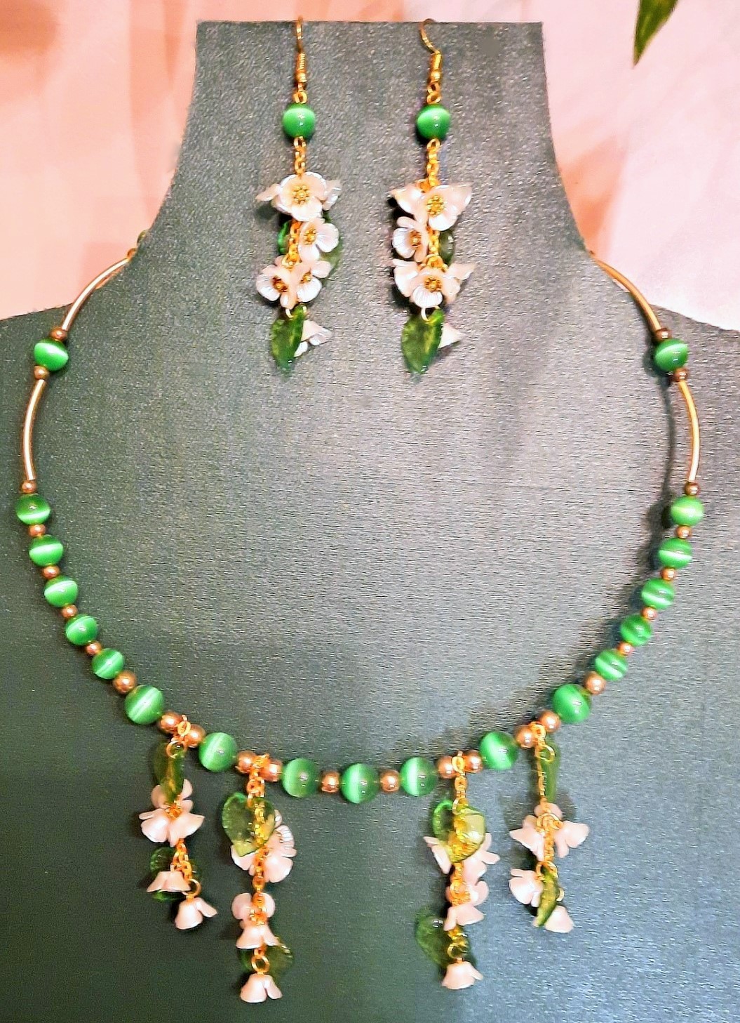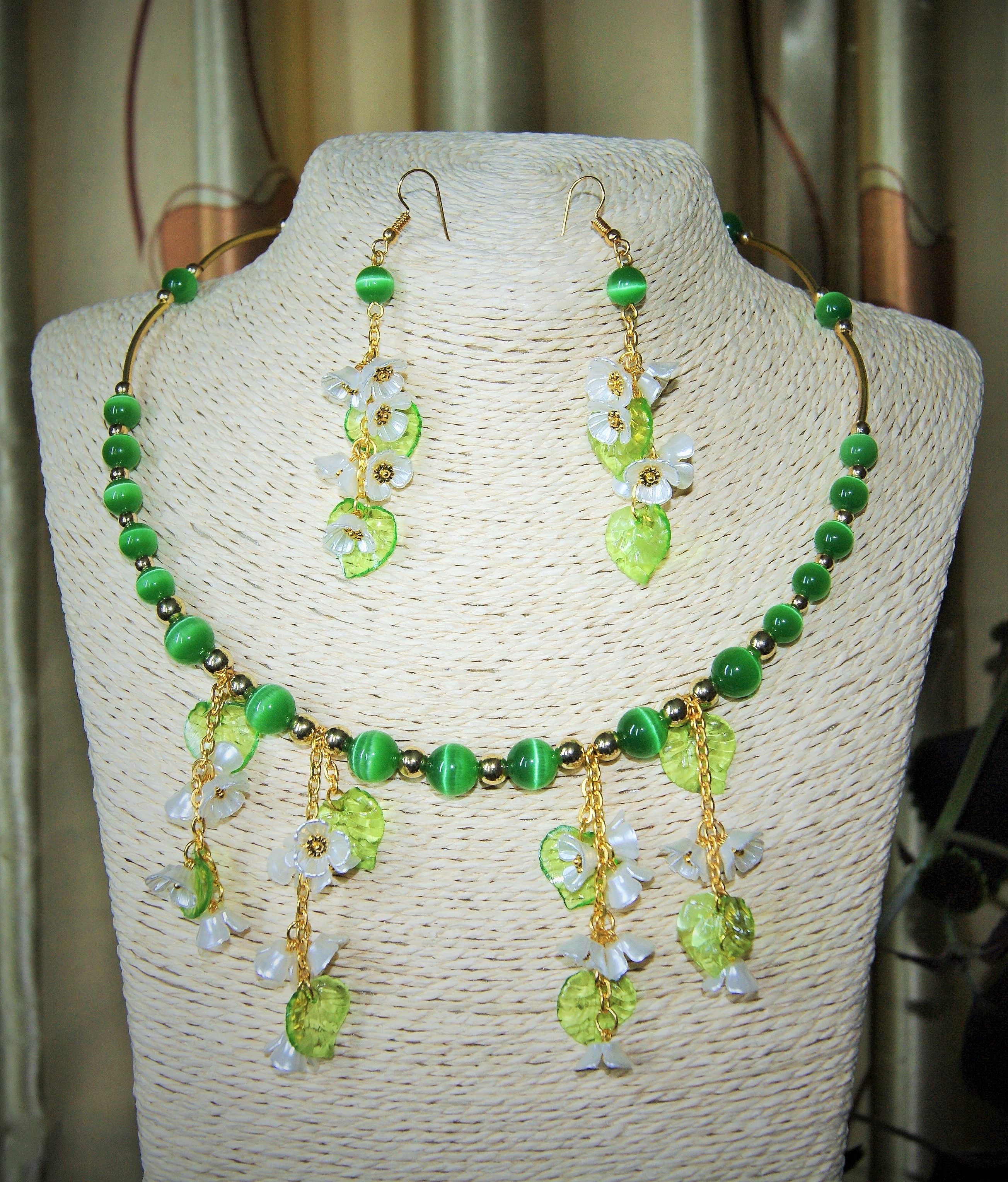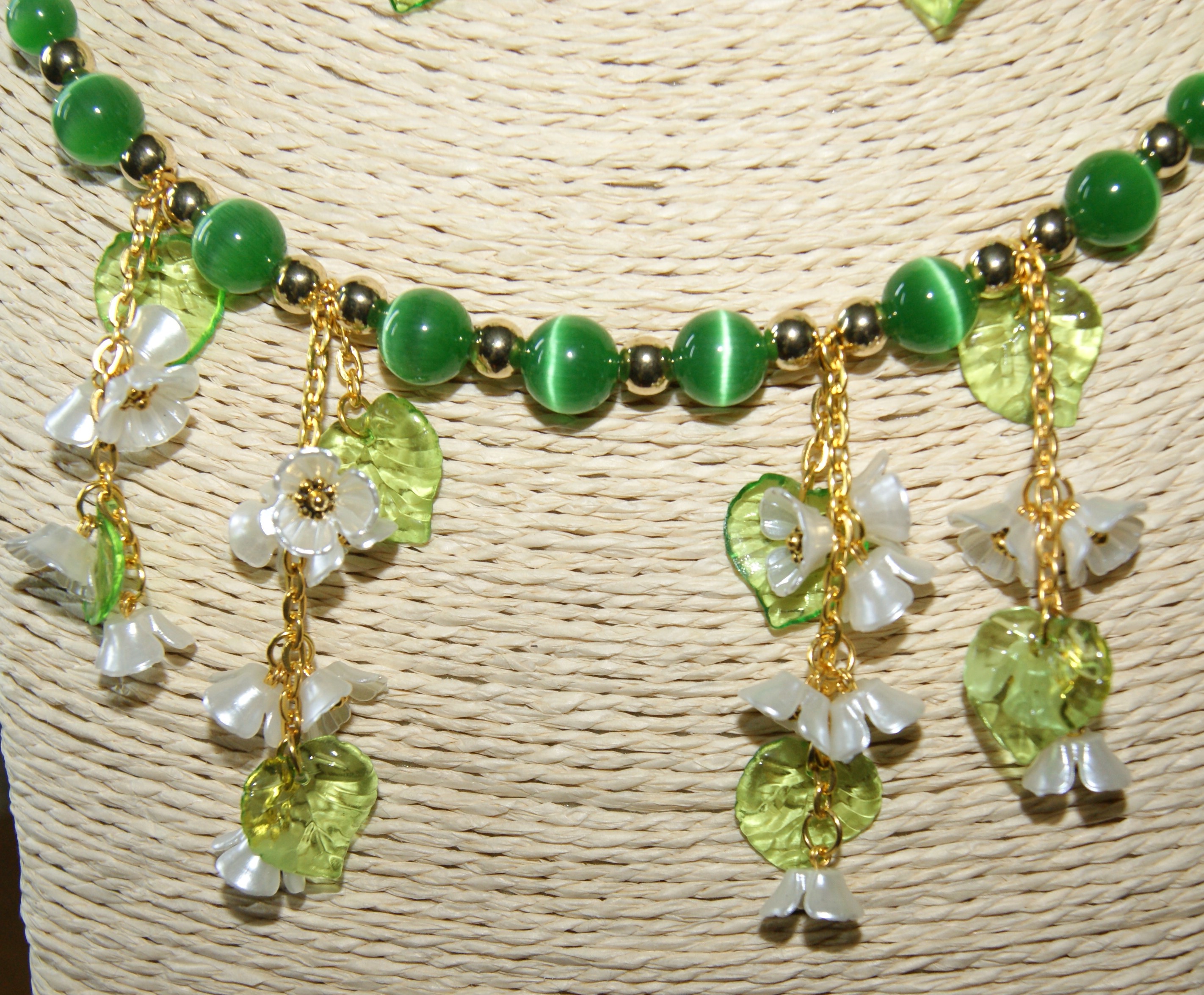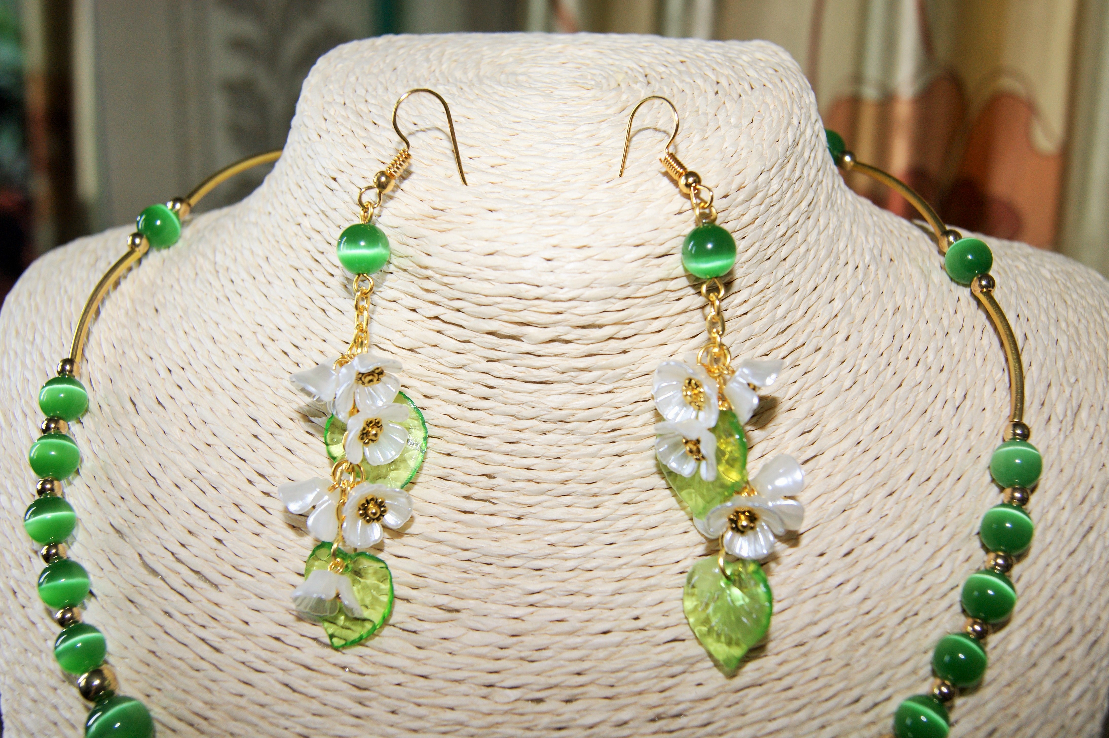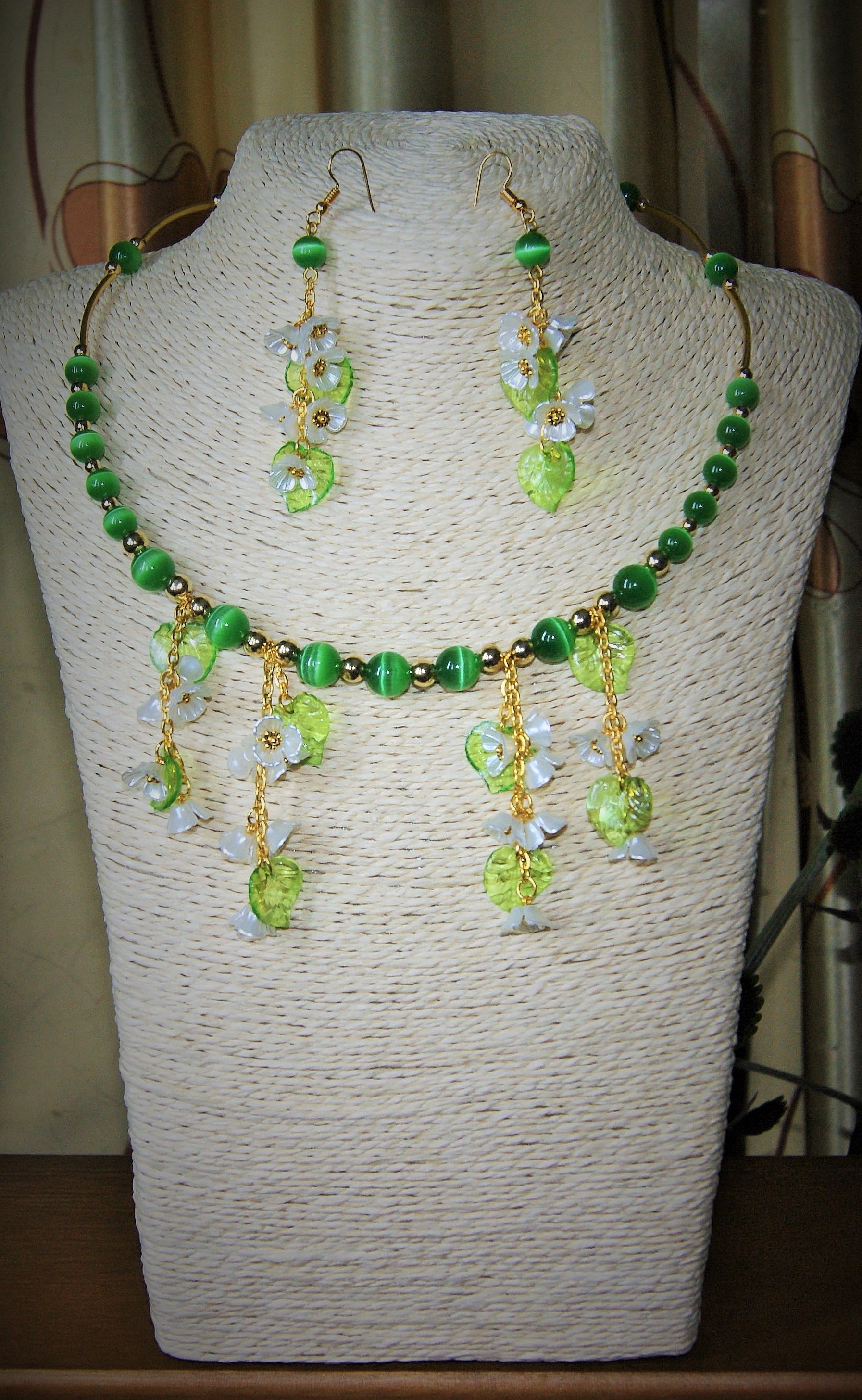 Комплект бижутерии, состоящий из ожерелья и пары серёг. В ожерелье использованы бусины зелёные – кошачий глаз качество АААА, 8 мм и 10 мм; бусины-разделители в виде трубочек и круглые 4 и 6 мм; белые цветы черёмухи и зелёные прозрачные листочки из акрила. Фурнитура (швензы, цепочка, пины, замок, соединительные кольца) под золото. Длина мемори-проволоки 47 см.