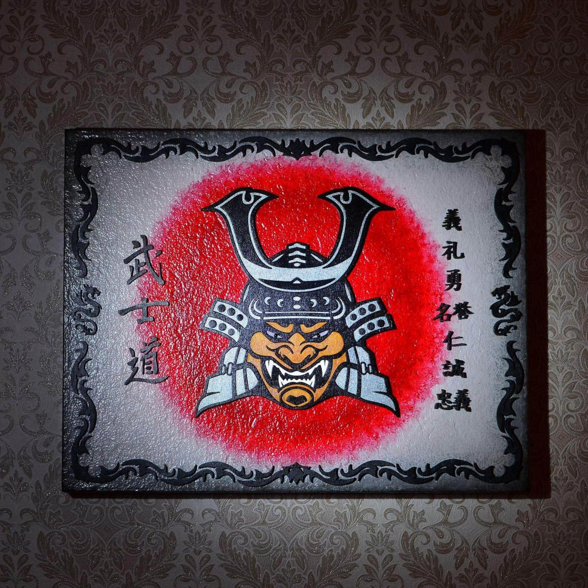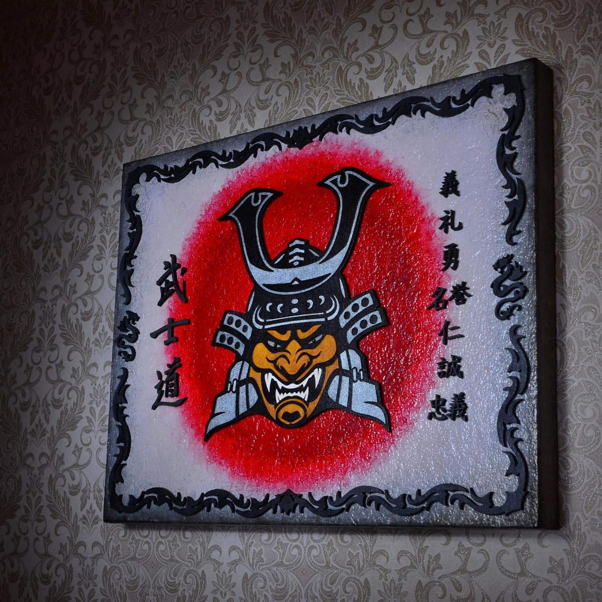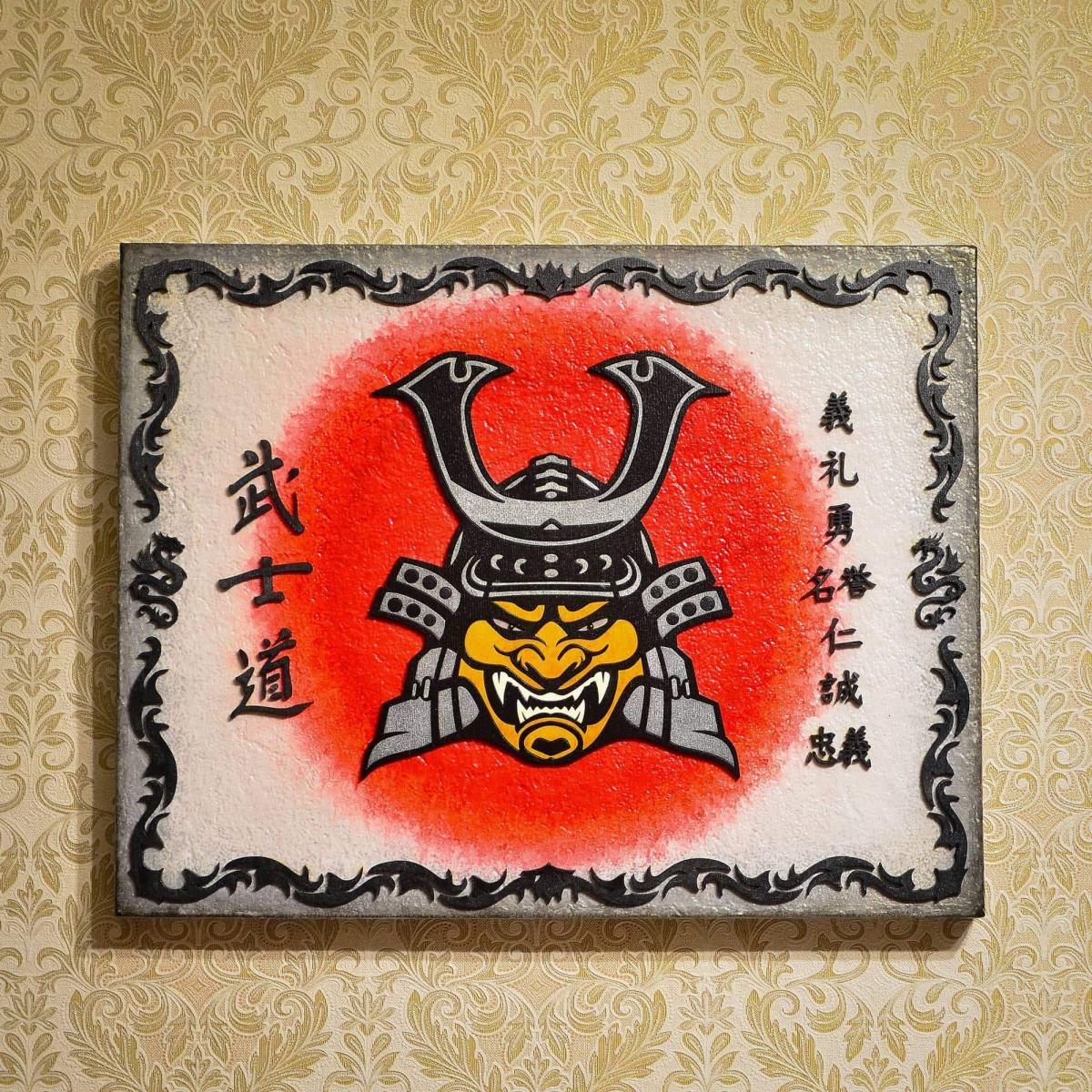 Панно демонстрирует классический и даже клишированный образ самурая, включающий в себя тяжелый шлем кабуто с характерной маской - мэнгу.