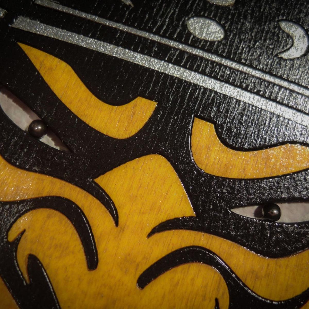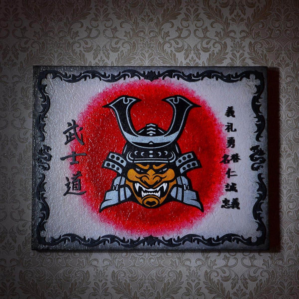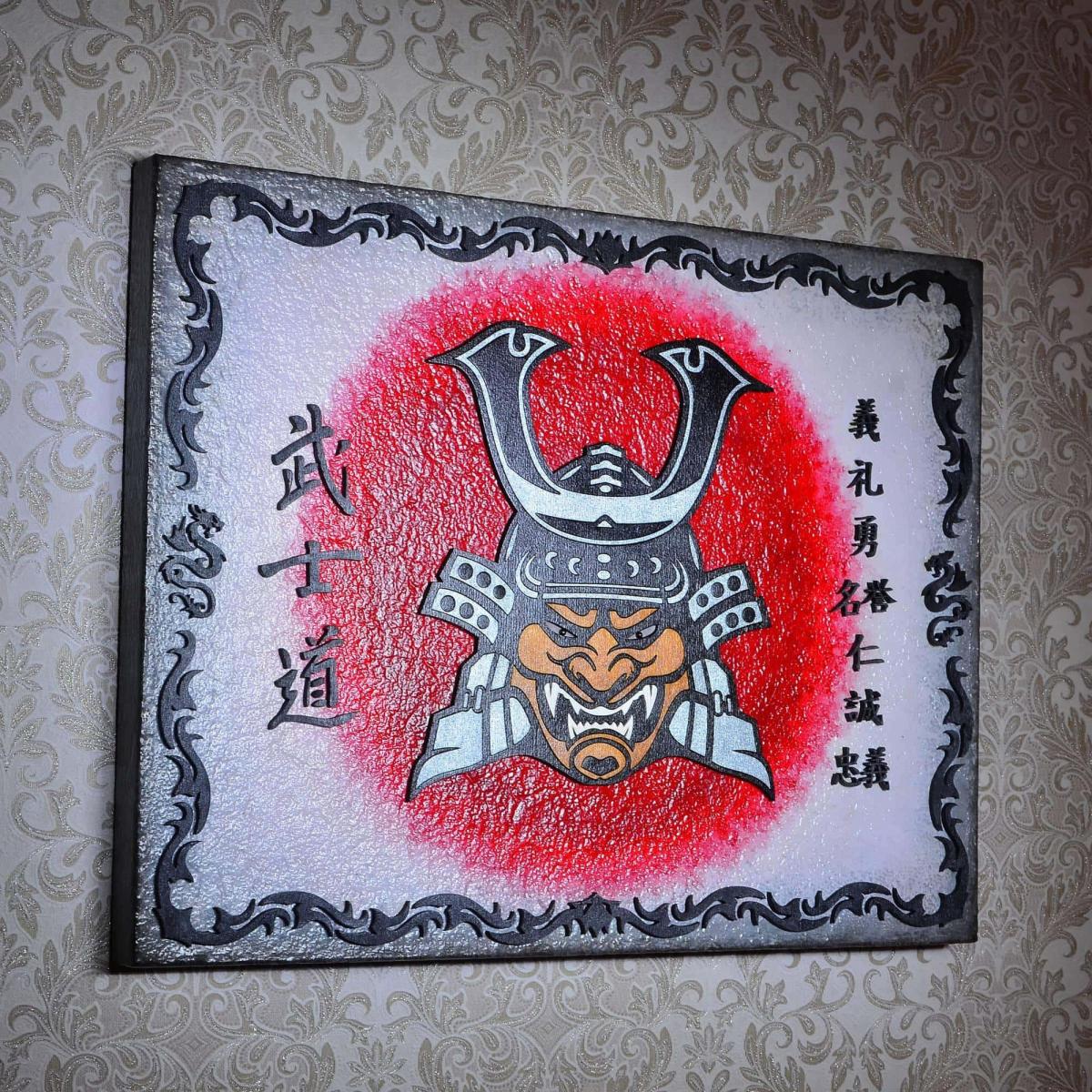 Панно демонстрирует классический и даже клишированный образ самурая, включающий в себя тяжелый шлем кабуто с характерной маской - мэнгу.