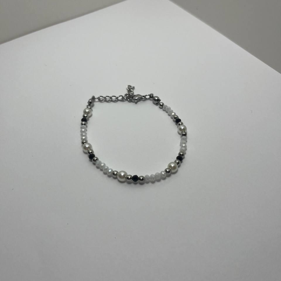 Сверкающий браслет на тросике из стеклянных бусин белого и черного цвета с добавлением жемчужных бусинок.