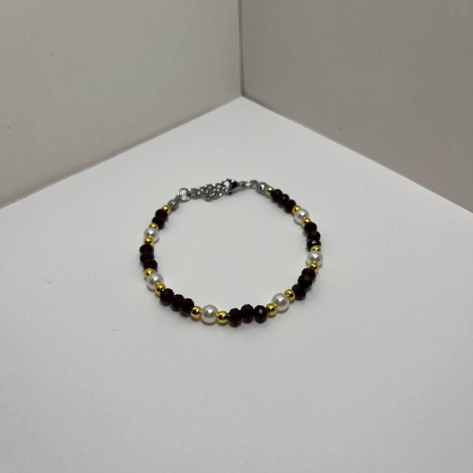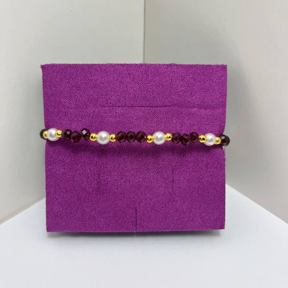 Элегантный бордово-золотой браслет на тросике из стеклянных и жемчужных бусин. Красиво сверкает на солнце и свету. Подойдёт как на праздник, так и на повседневное использование.