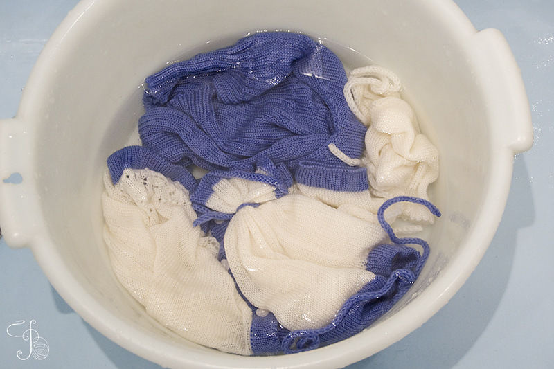 Берем нашу одежку, развязываем завязочки, если они есть, и погружаем в воду. Оставляем не более чем на 5 минут.