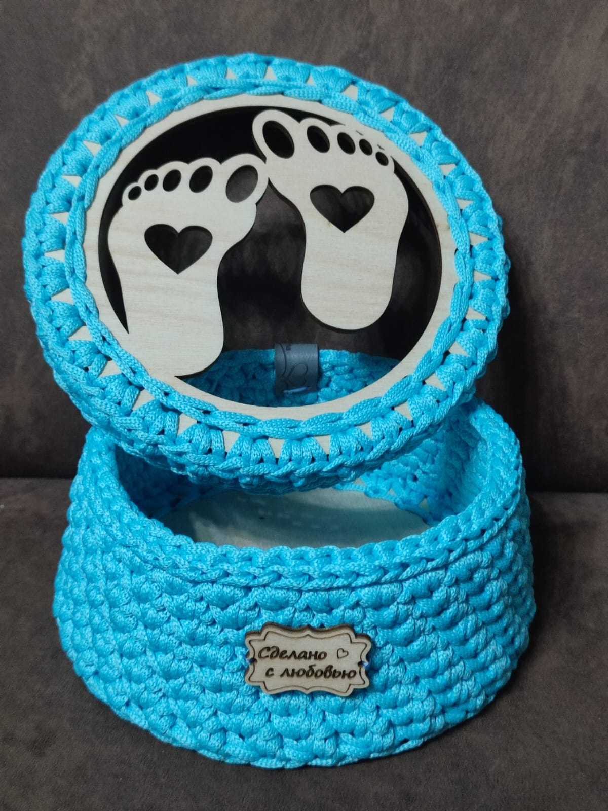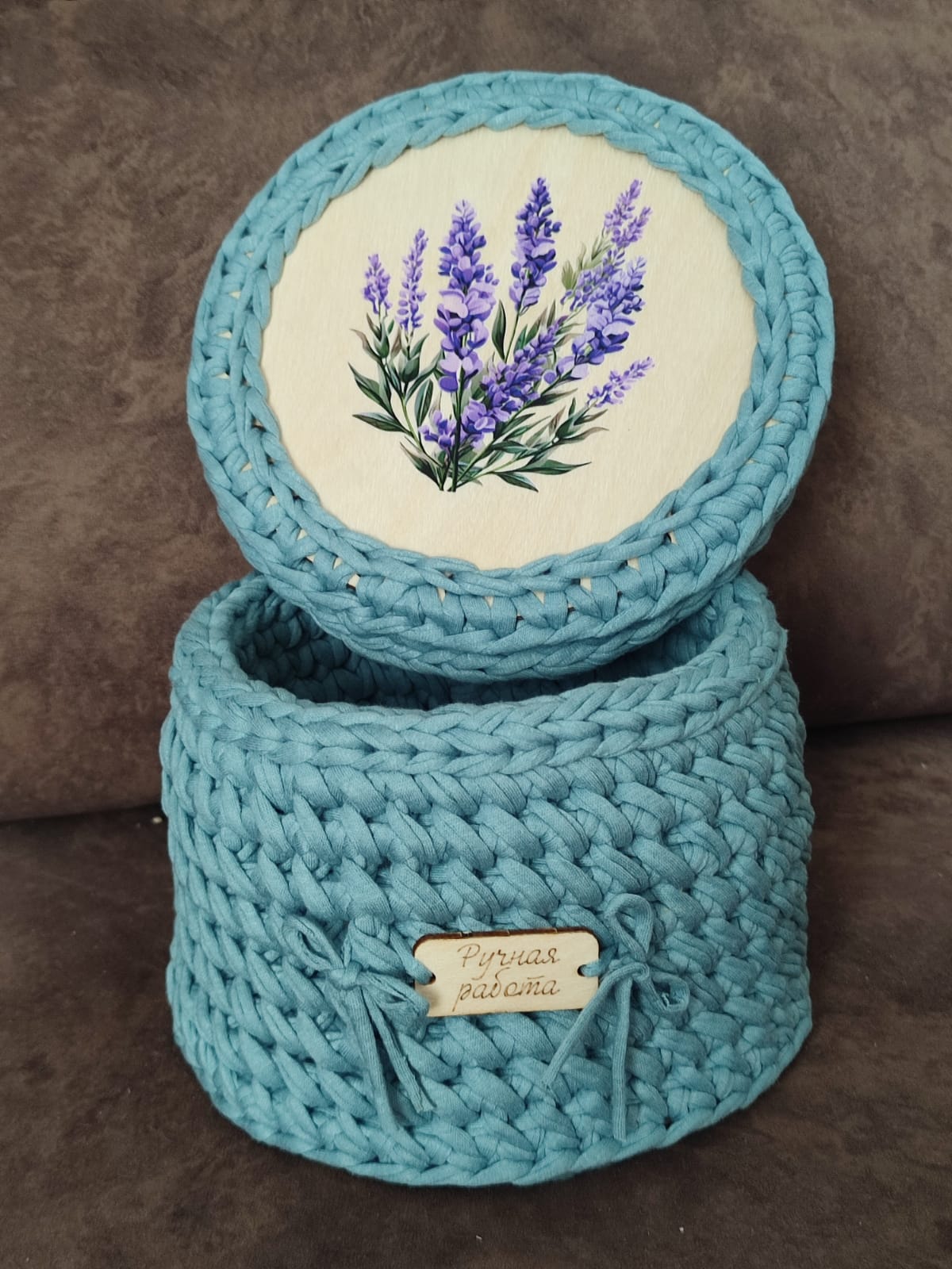 Корзинка ручной работы вязанная из шнура с деревянным дном и крышкой
