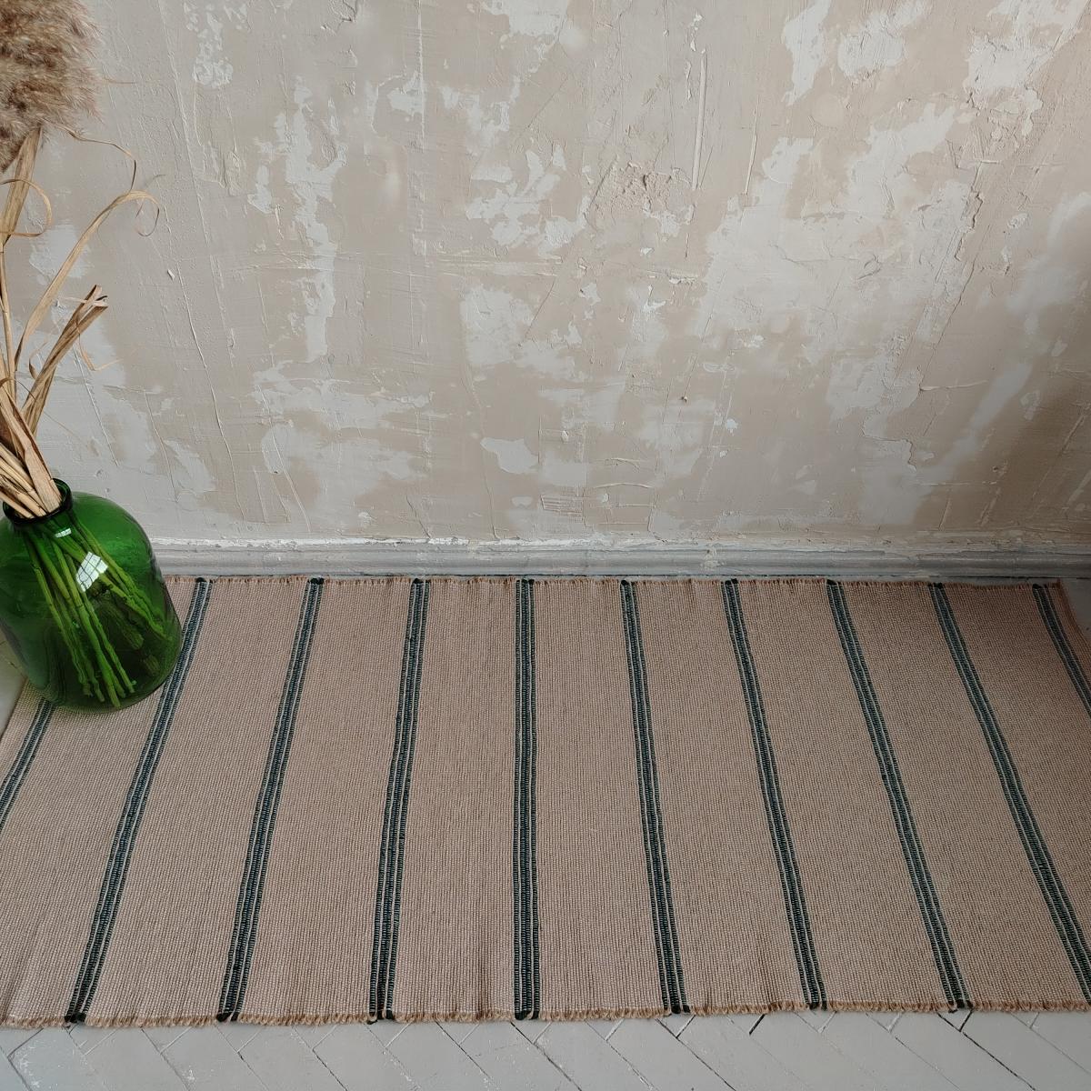Дорожка сделана из джута и вставок из хлопковой ткани. Ткань режется на полоски 6 см шириной. затем скручивается в плотный жгут, что дополнительно укрепляет изделие. Основа станка 466 нитей на 70 см.