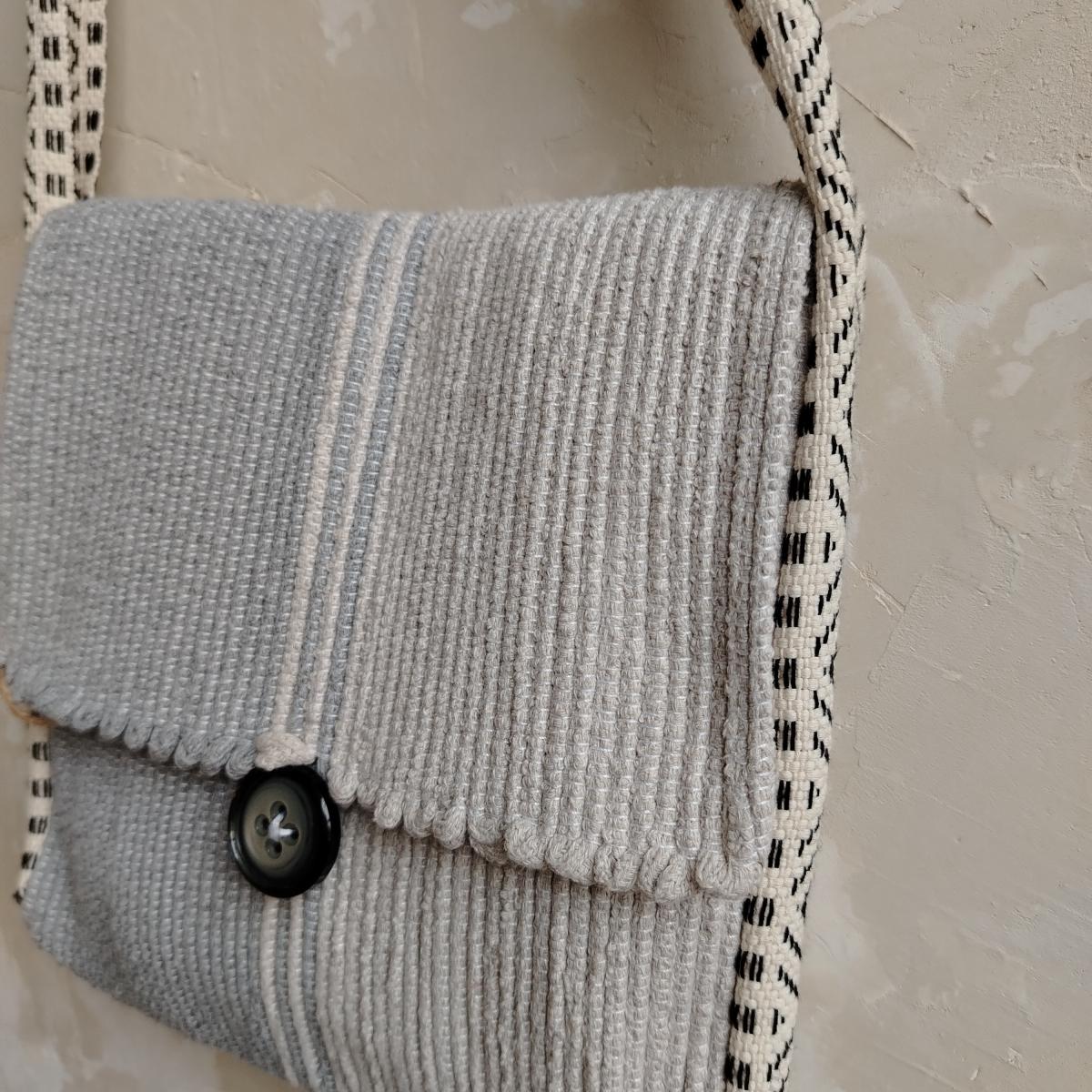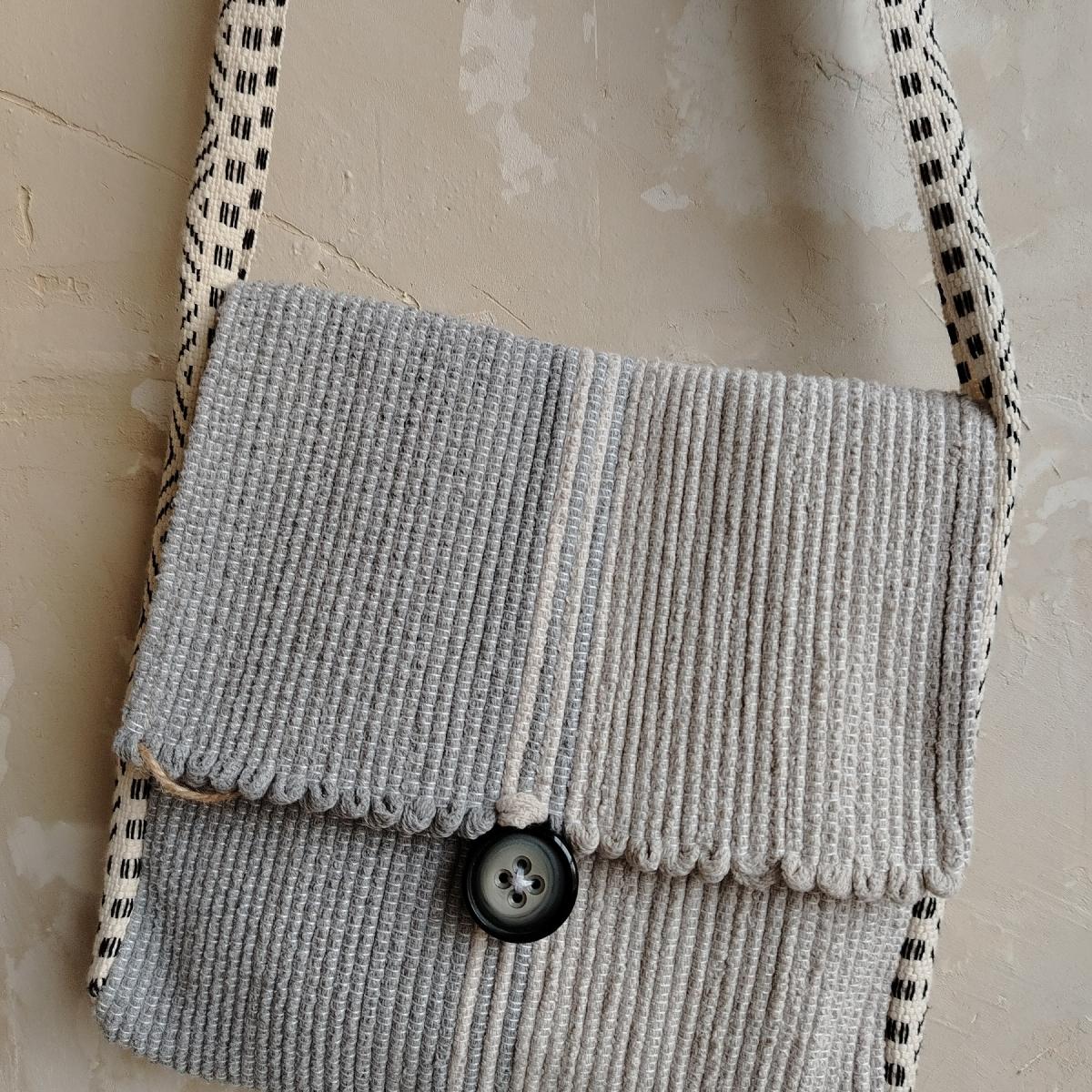 Сумка через плечо, сшитая из полотна, сотканного на ручном ткацком станке из тонких хлопковых шнуров.