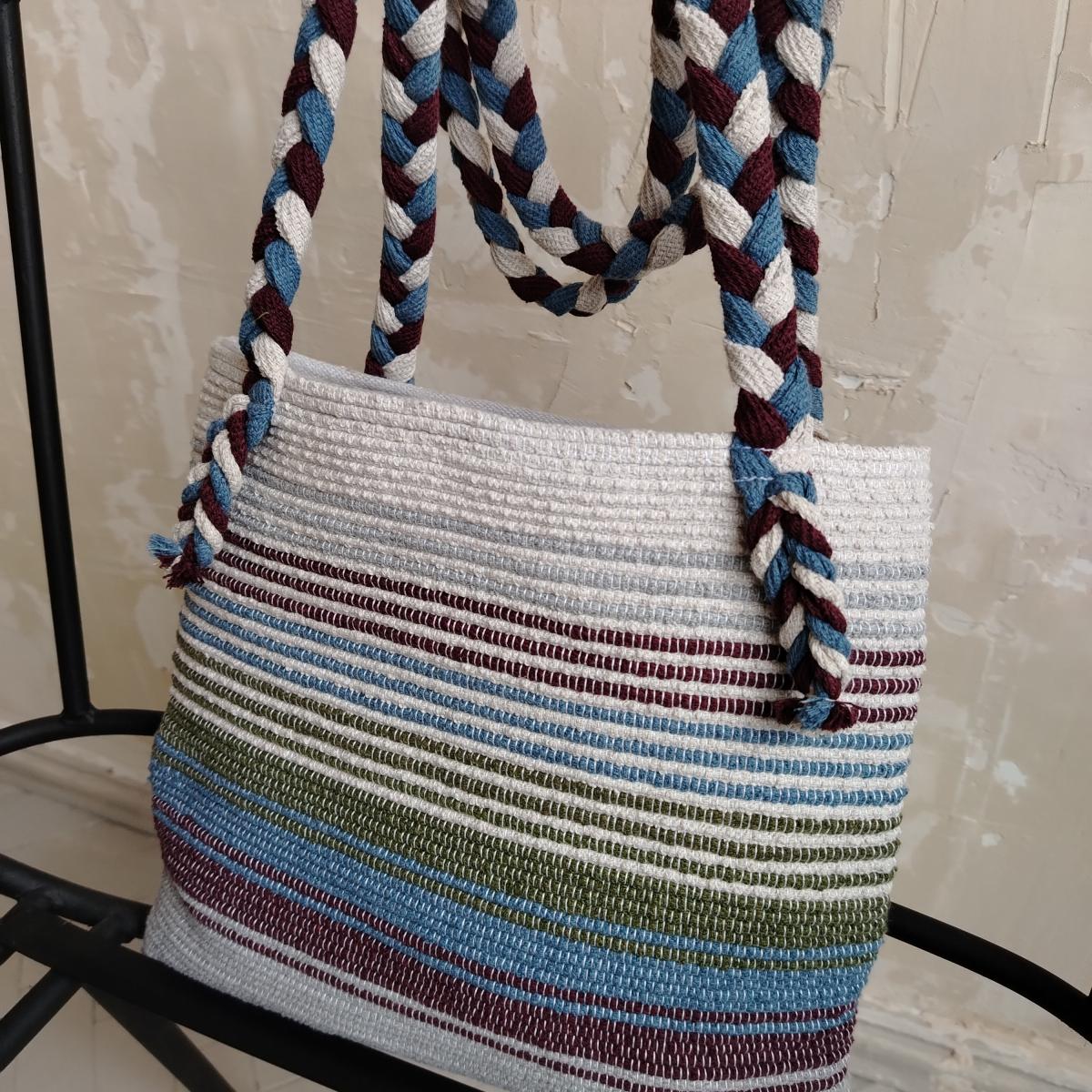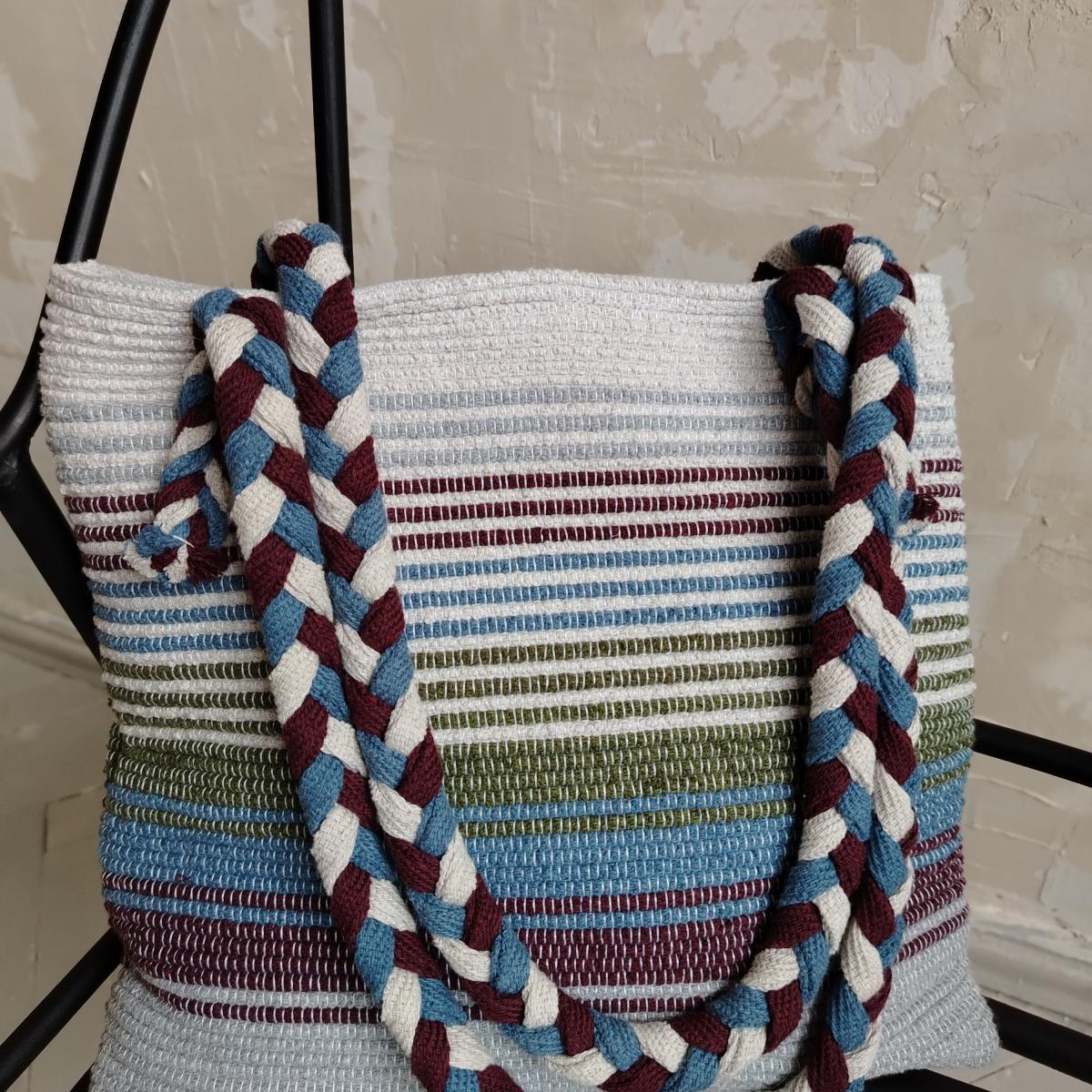 Сумка соткана на ручном ткацком станке из хлопковых шнурков.