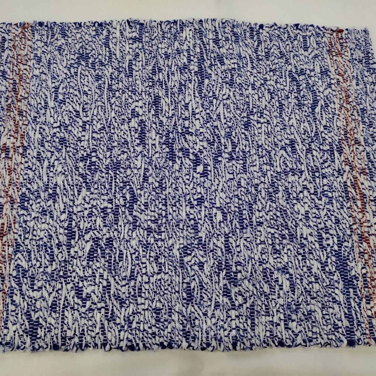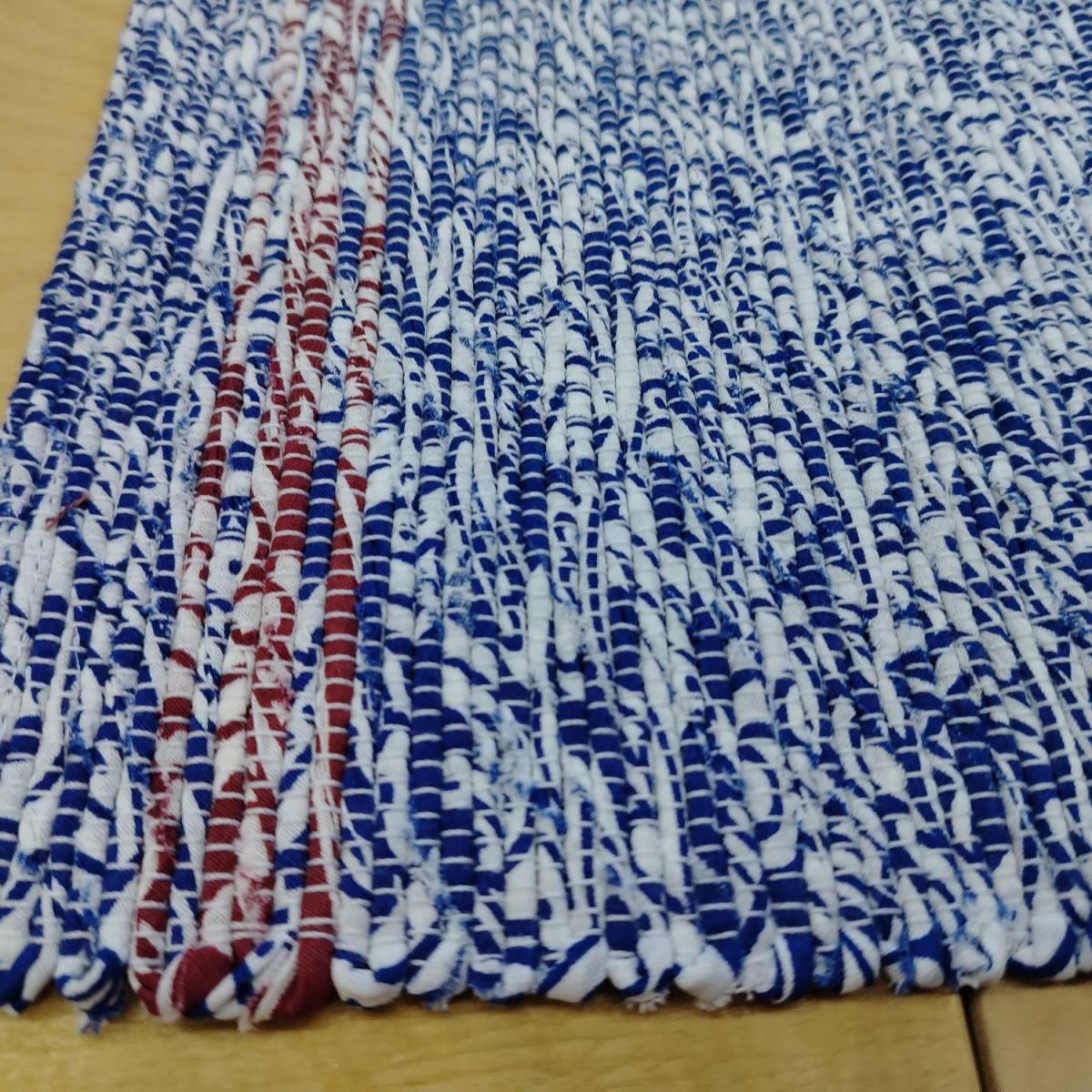 Ткань режется на полоски 3 см шириной, затем скручивается в плотный жгут, что дополнительно укрепляет изделие. Основа станка 466 нитей на 70 см.
