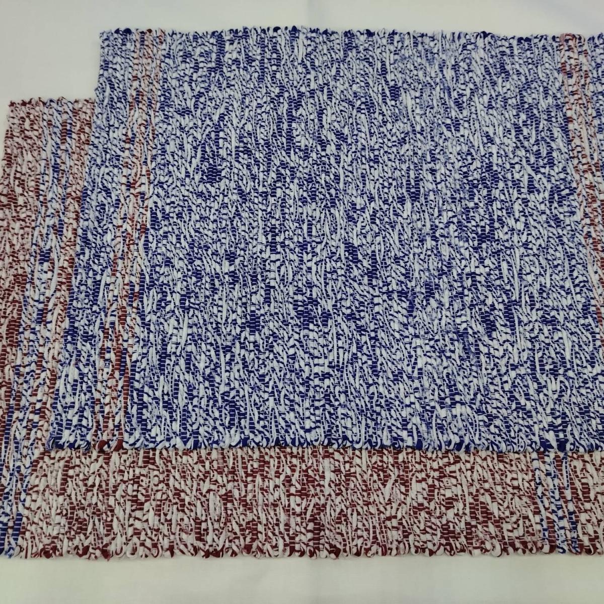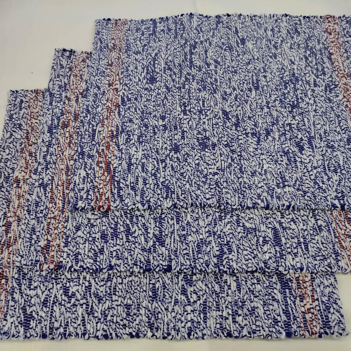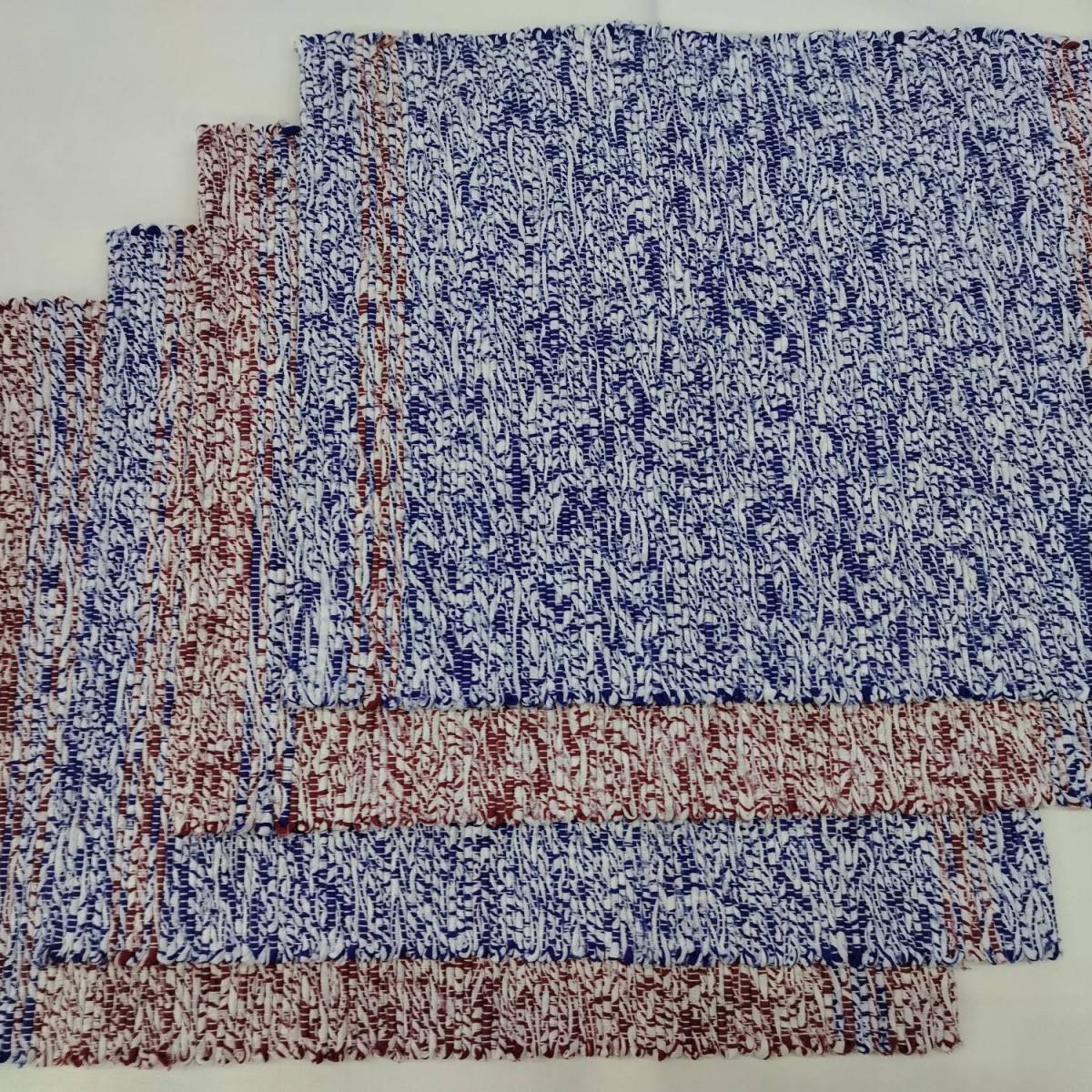 Салфетки, сотканные на ручном ткацком станке из хлопковой ткани в синем, красном и малиновом цвете.